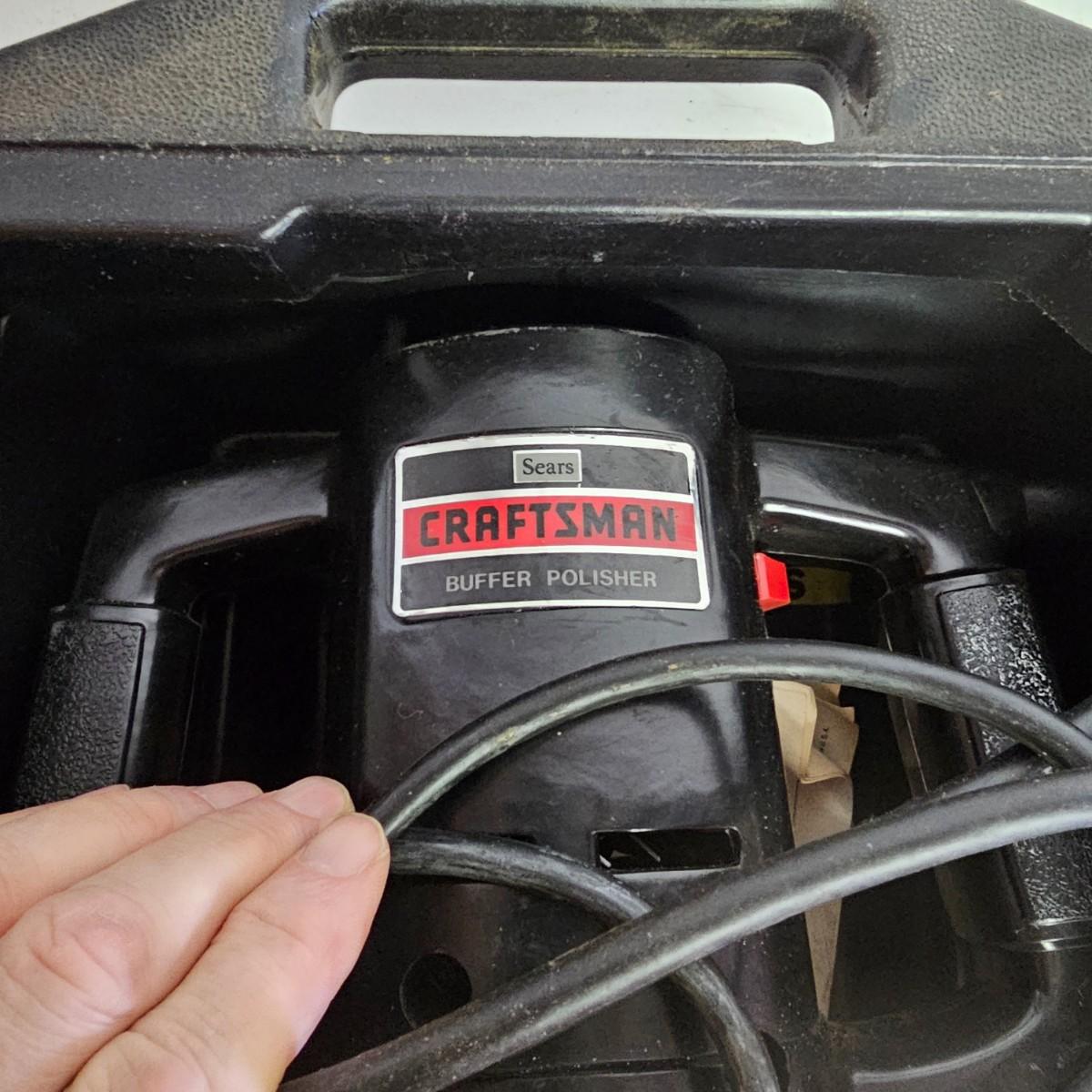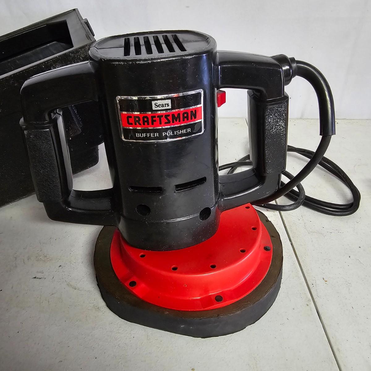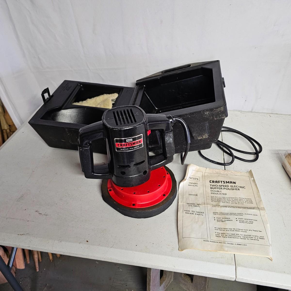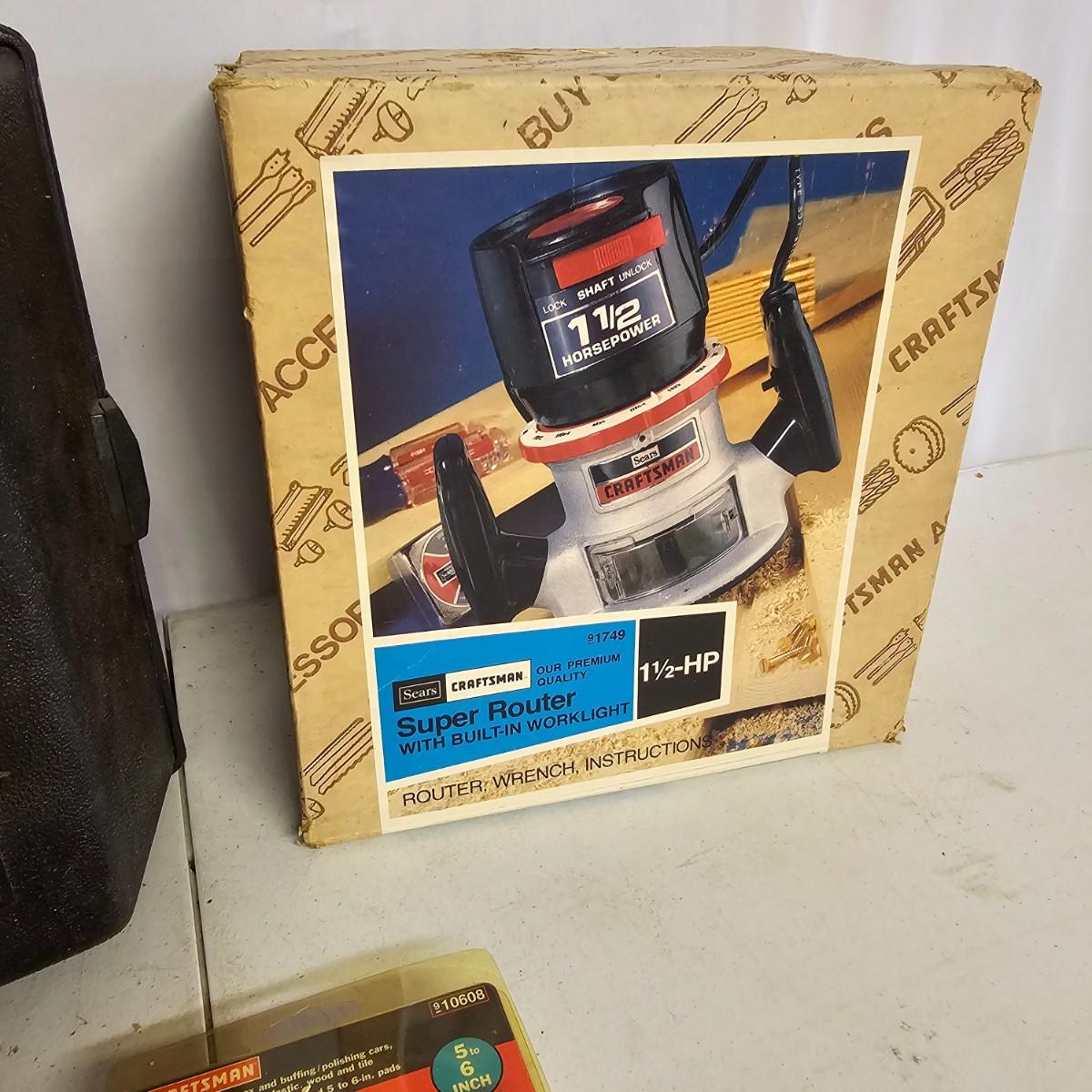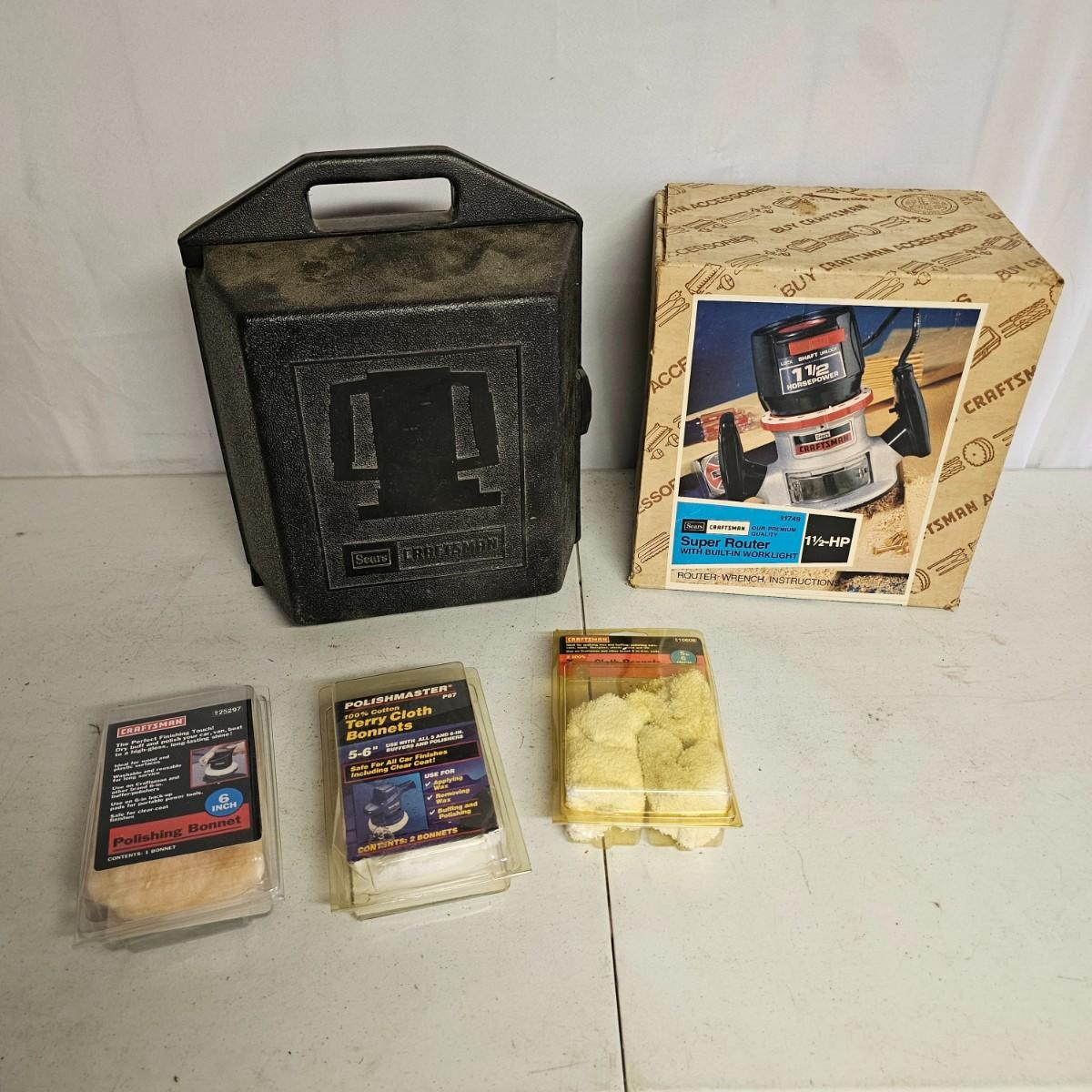 A pair of Craftsman hand power tools, one 10" buffer polisher and one 1.5hp super router. Both items in original boxes and both powered on when plugged. Buffer has hardshell case and some extra bonnet, measures 9" x 7" x 9.5"H. Router does not come with any bits is 9" x 7" x 9.5"H. Instruction manuals with each. See photos for details. Shipping available.
