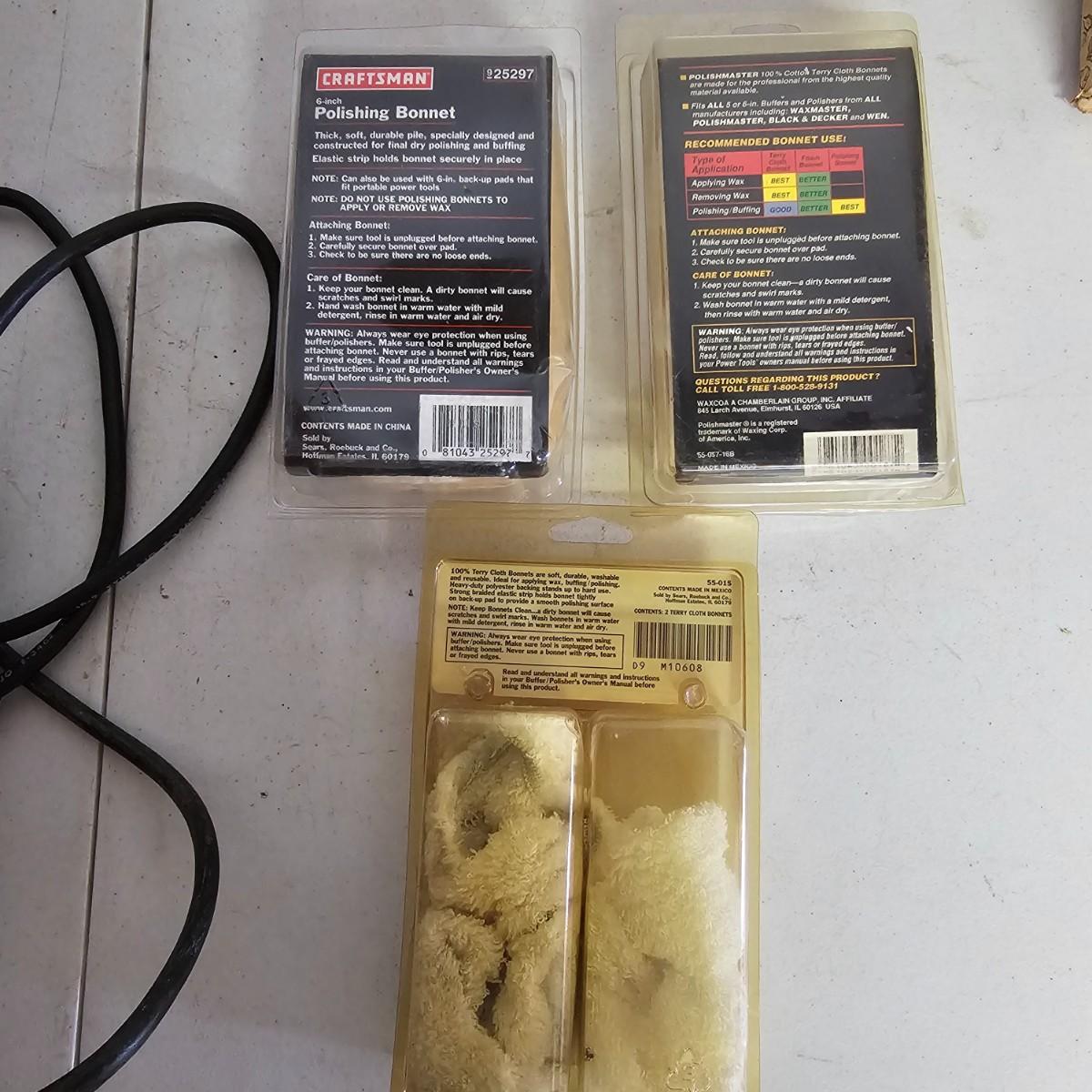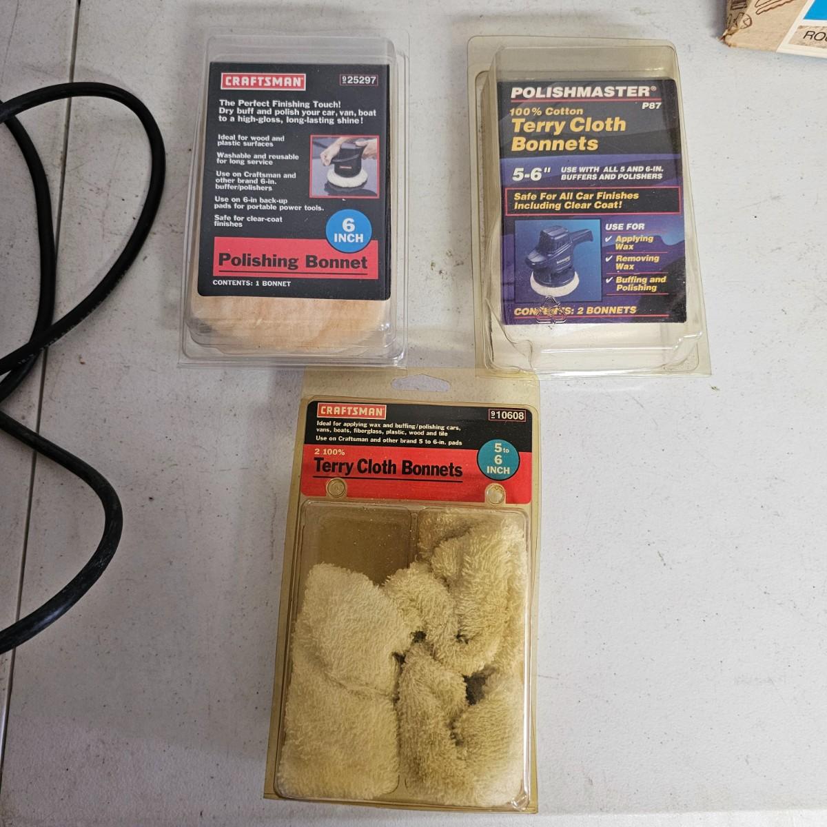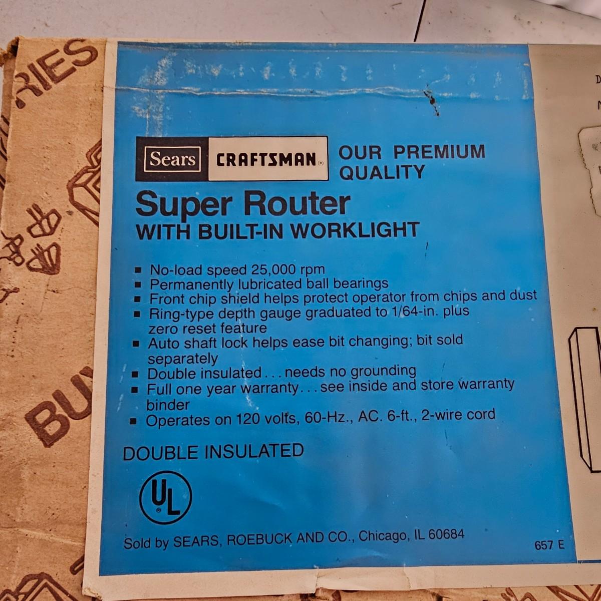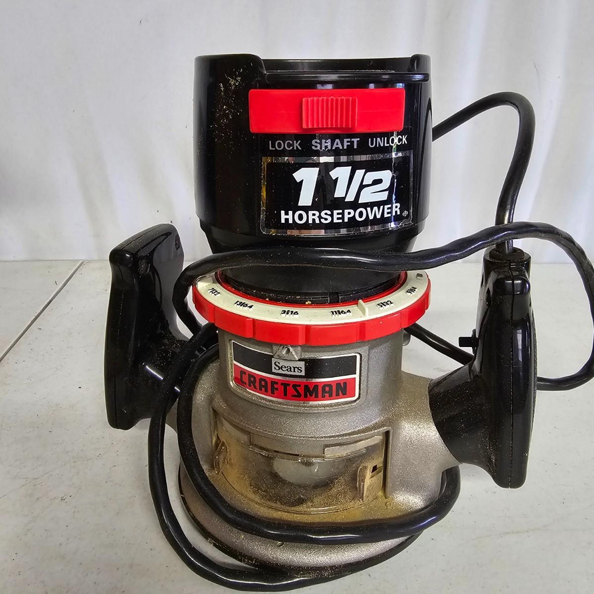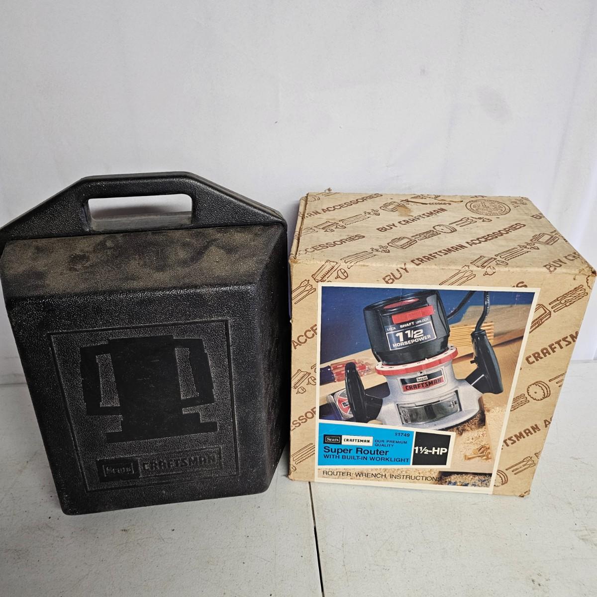 A pair of Craftsman hand power tools, one 10" buffer polisher and one 1.5hp super router. Both items in original boxes and both powered on when plugged. Buffer has hardshell case and some extra bonnet, measures 9" x 7" x 9.5"H. Router does not come with any bits is 9" x 7" x 9.5"H. Instruction manuals with each. See photos for details. Shipping available.