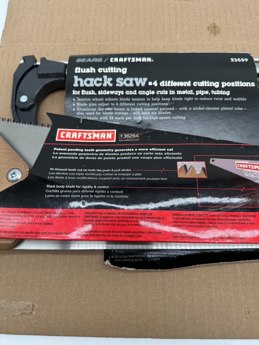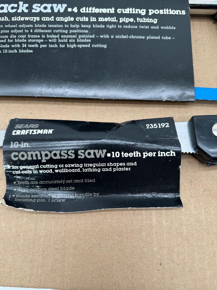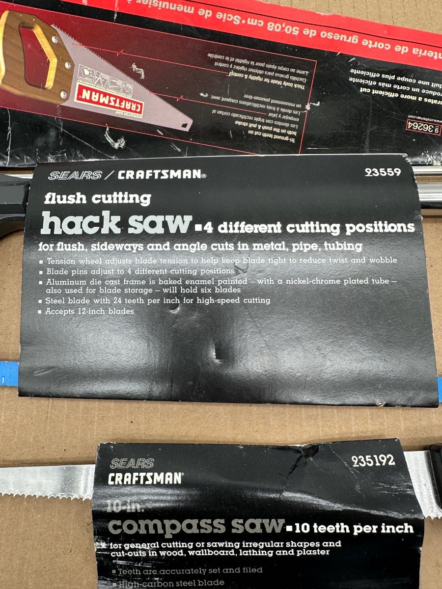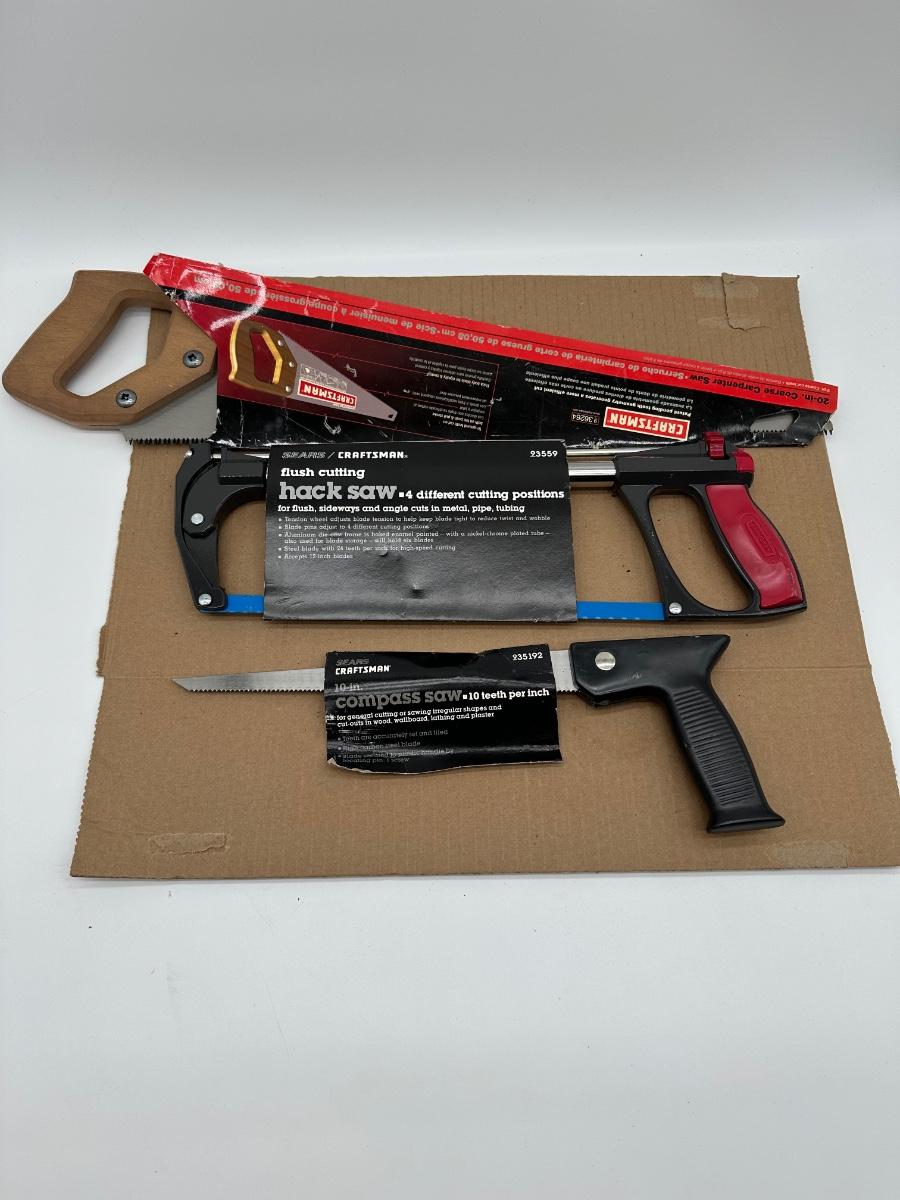 Lot of three Craftsman hand saws, including a flush-cut hack saw with adjustable blade positions, a 10″ compass saw (10 TPI), and a traditional wood hand saw with wooden handle. Original Sears/Craftsman packaging sleeves included (showing model info and features). Solid shop or resale lot with versatile cutting options for metal, pipe, tubing, wood, drywall, and irregular cuts.