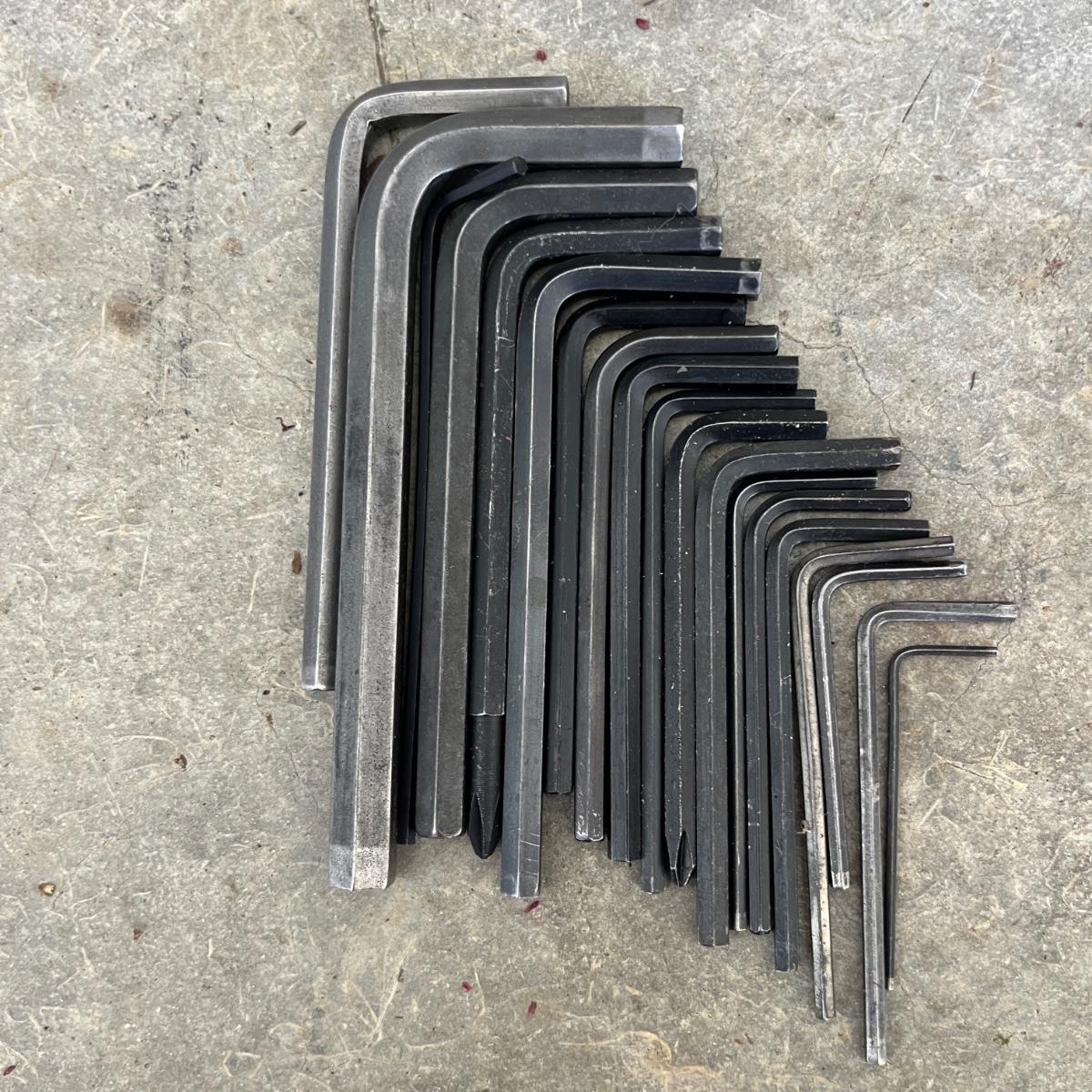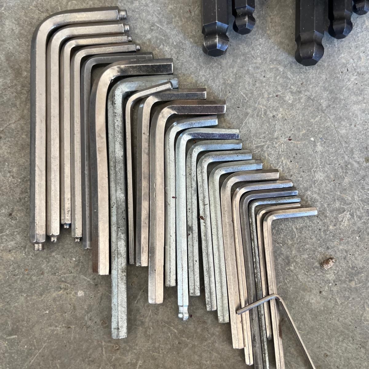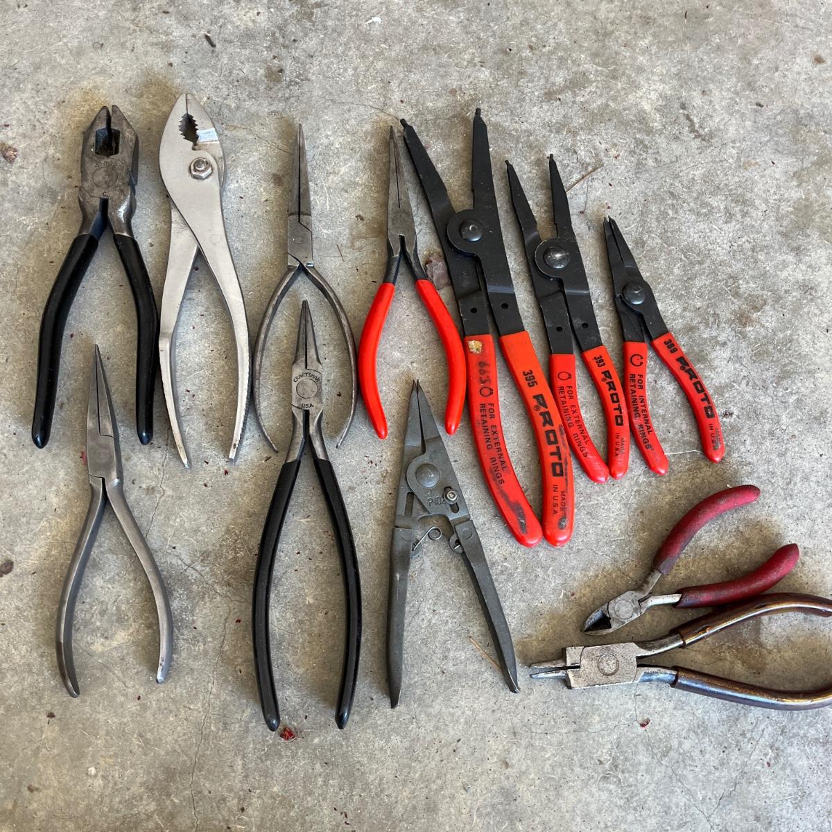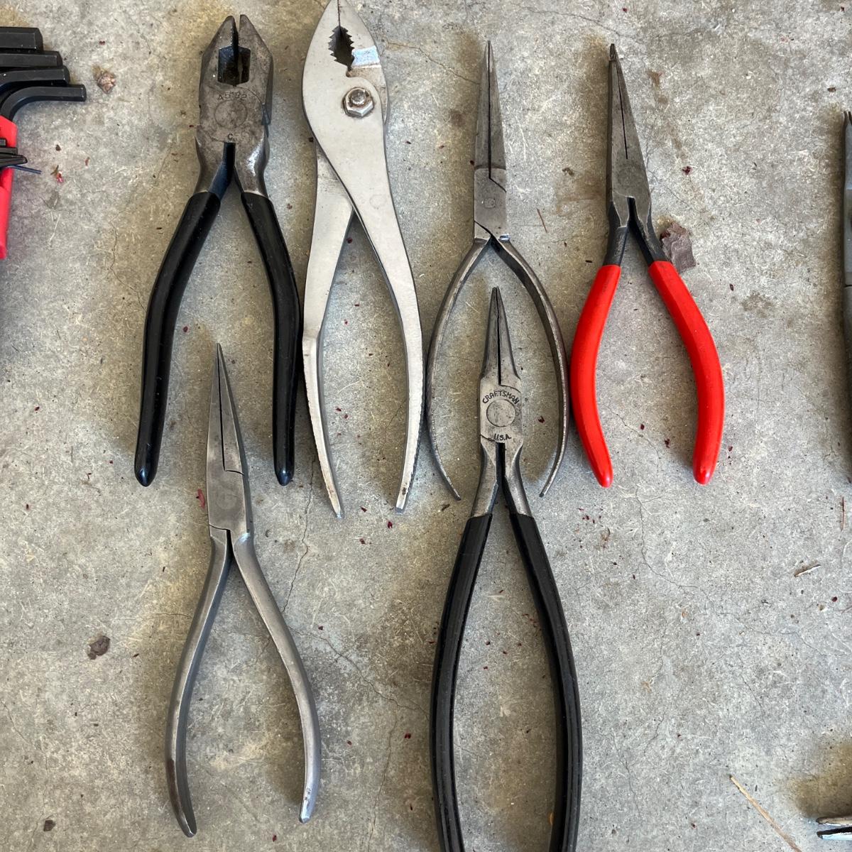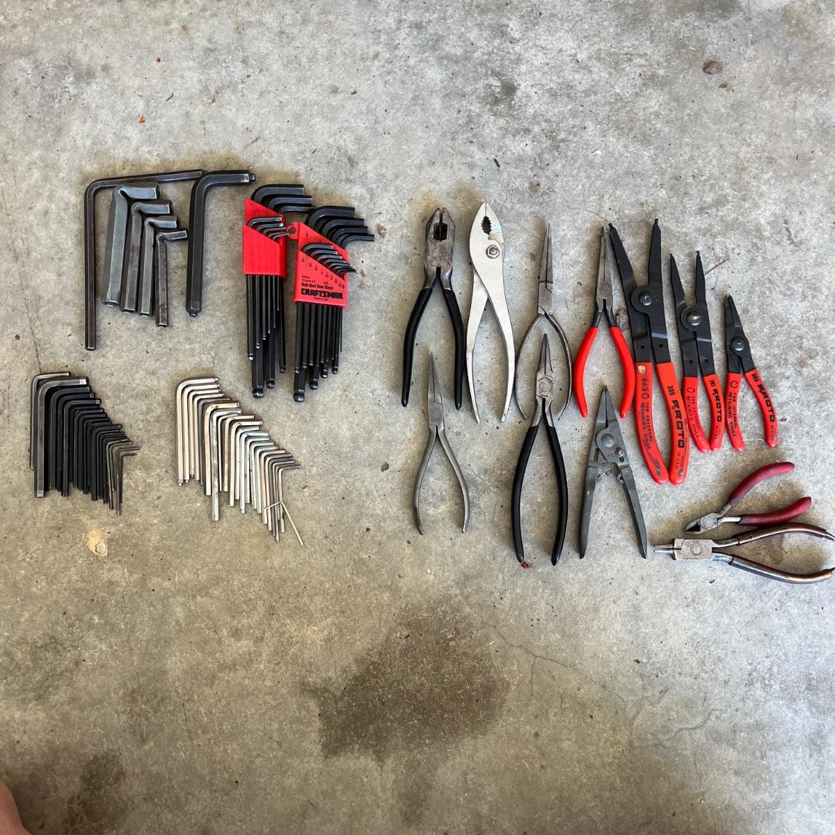 Lot includes Craftsman and unmarked hex keys, Proto inner and outer ring pliers, needle nose pliers and more pliers. Longest pliers measure 9”long.