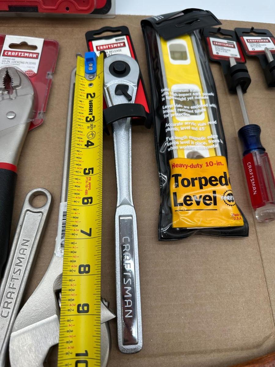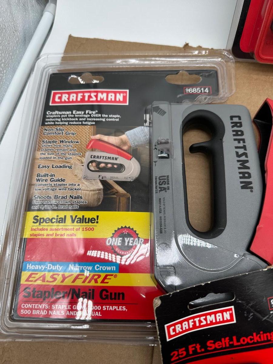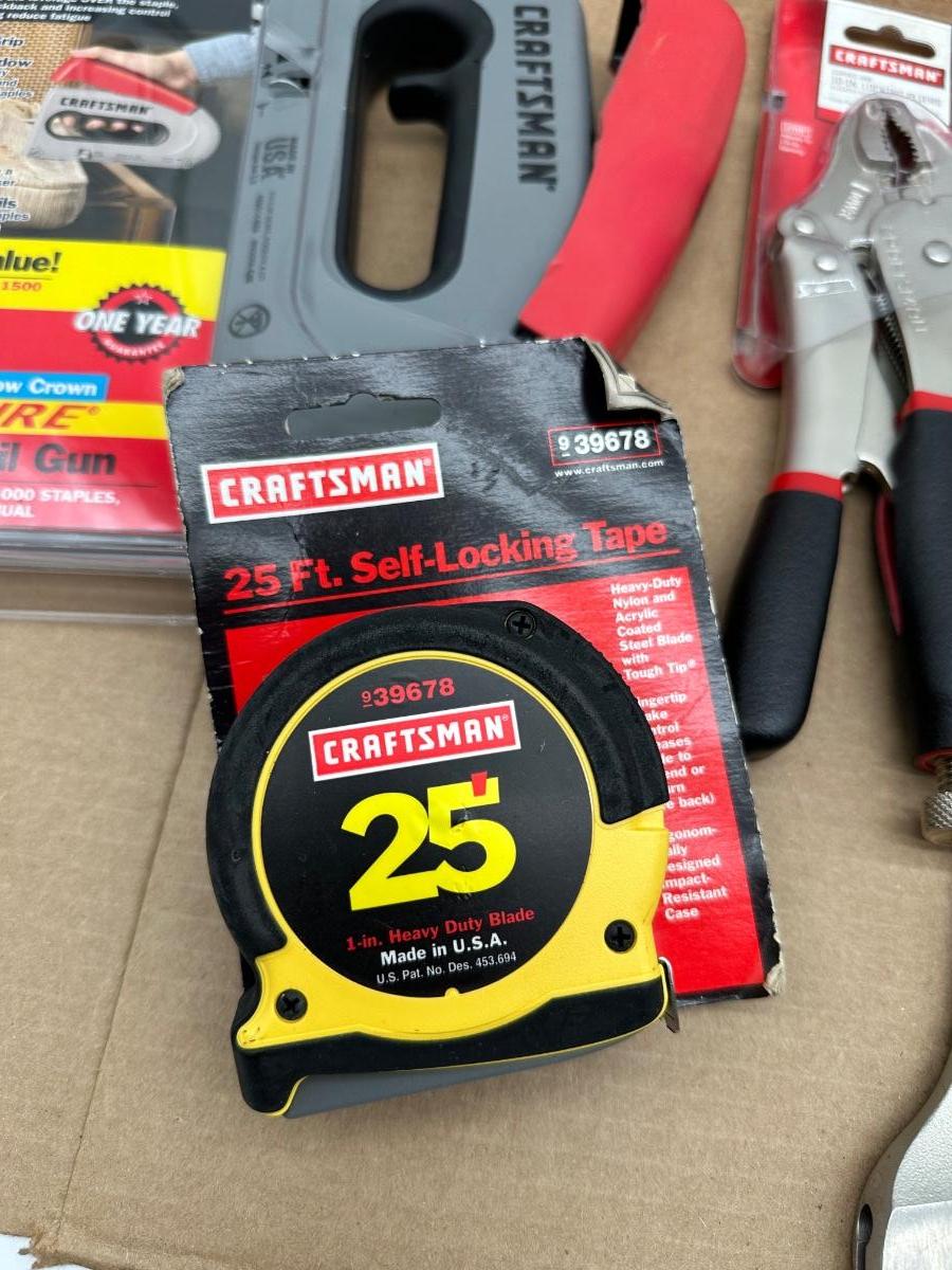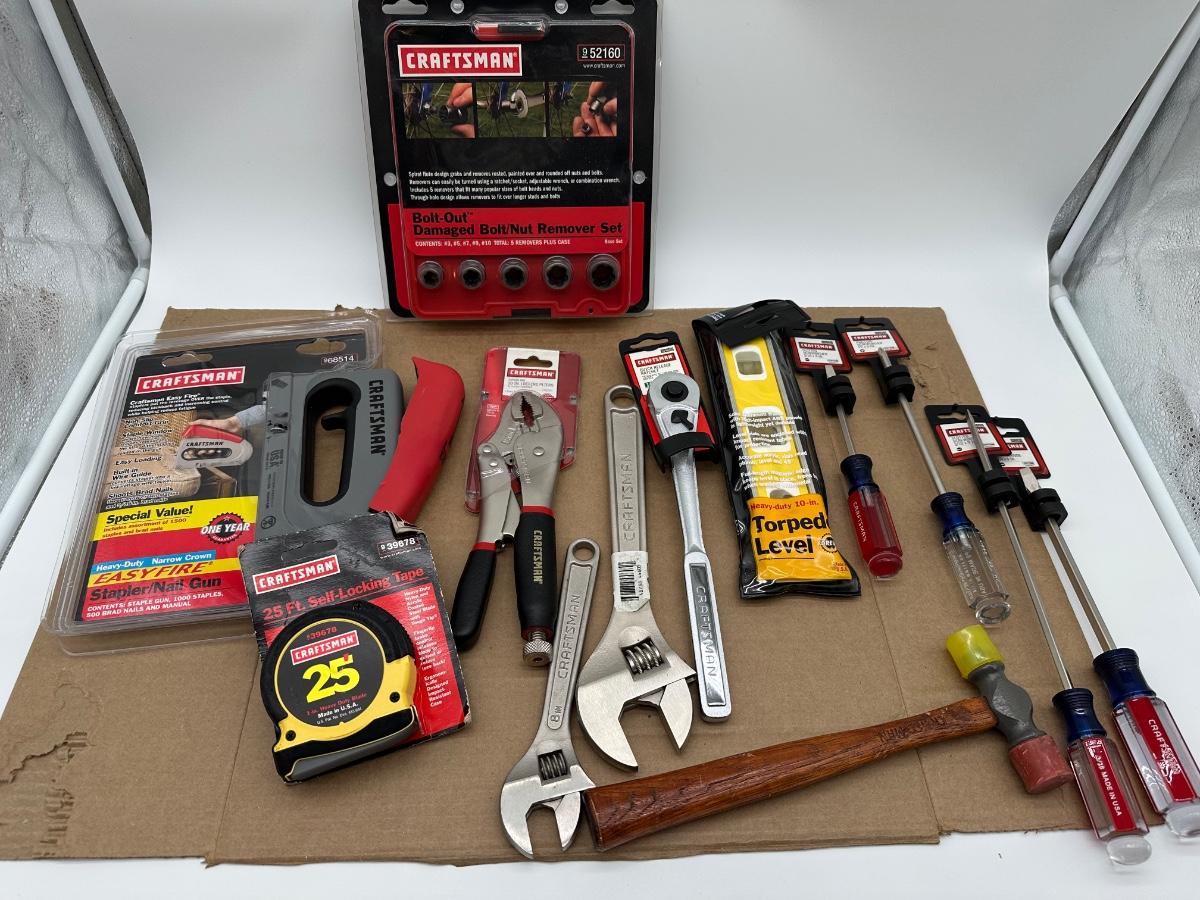 Mixed Craftsman tool lot with a combination of new-in-package and lightly used tools. Includes a Bolt-Out damaged bolt/nut remover set, Easy-Fire staple/nail gun, 10-in locking pliers, adjustable wrenches, ratchet, screwdrivers, 25-ft tape measure, torpedo level, and other shop essentials. Good all-around set for home, garage.