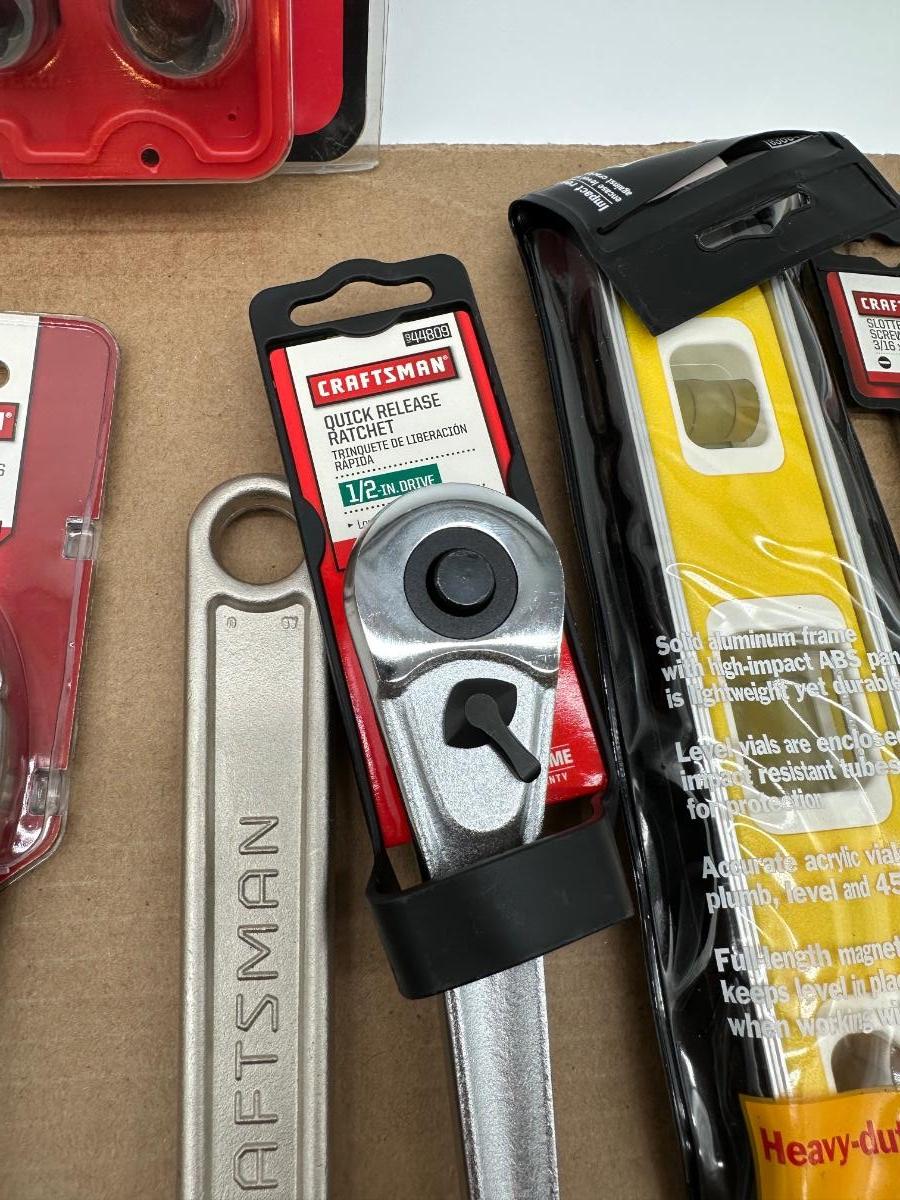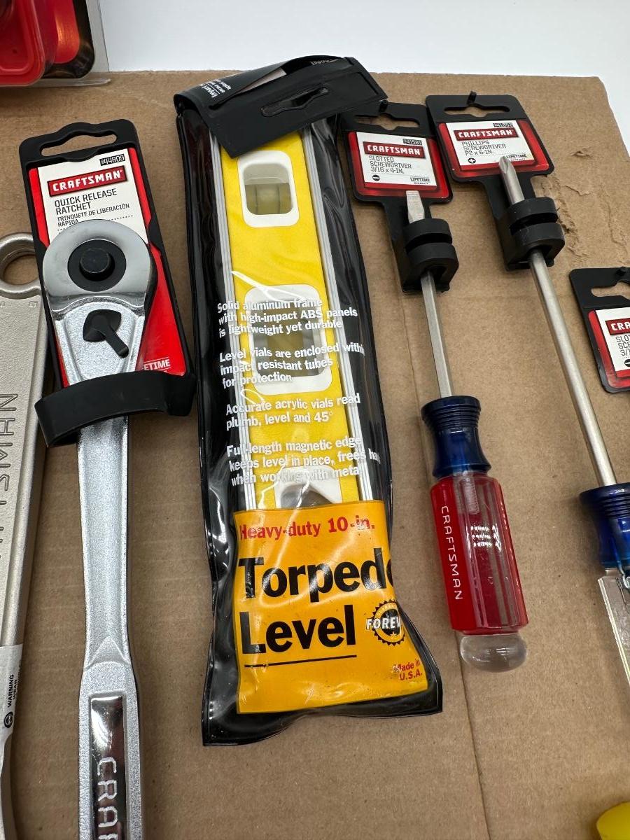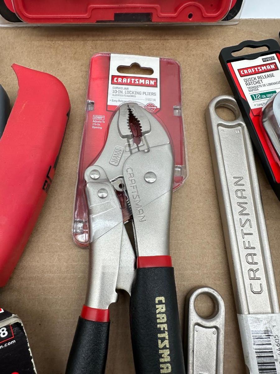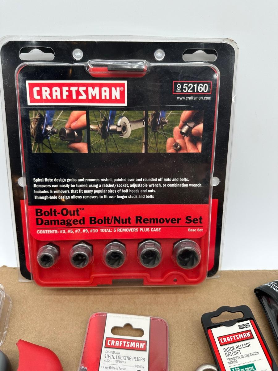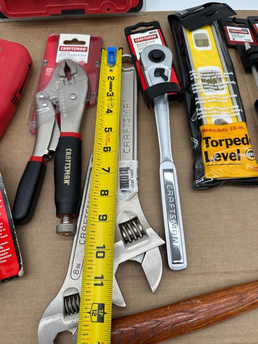 Mixed Craftsman tool lot with a combination of new-in-package and lightly used tools. Includes a Bolt-Out damaged bolt/nut remover set, Easy-Fire staple/nail gun, 10-in locking pliers, adjustable wrenches, ratchet, screwdrivers, 25-ft tape measure, torpedo level, and other shop essentials. Good all-around set for home, garage.