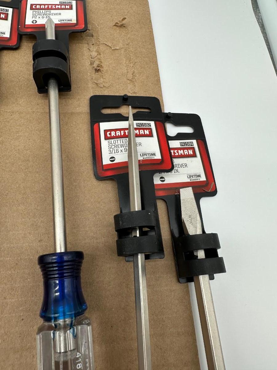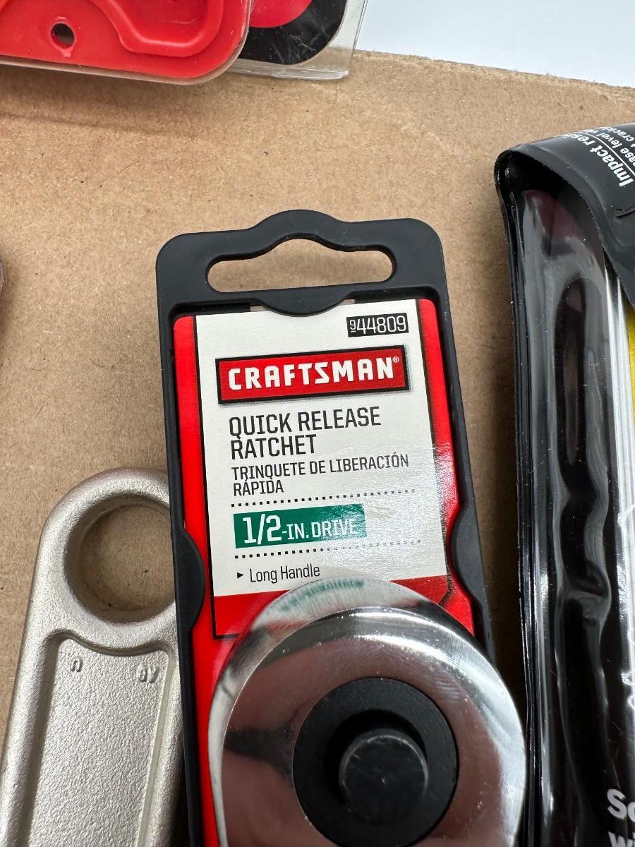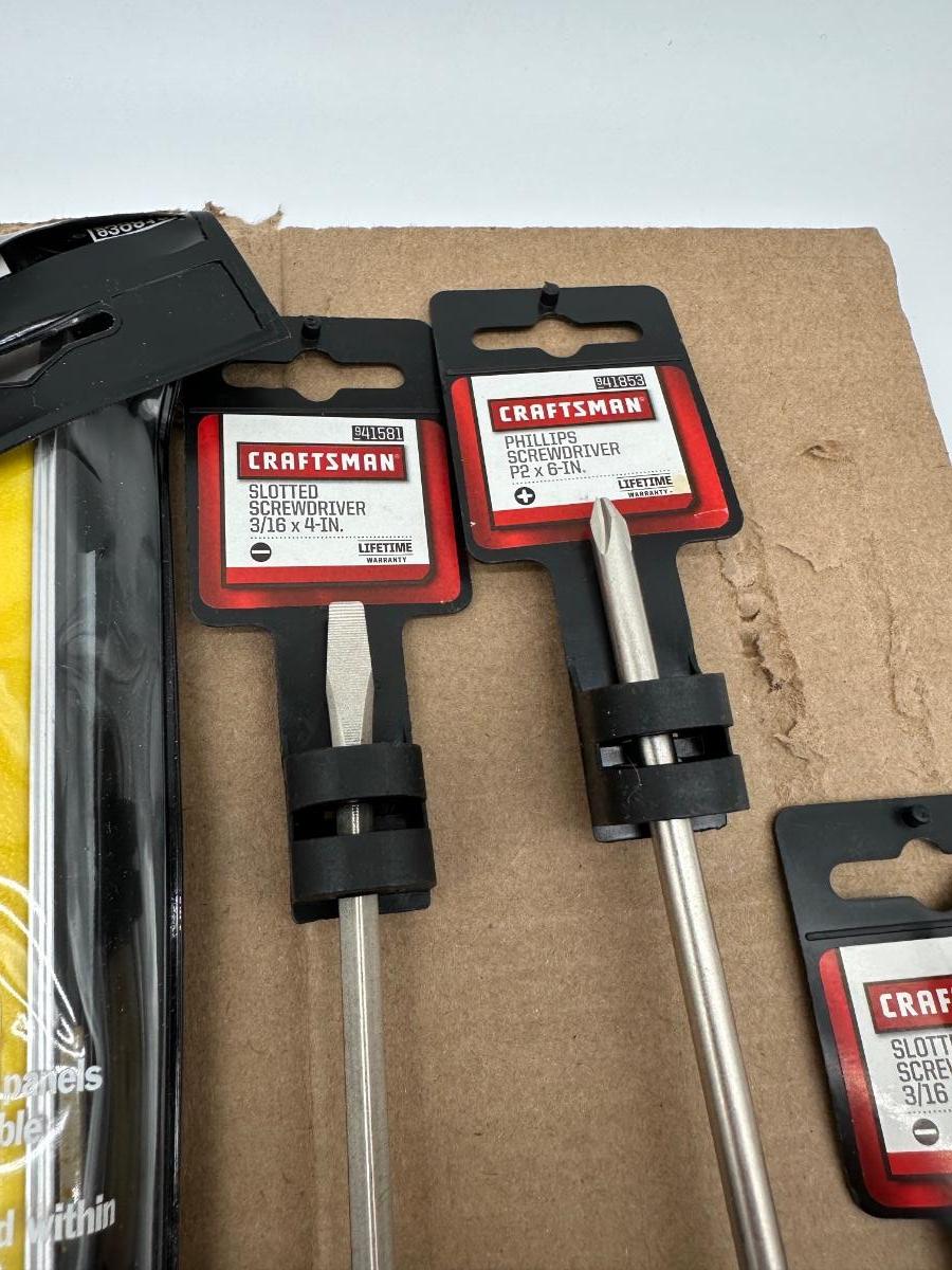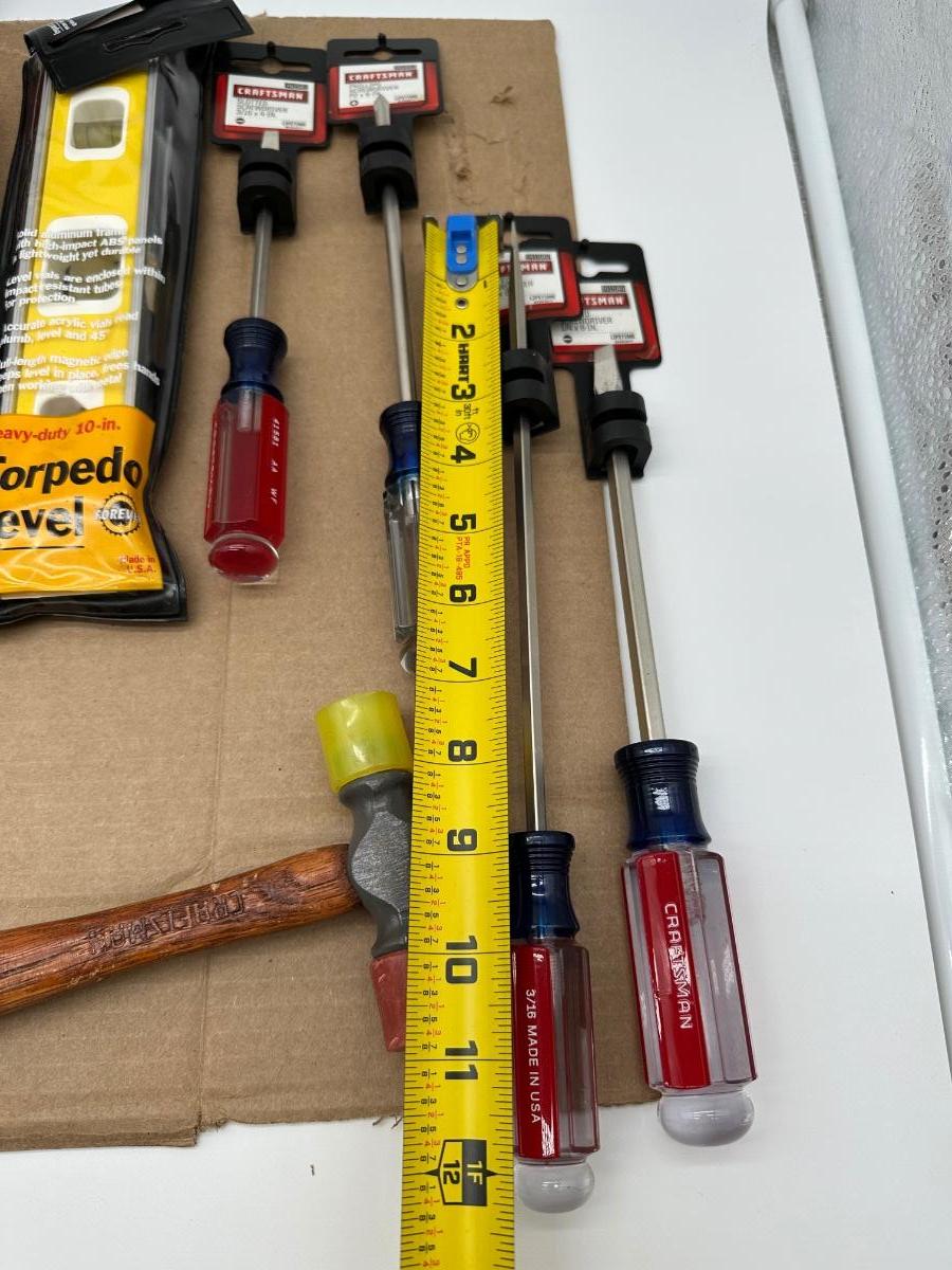 Mixed Craftsman tool lot with a combination of new-in-package and lightly used tools. Includes a Bolt-Out damaged bolt/nut remover set, Easy-Fire staple/nail gun, 10-in locking pliers, adjustable wrenches, ratchet, screwdrivers, 25-ft tape measure, torpedo level, and other shop essentials. Good all-around set for home, garage.
