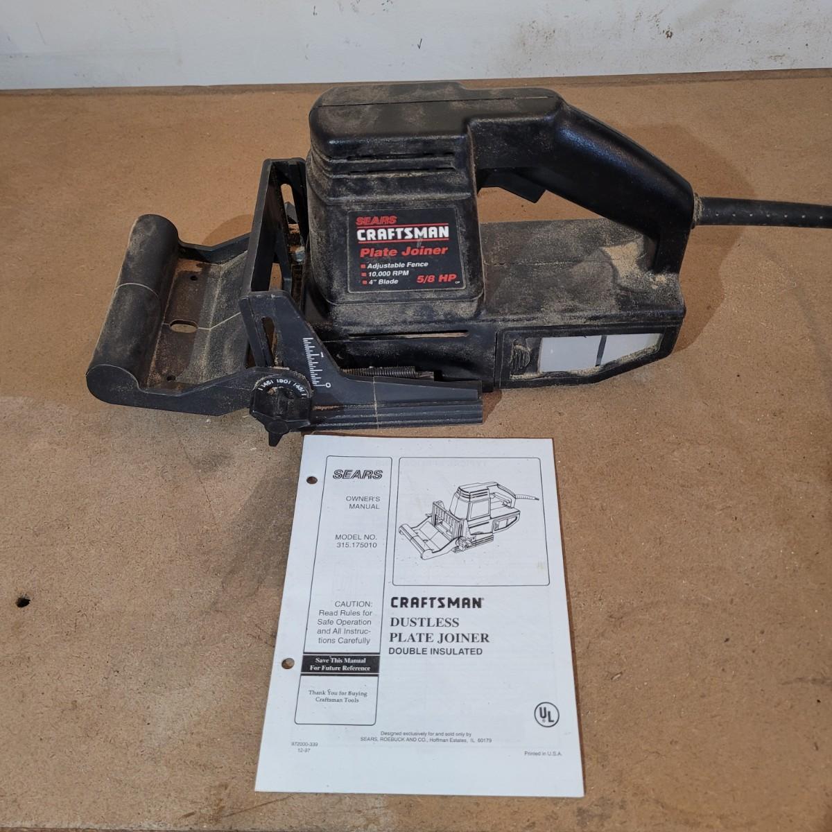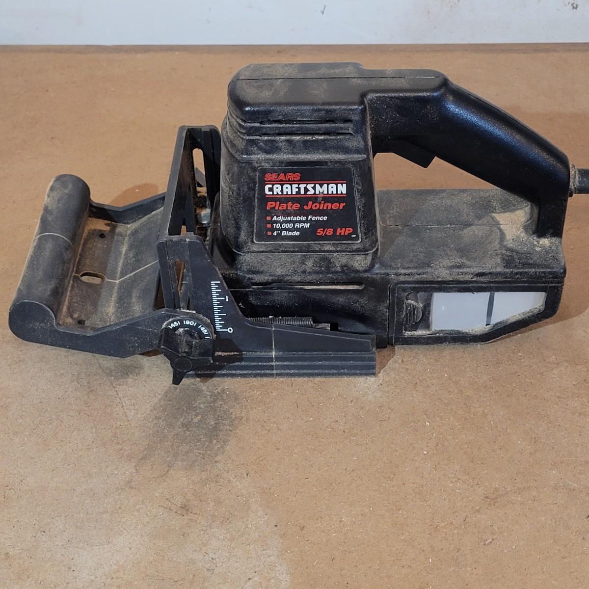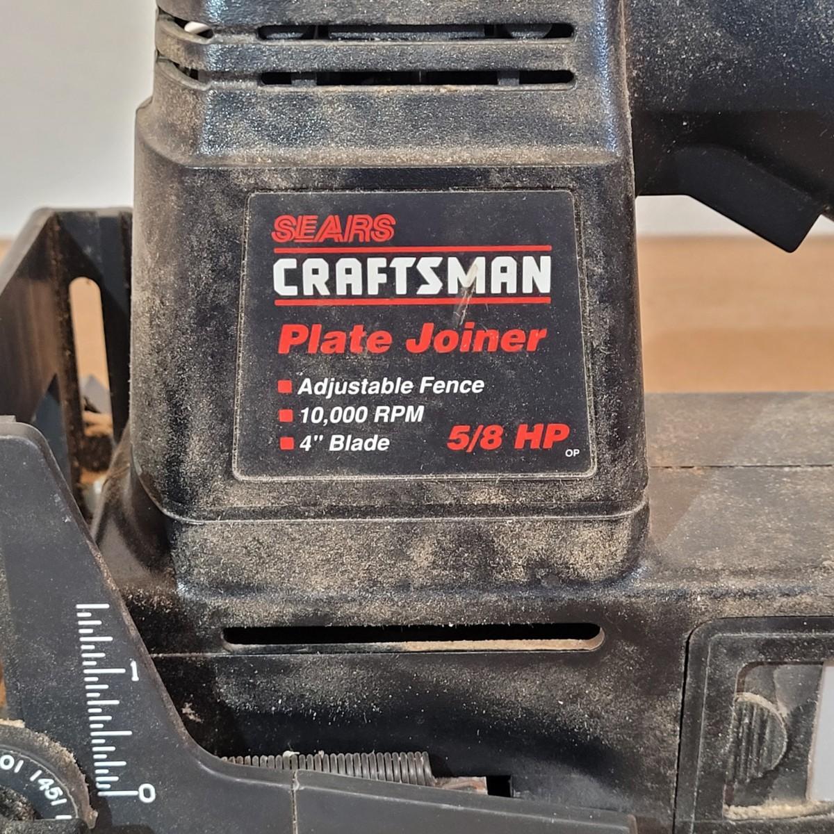 Craftsman brand corded dustless plate joiner. Powered on when plugged in. 10,000 RPM, adjustable fence, 4" blade. Includes original users manual.