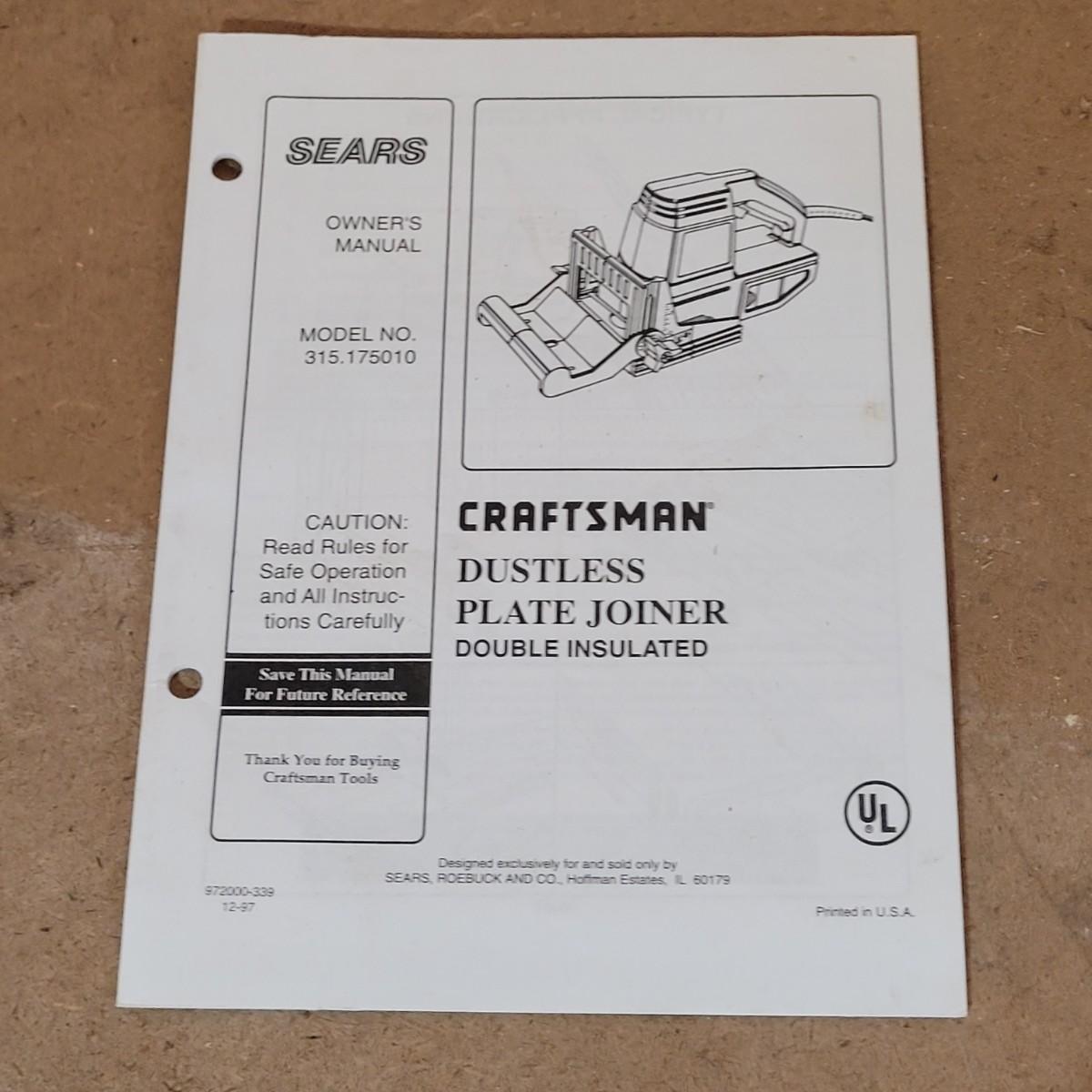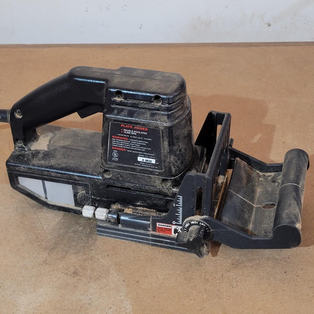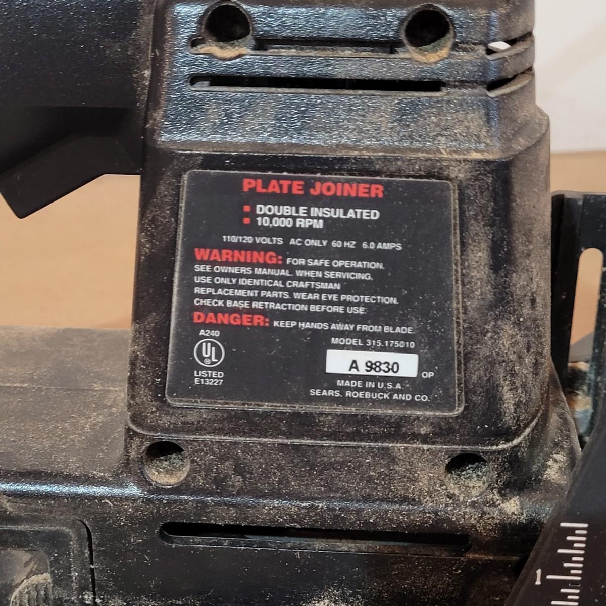 Craftsman brand corded dustless plate joiner. Powered on when plugged in. 10,000 RPM, adjustable fence, 4" blade. Includes original users manual.