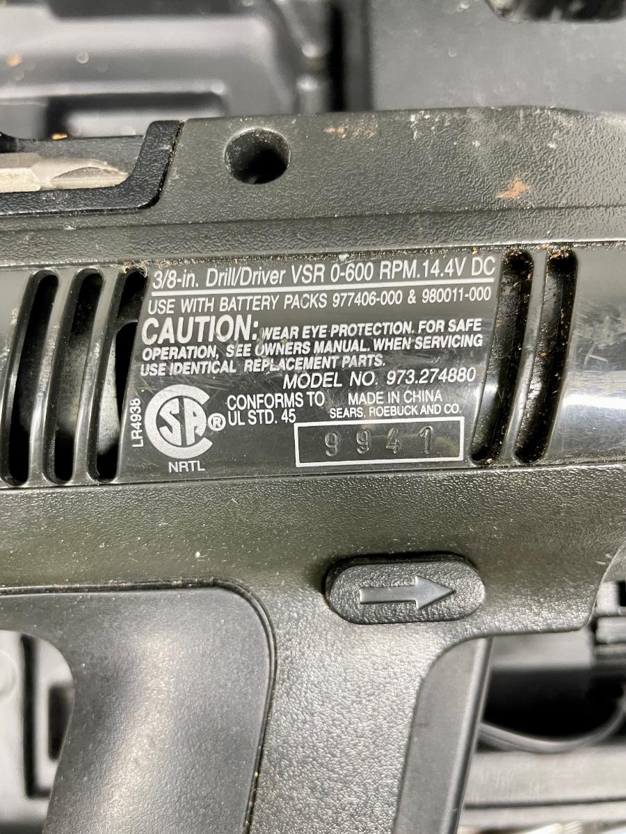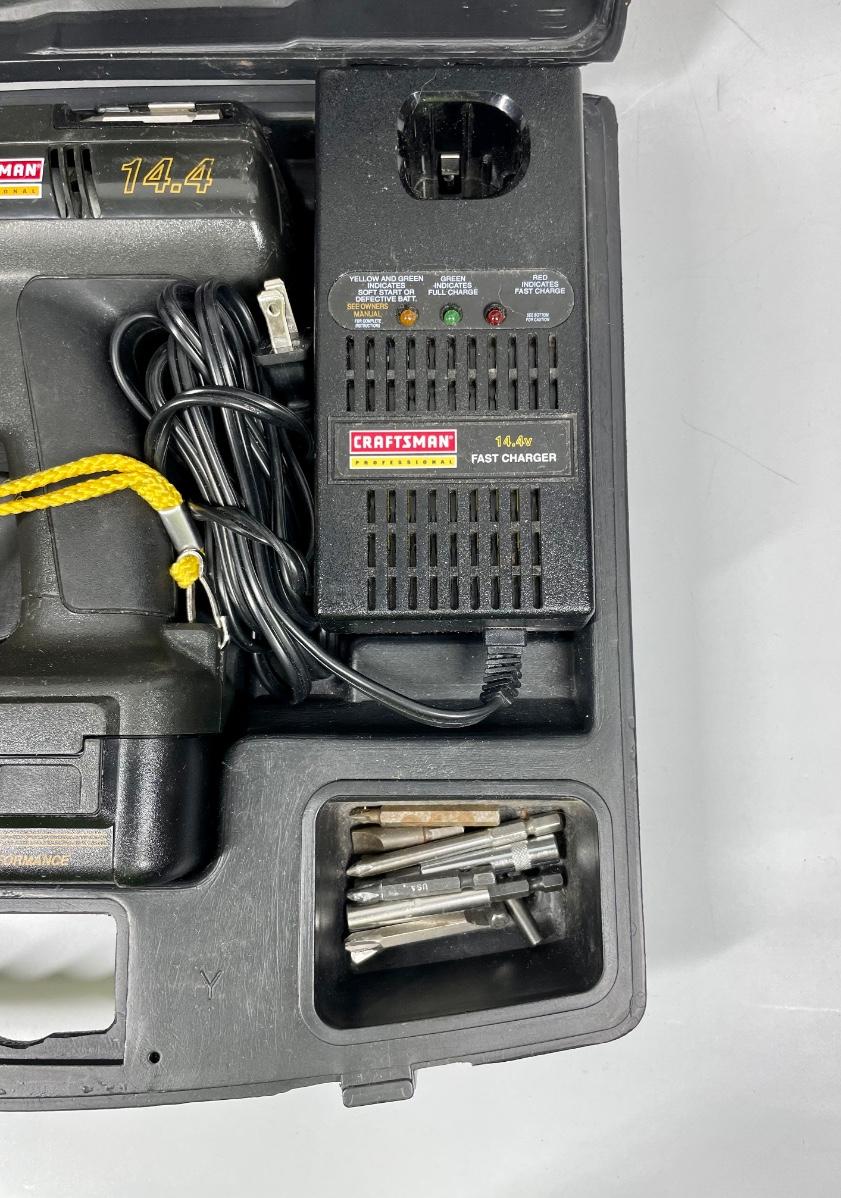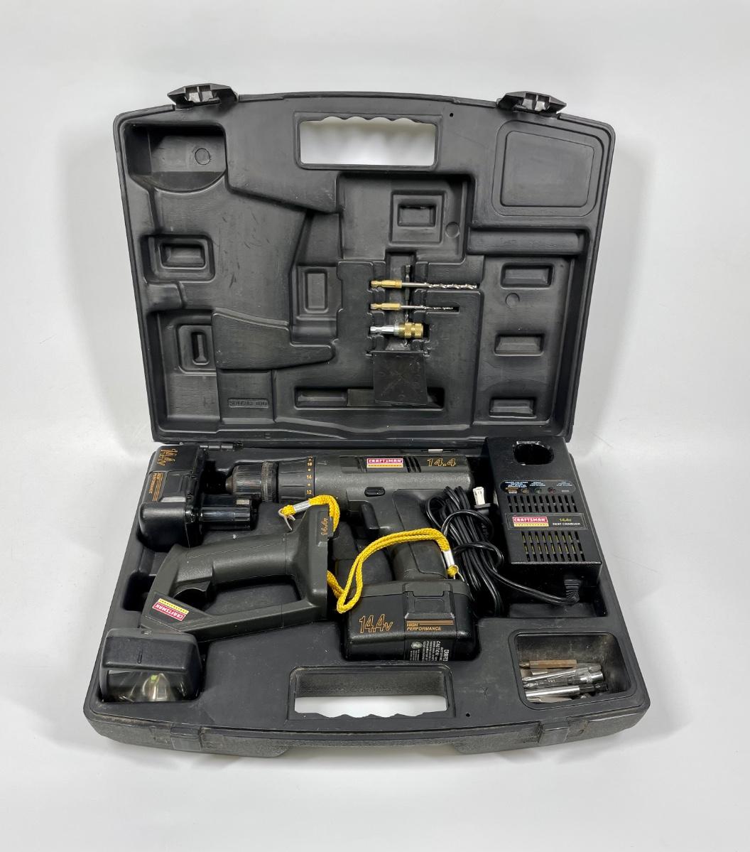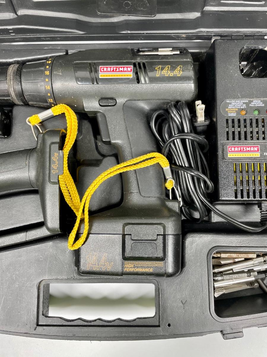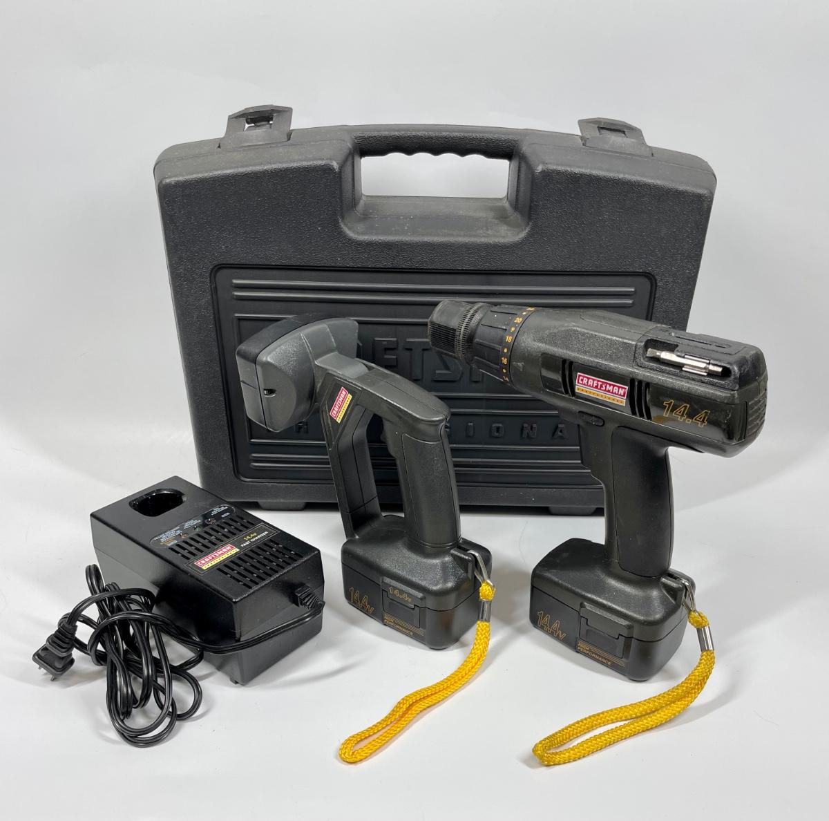 Craftsman Pro 14.4v Tool Kit. Includes drill, work light, 2 batteries, battery charger, carry case, and numerous accessories. Tested.