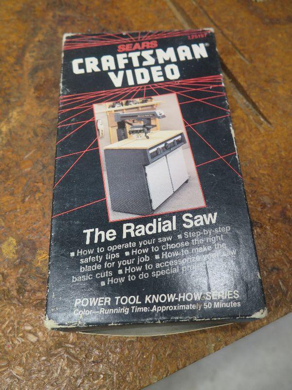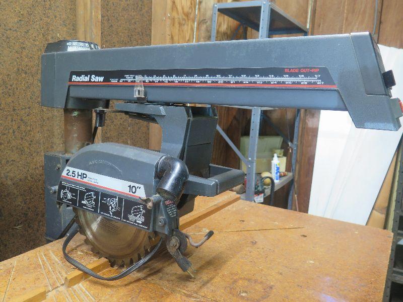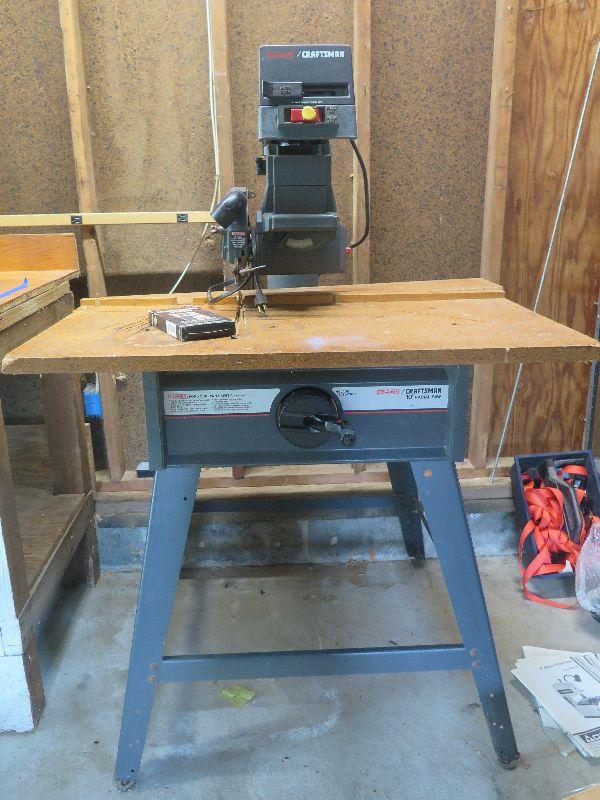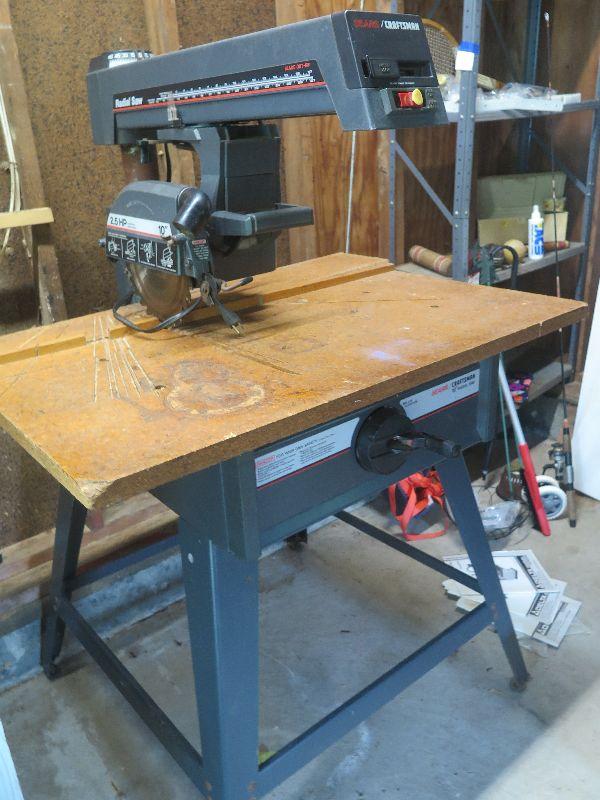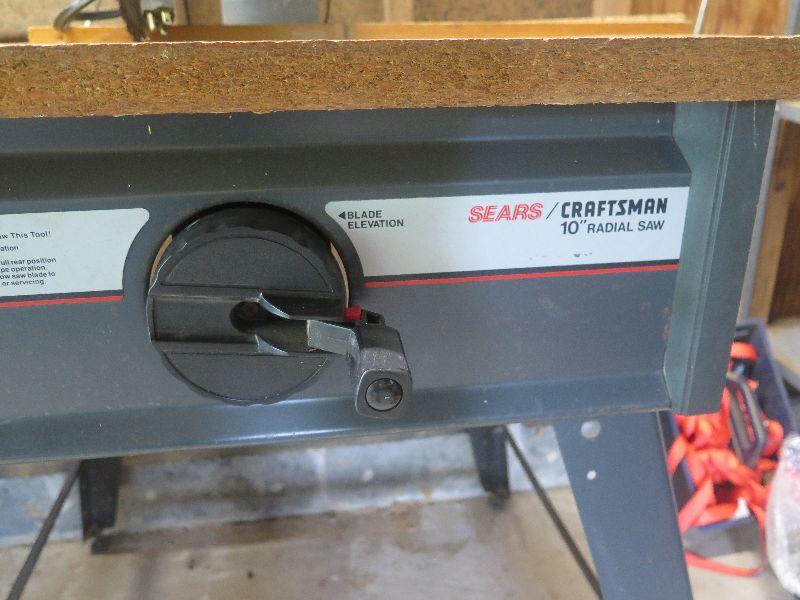 Craftsman 10 inch radial saw with height adjustment. Comes with VHS tutorial. Untested. Heavy, bring help to move.