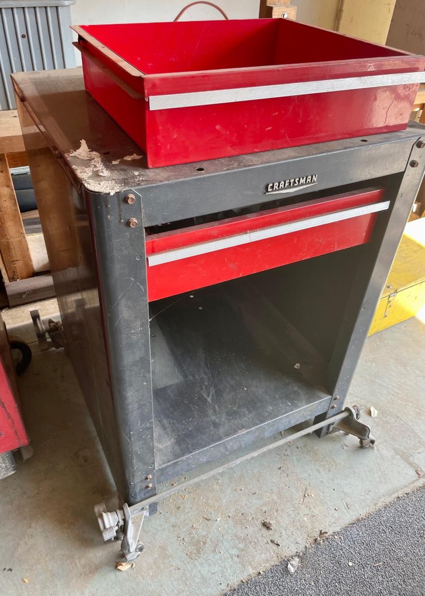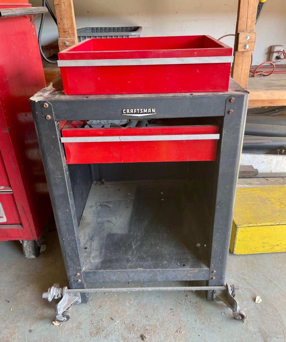 Rolling Craftsman 2-Drawer tool stand, can be used for routers, small drill presses, portable table saws, etc. Lockable wheels to provide a firm, stable non/moving work stand.