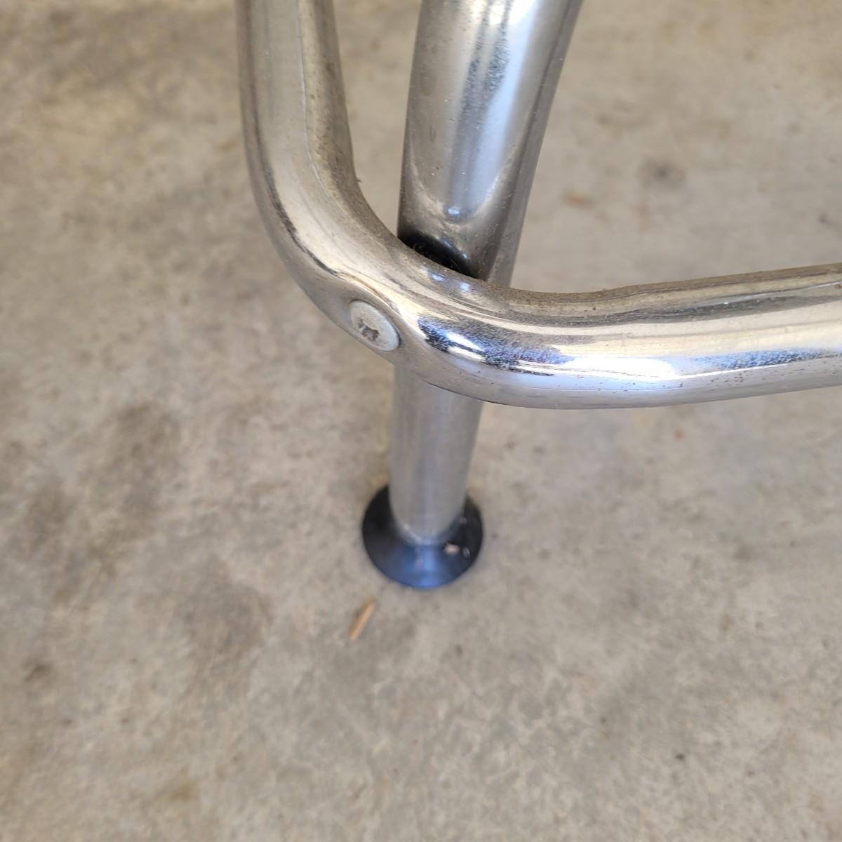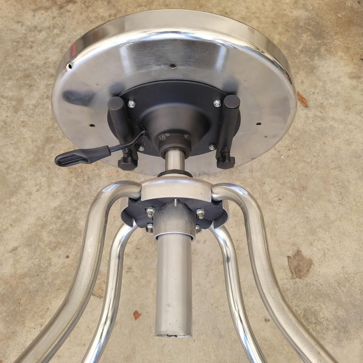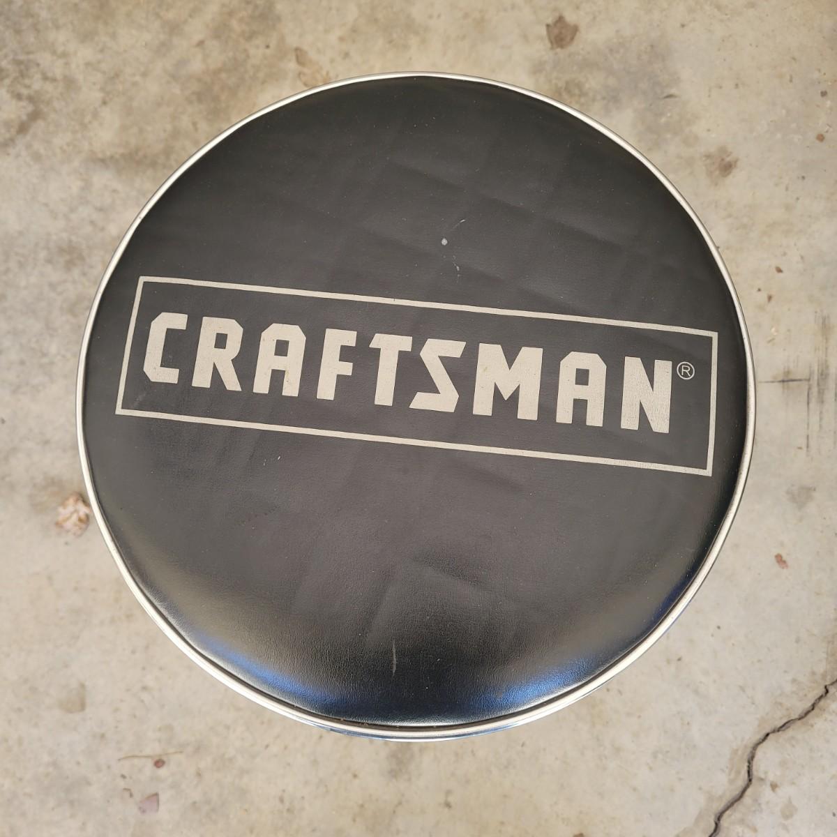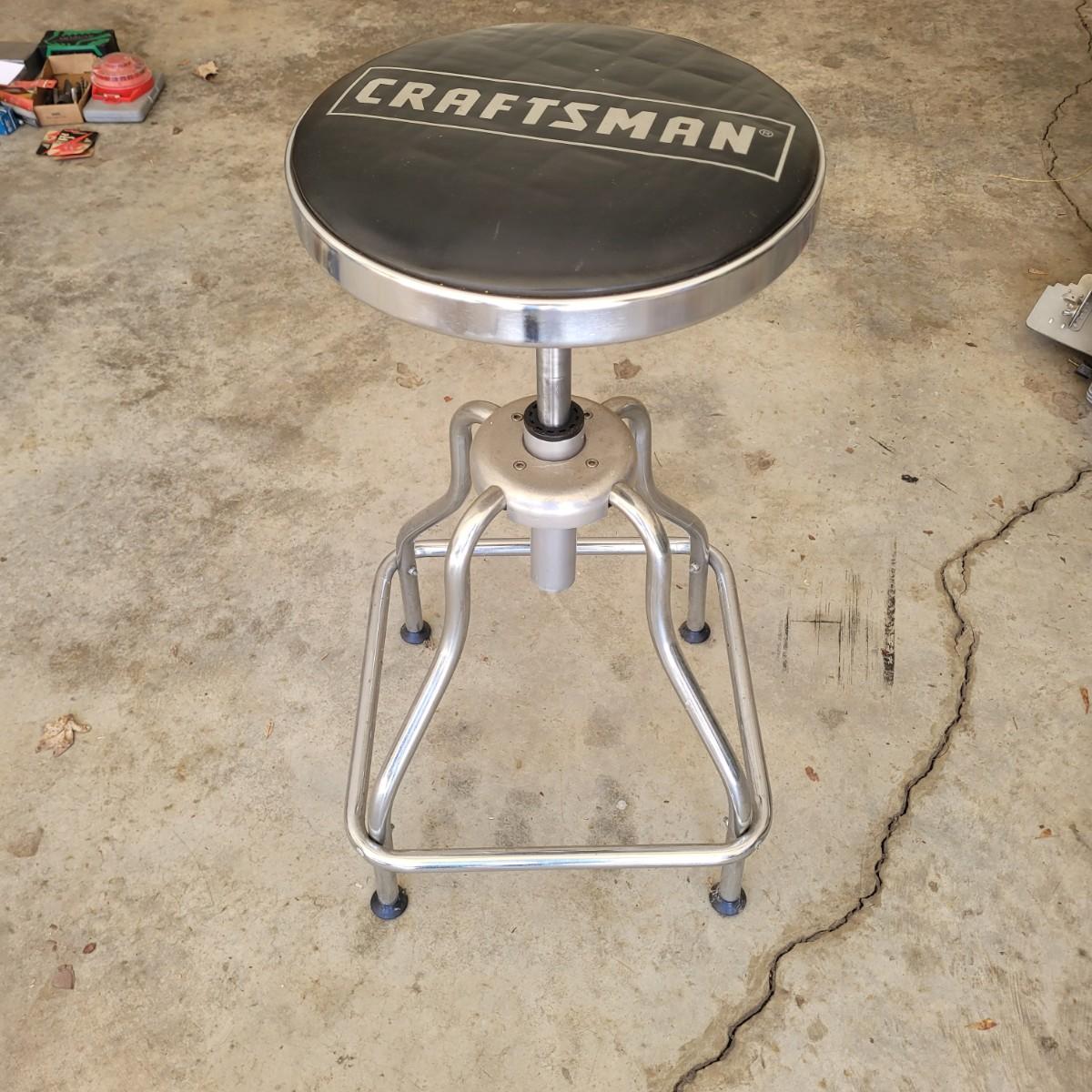 Craftsman adjustable hydraulic seat stool, commonly used in workshops and garages. It adjusts from 28 1/2" to 33" using a hydraulic system. It features a chrome-finished base and a vinyl-padded seat. Equipped with slip-resistant, adjustable feet for leveling on uneven surfaces and a 360-degree swivel seat.