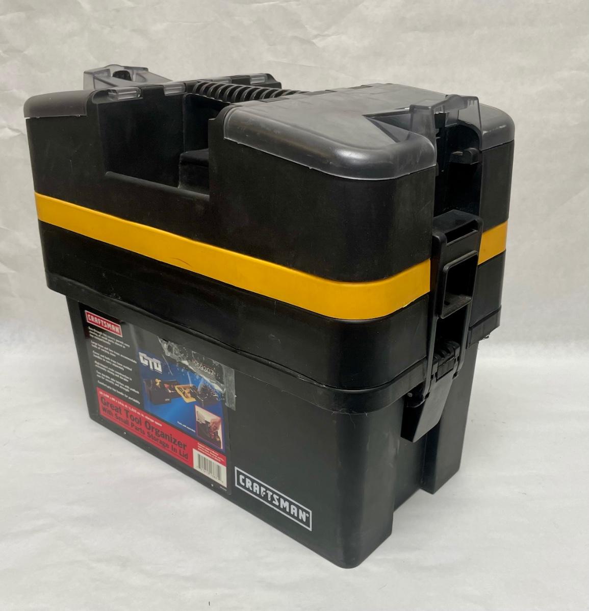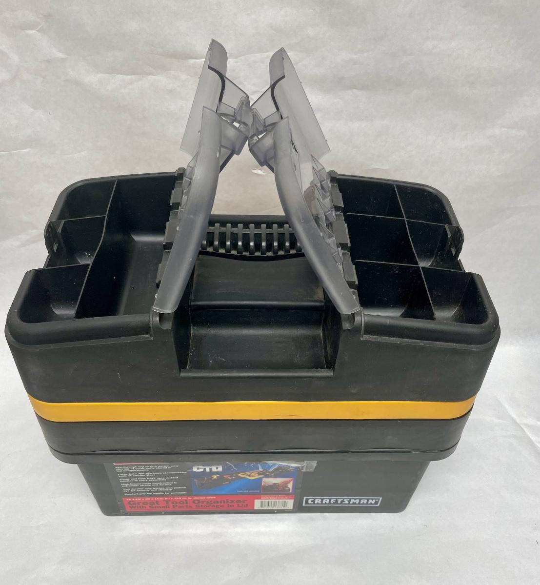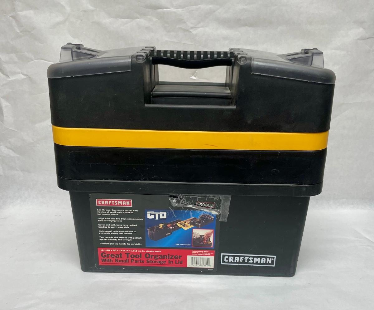Item #959307. Black and yellow Craftsman tool box, with 2 stackable, removable trays and a small parts organizer on top. Near new condition. Approx. 14” tall, 16" long and 9" wide.