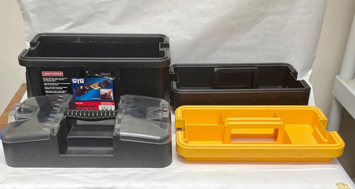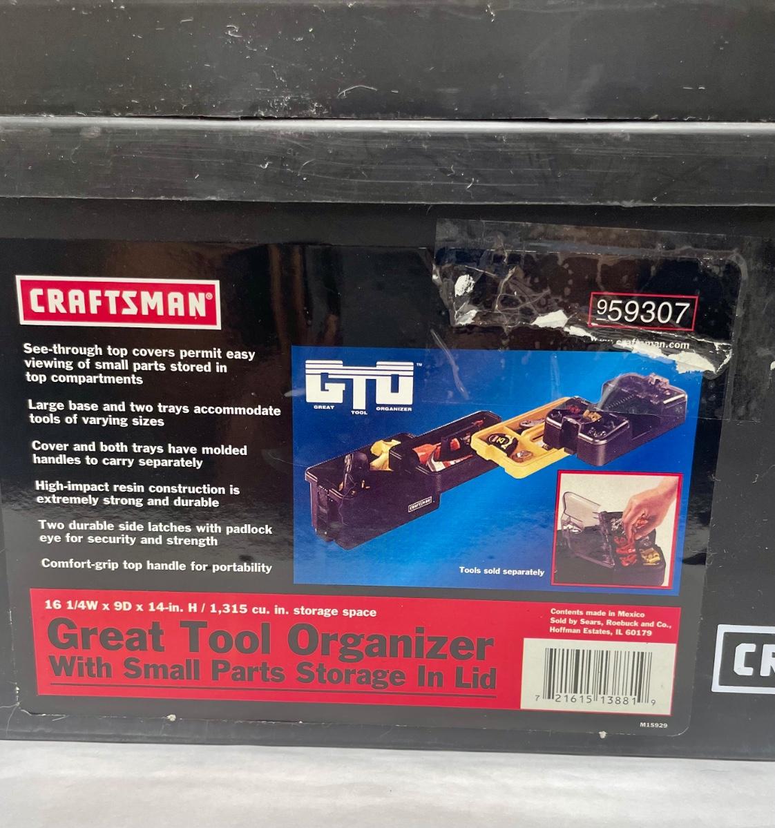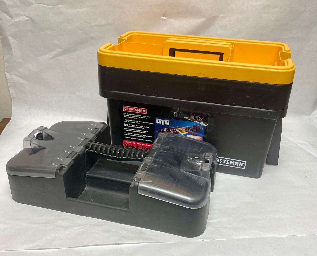 Item #959307. Black and yellow Craftsman tool box, with 2 stackable, removable trays and a small parts organizer on top. Near new condition. Approx. 14” tall, 16" long and 9" wide.
