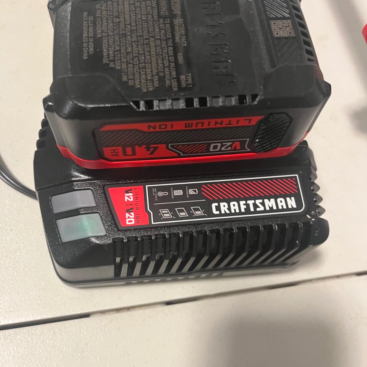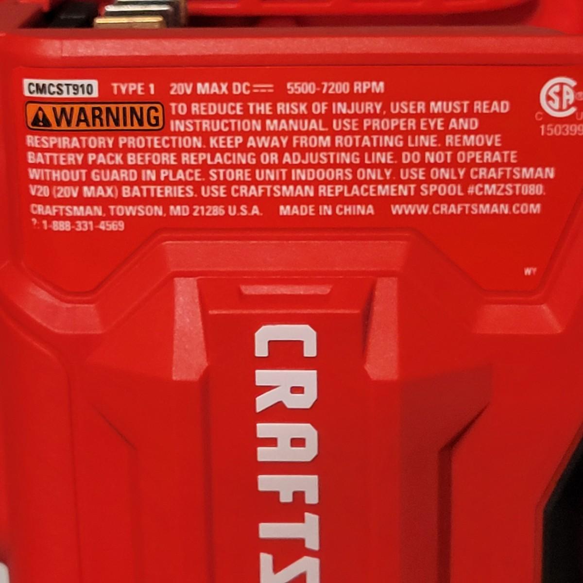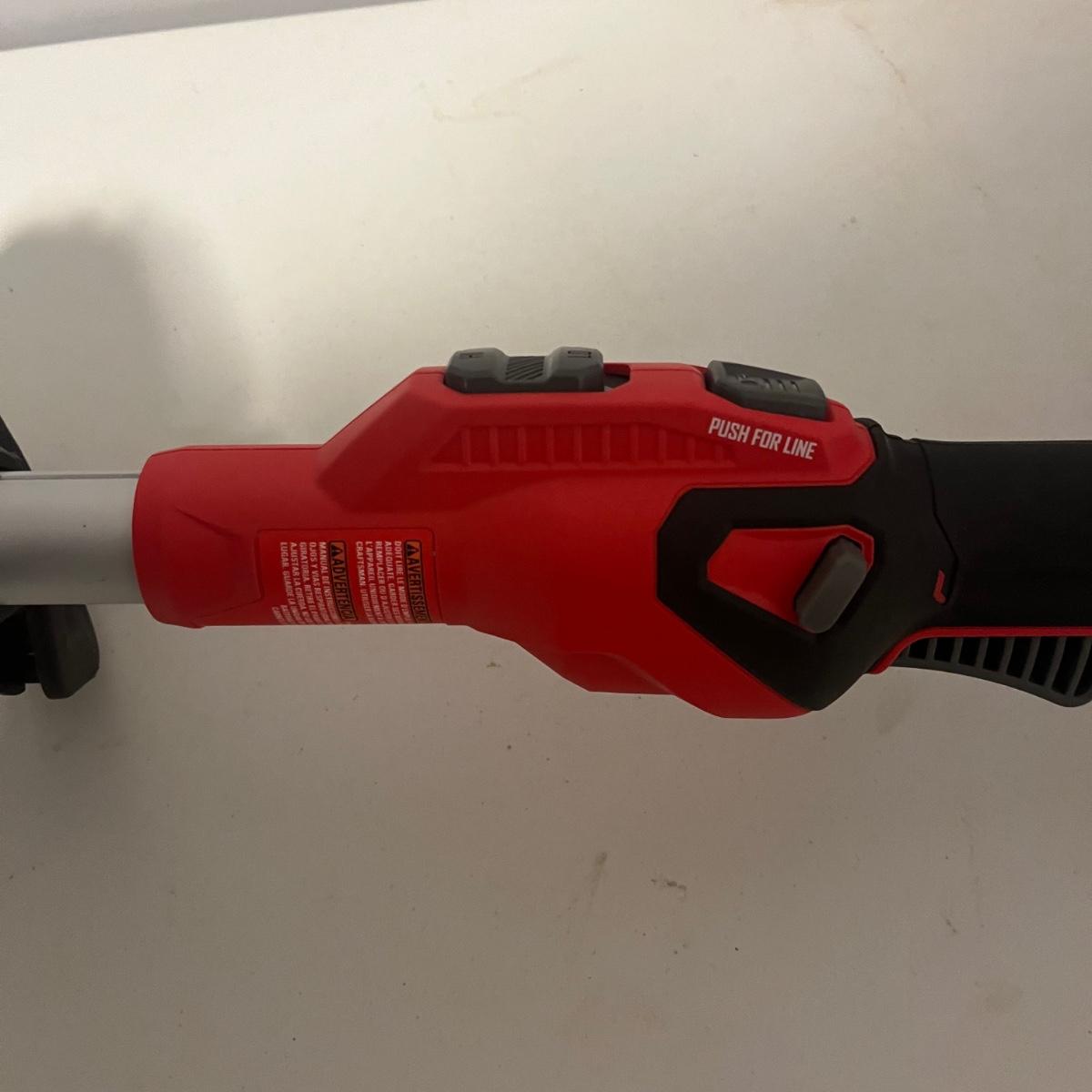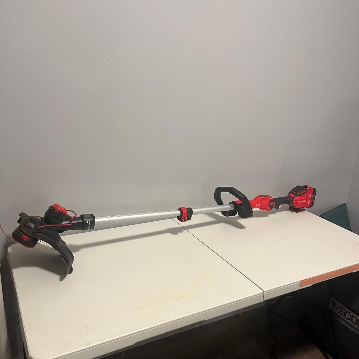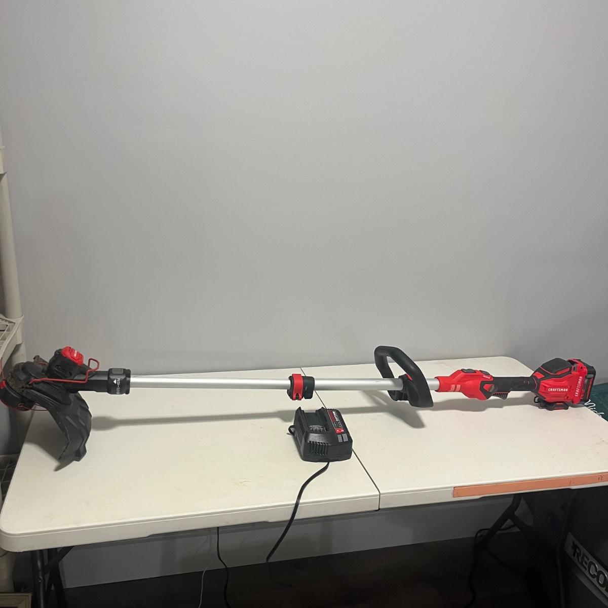 Lot includes a Craftsman 20V lithium ion battery operated string trimmer with charger. Machine powered on when trigger pulled.