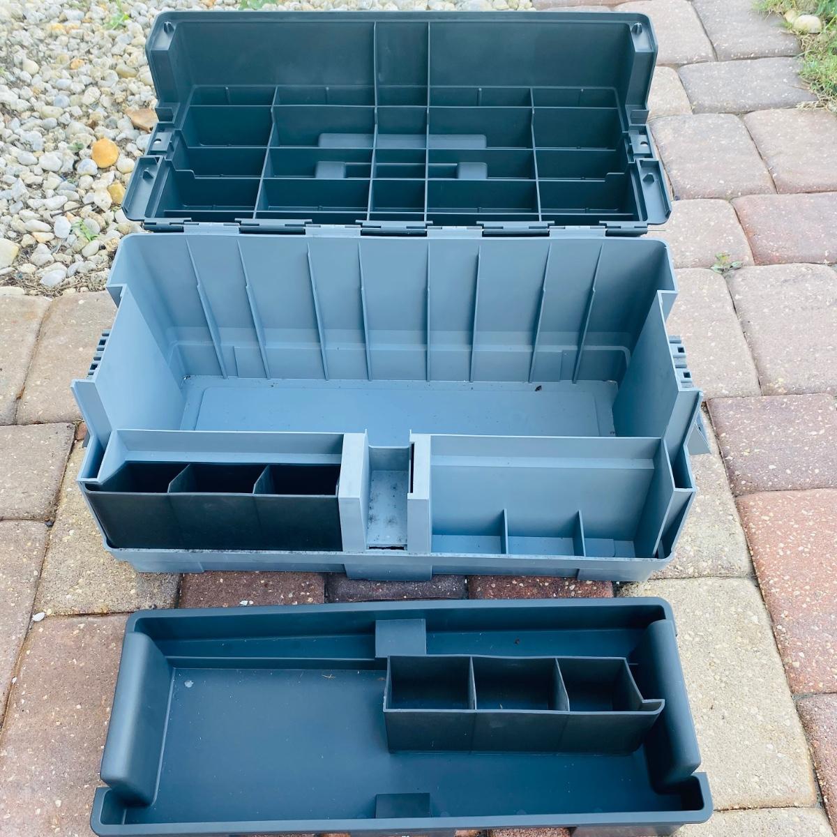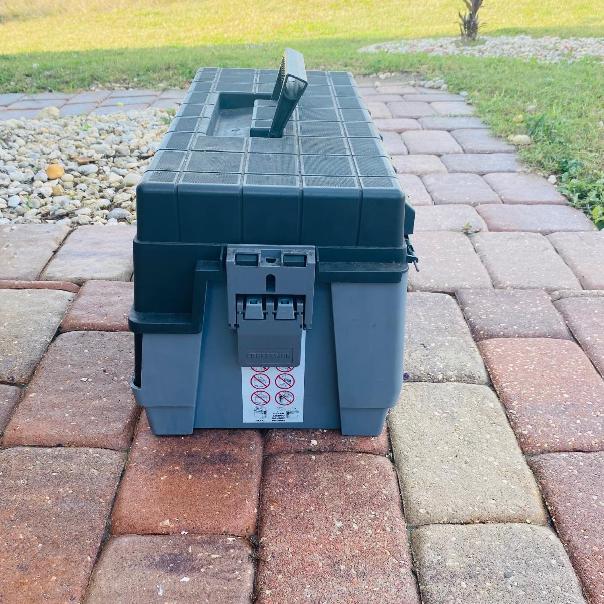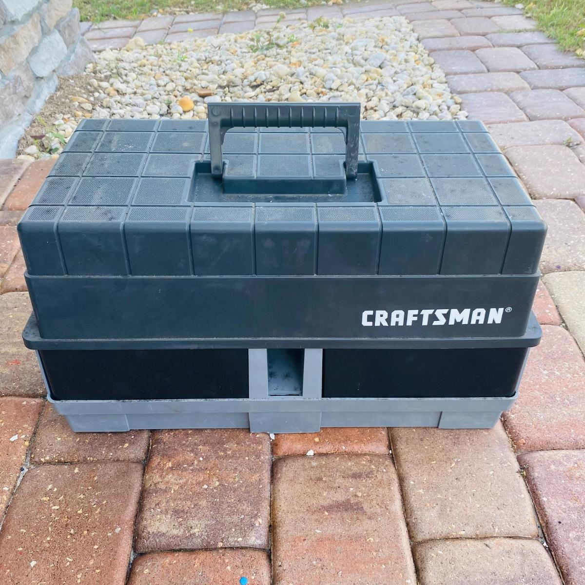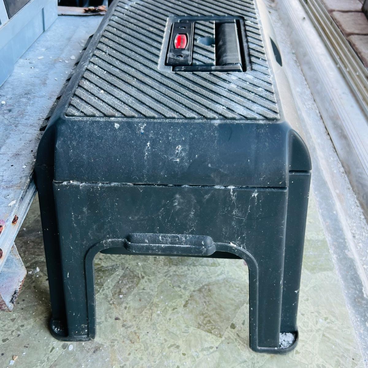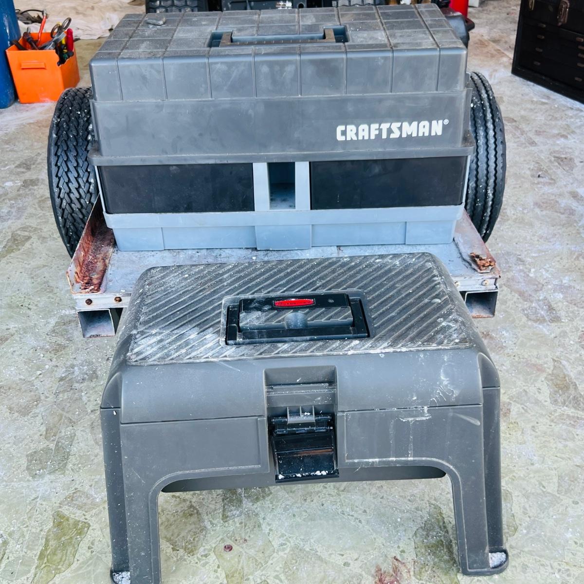 Craftsman heavy duty plastic, tool box with removable organizer compartments and in great condition. Measures 23”L x 12”W x 12”H. Vintage Rubbermade Step Stool shows signs of wear but sturdy and functional.