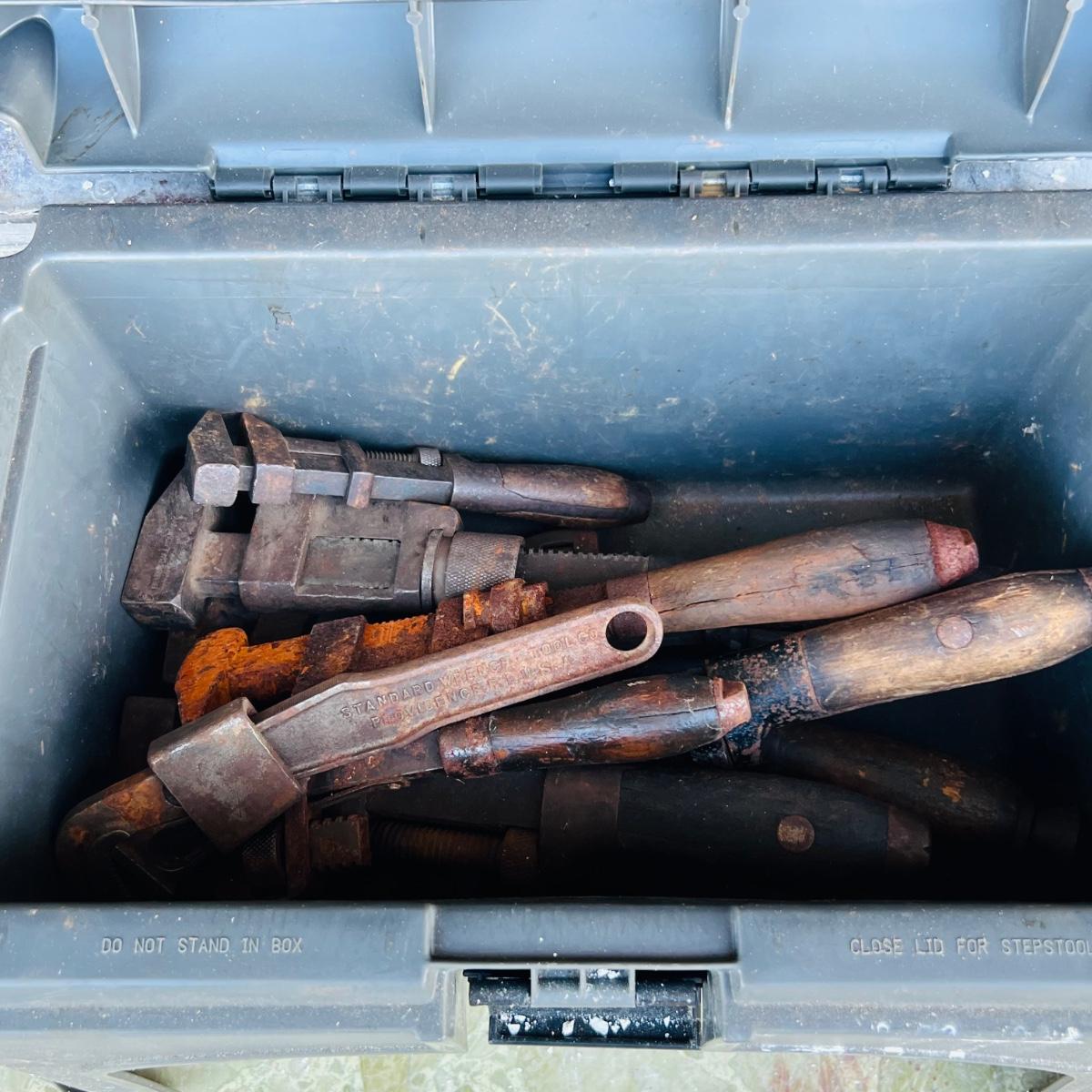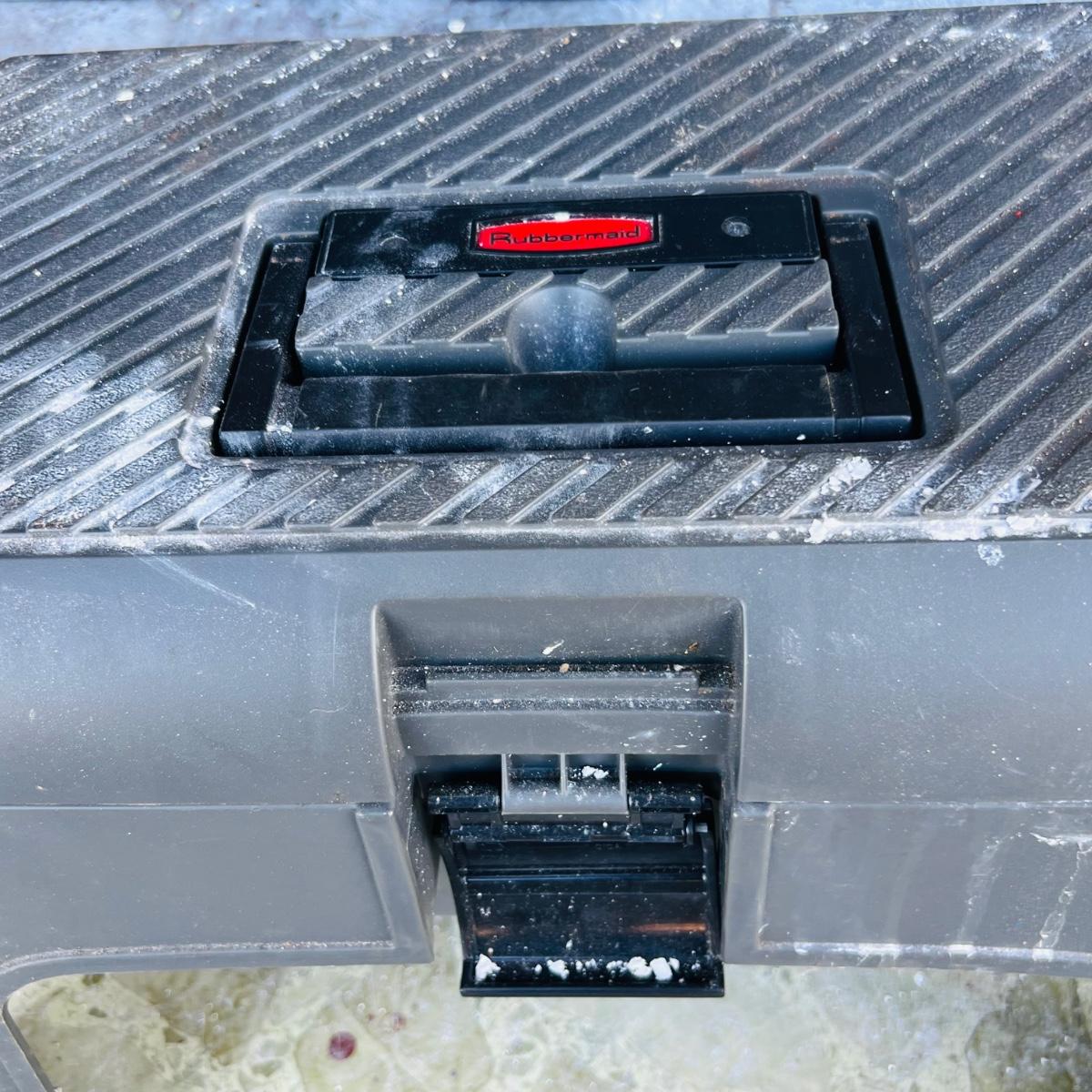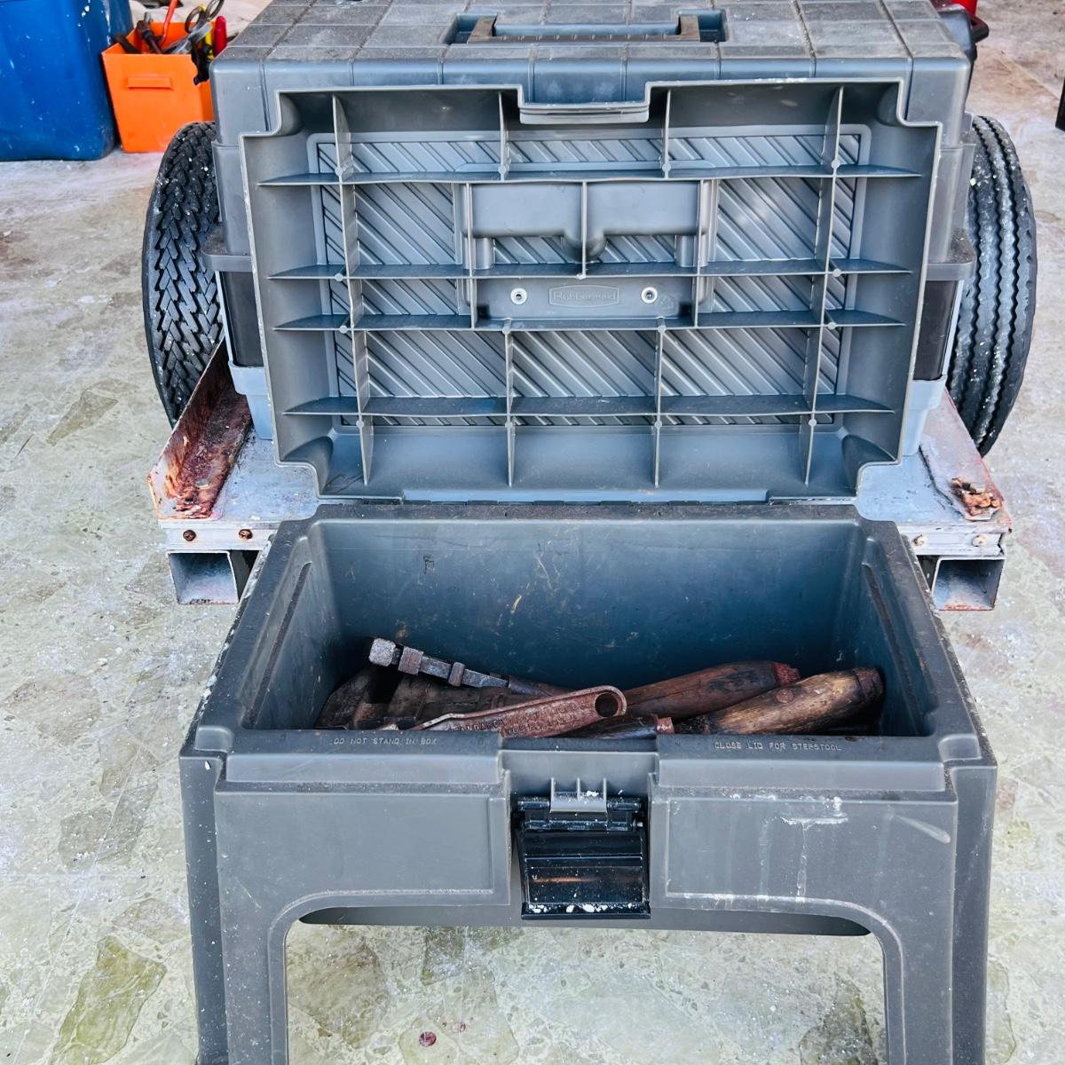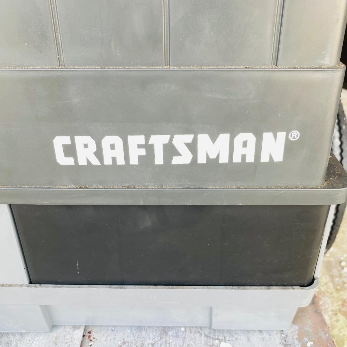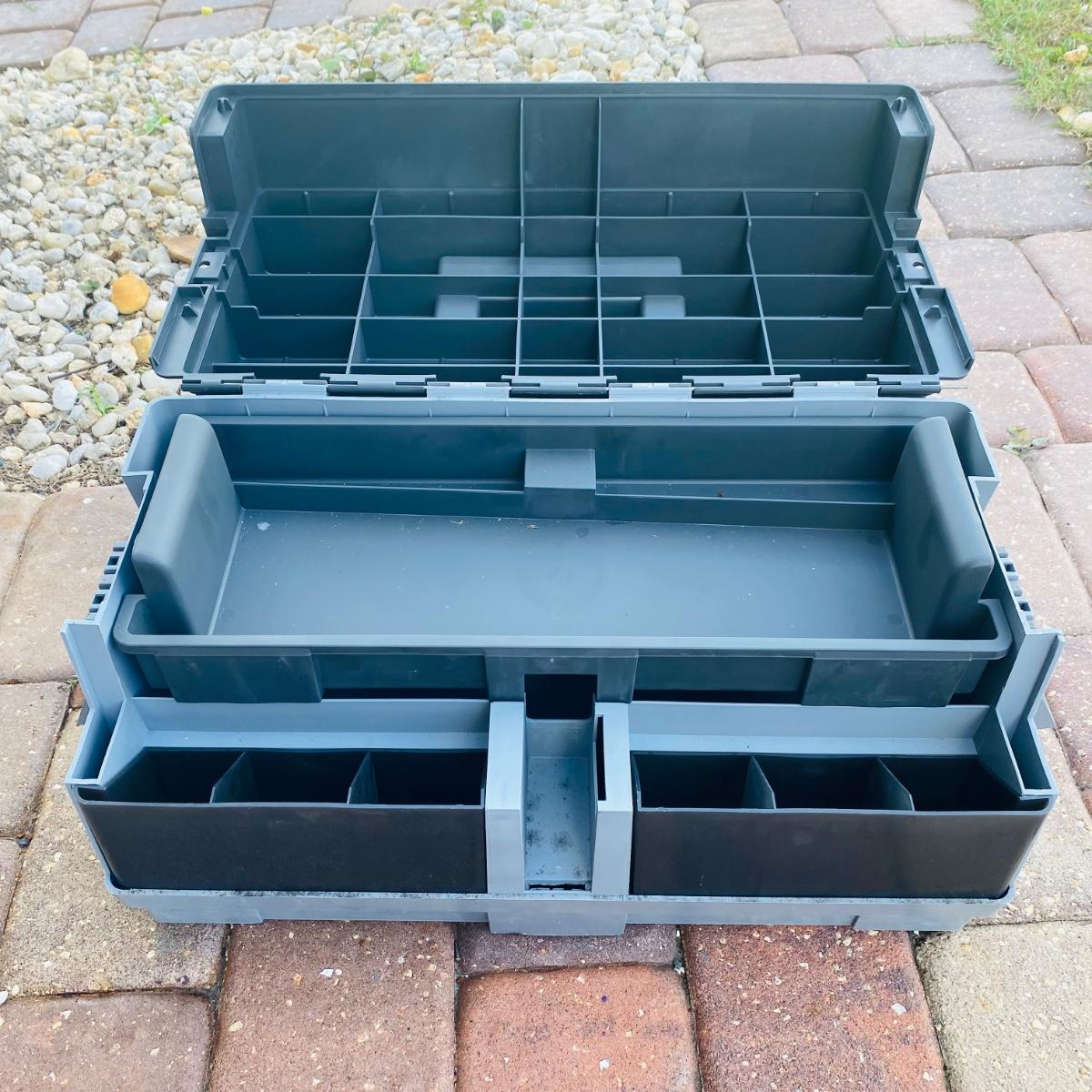 Craftsman heavy duty plastic, tool box with removable organizer compartments and in great condition. Measures 23”L x 12”W x 12”H. Vintage Rubbermade Step Stool shows signs of wear but sturdy and functional.