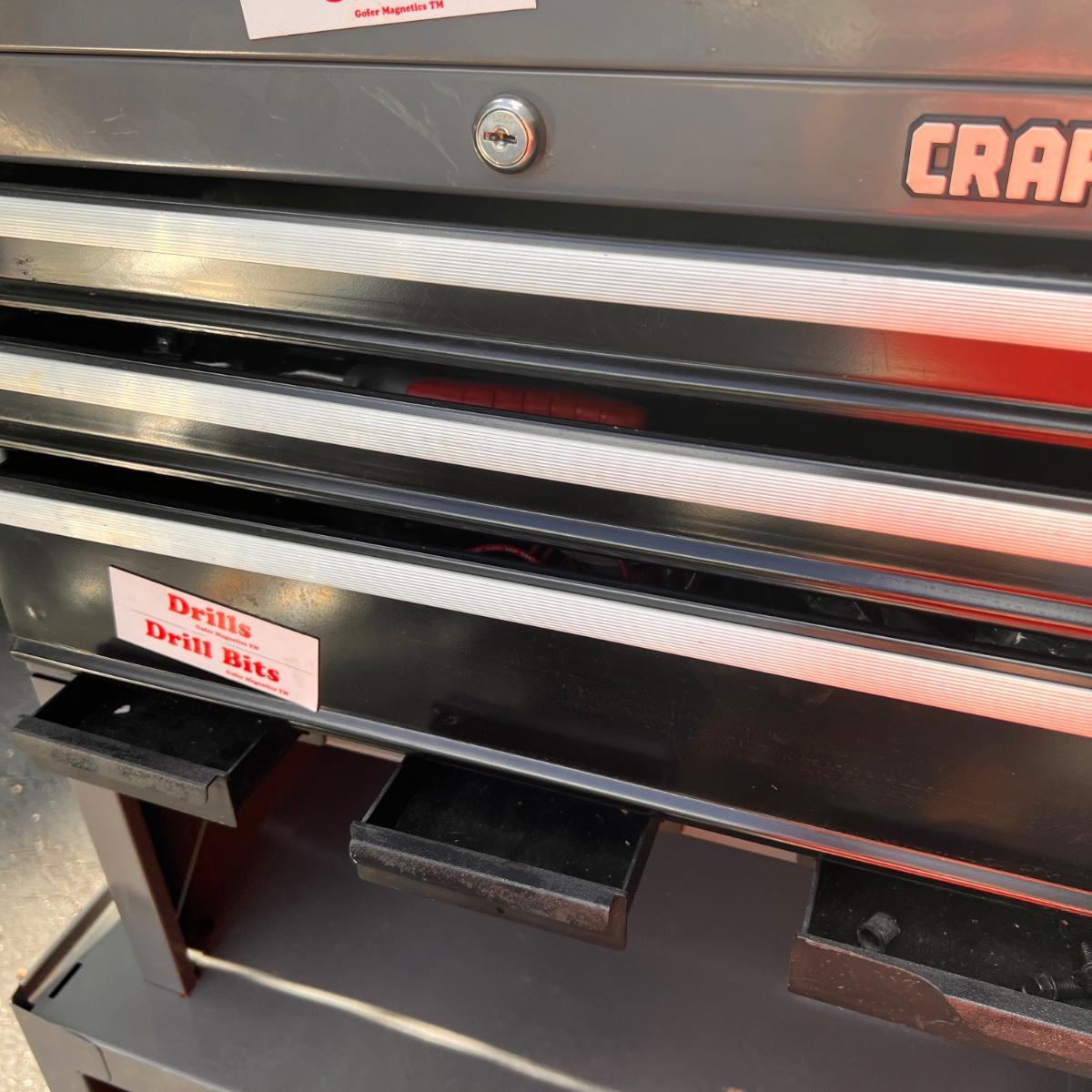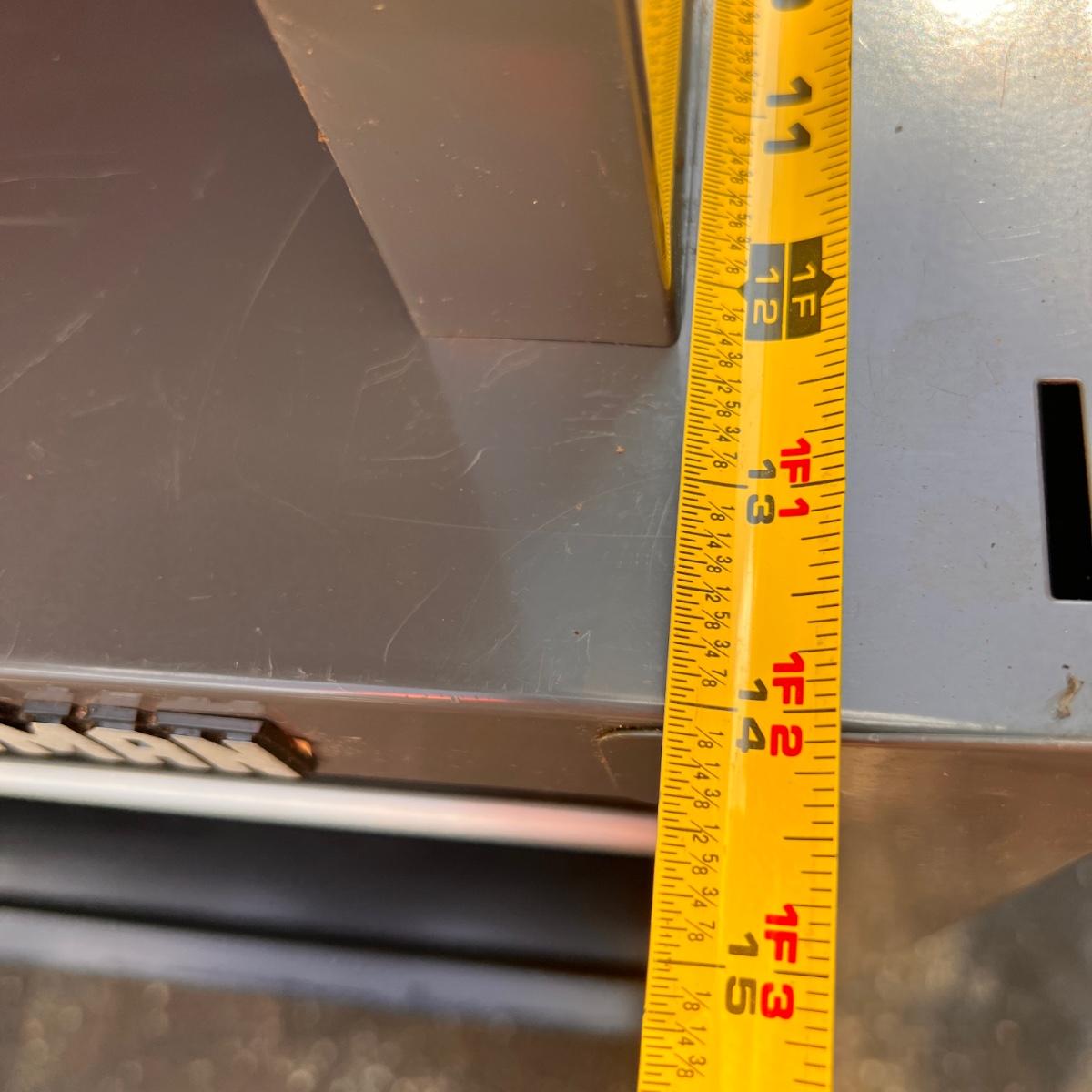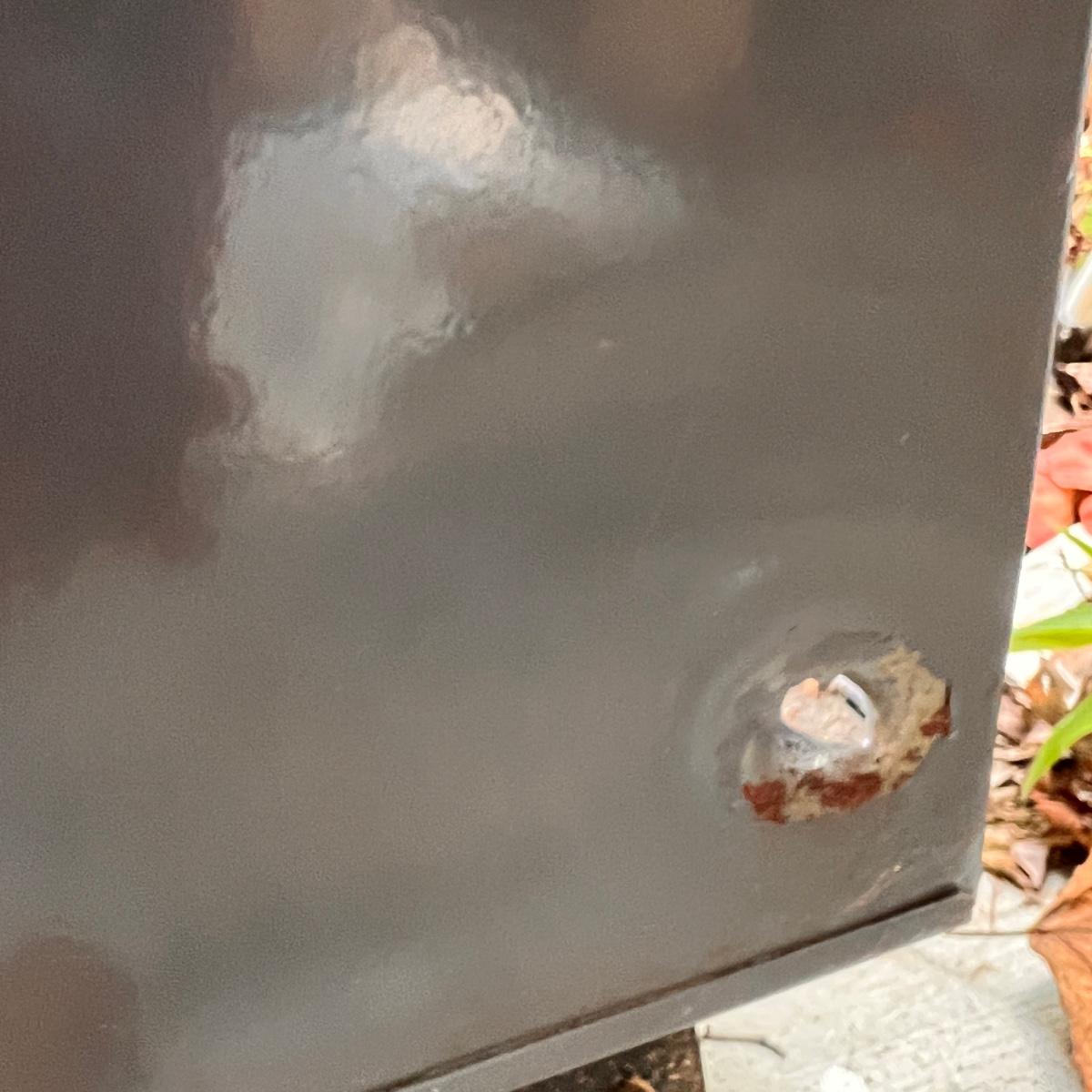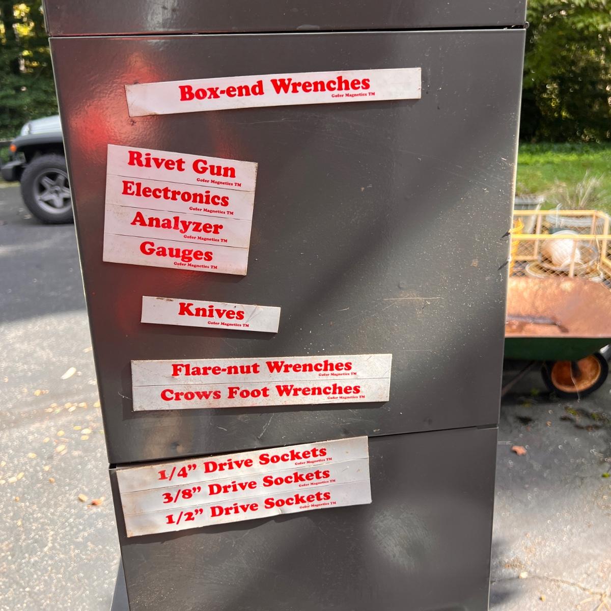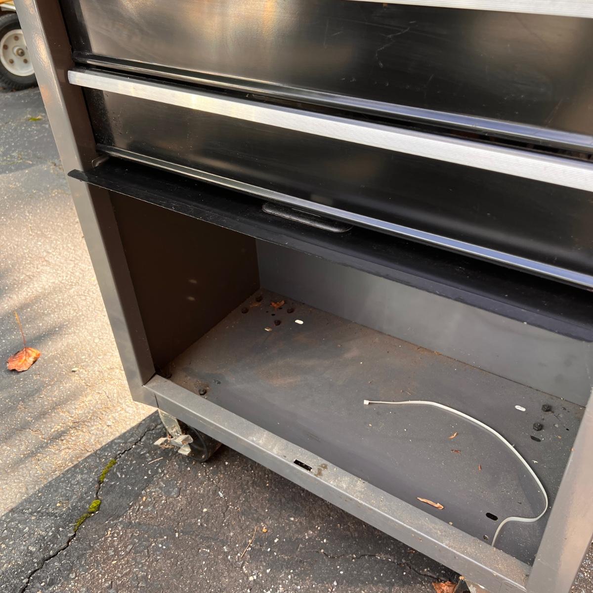 In good used condition. Has magnet labels. Small hole in the bottom right corner. Roll top bottom cabinet.