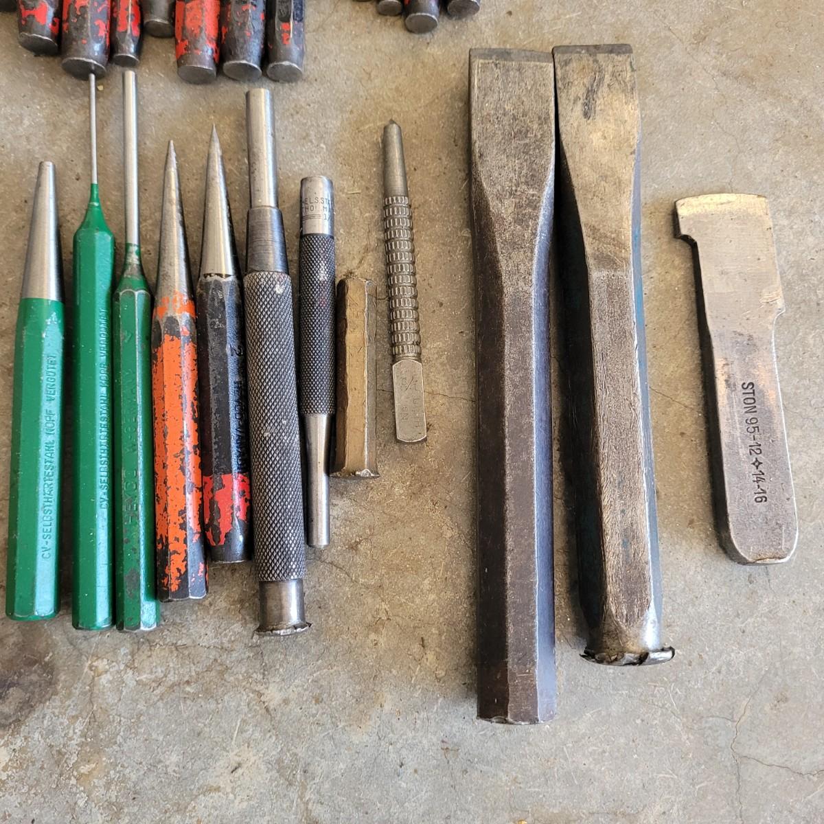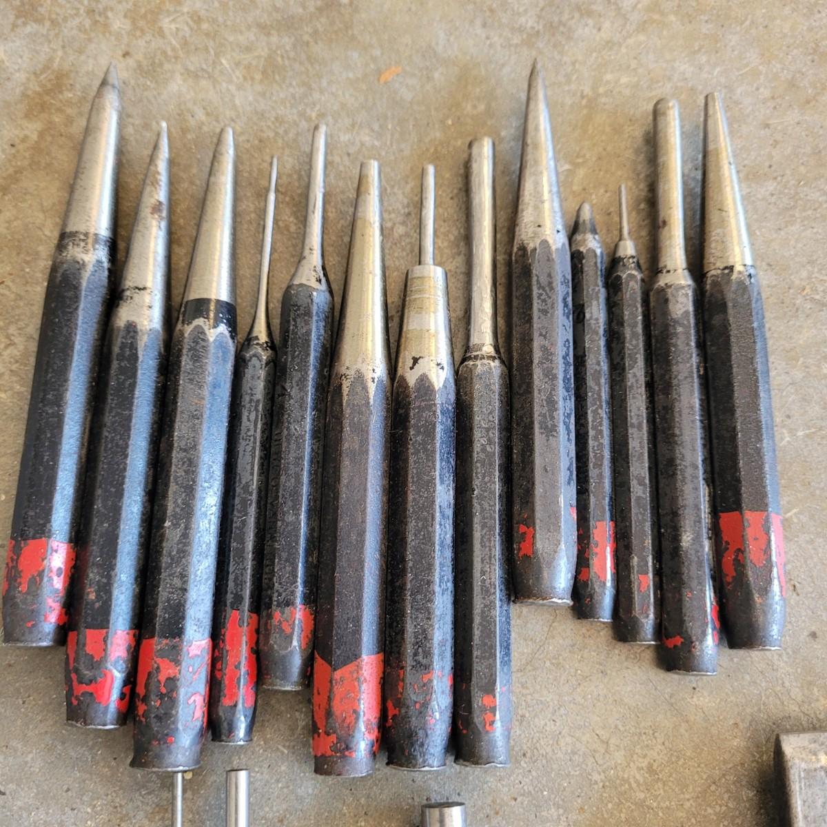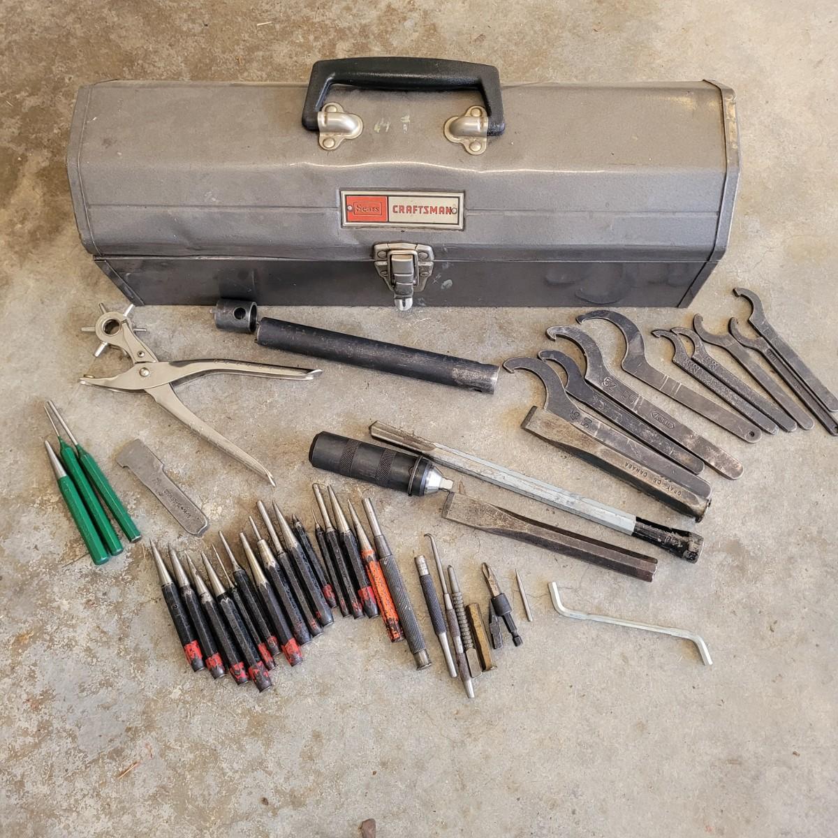 This lot includes a metal Craftsman tool box and a large mix of punches and miscellaneous tools. The toolbox measures 20" x 7" x 7"H and has a latch and carrying handle. There are about 20 different punches of all shapes and sizes. Also includes nine hook wrenches of various sizes. Brands include Craftsman, Heyco, and General Hardware.