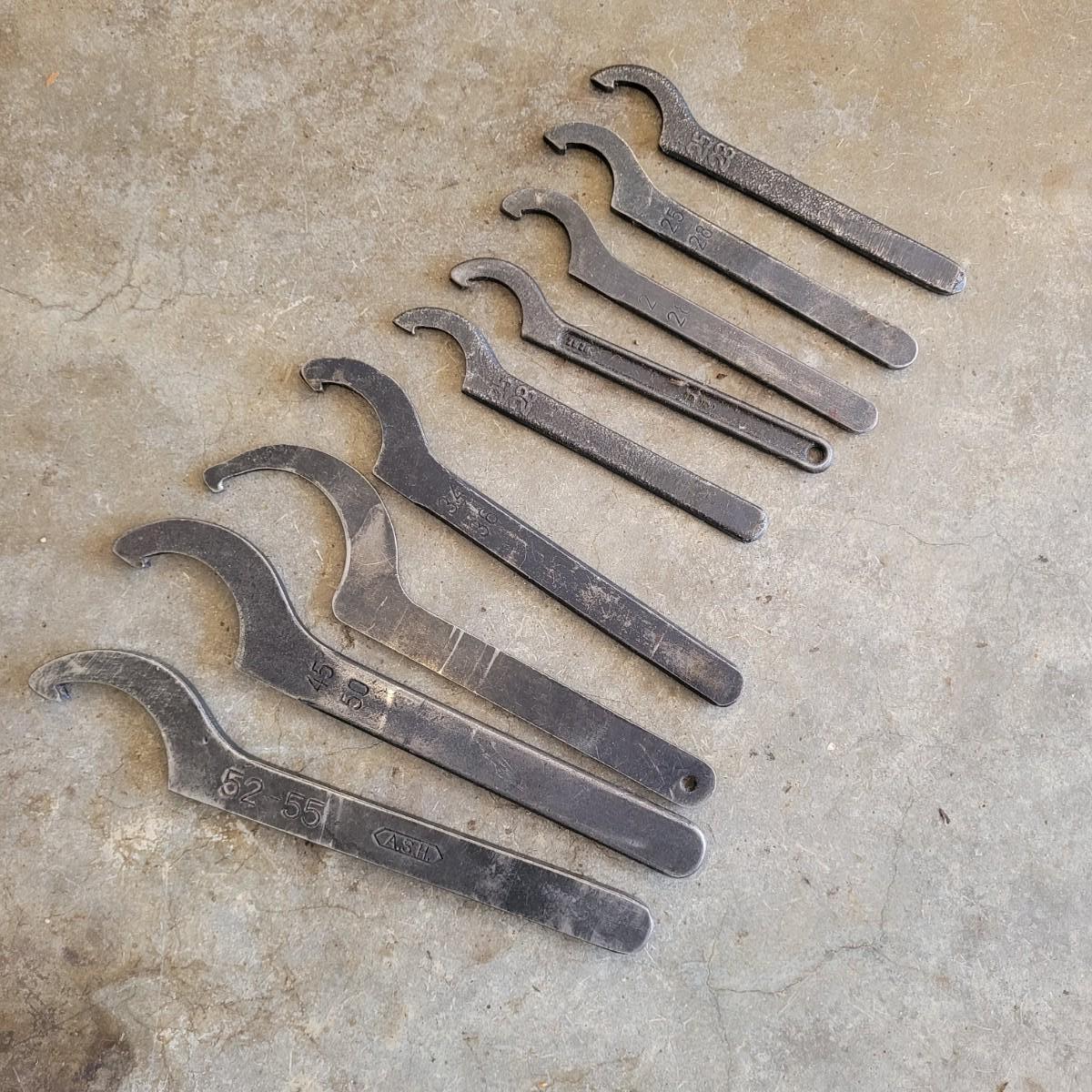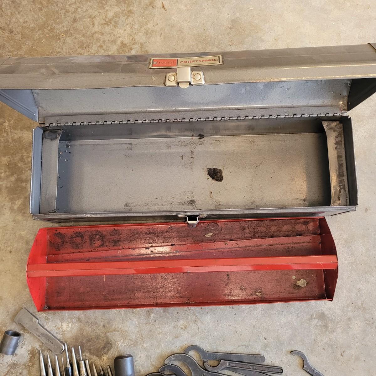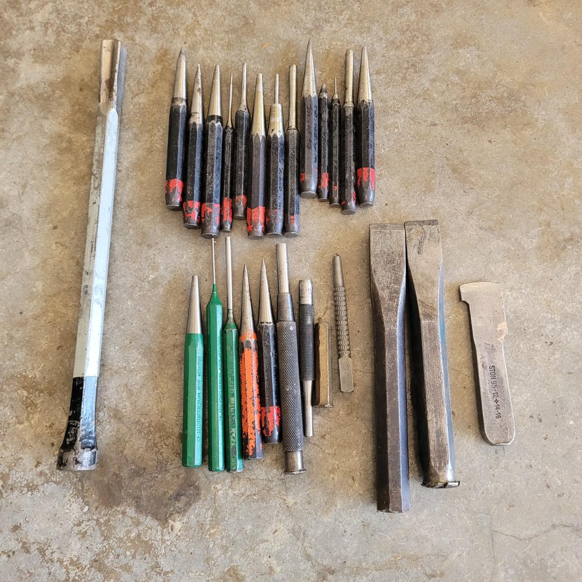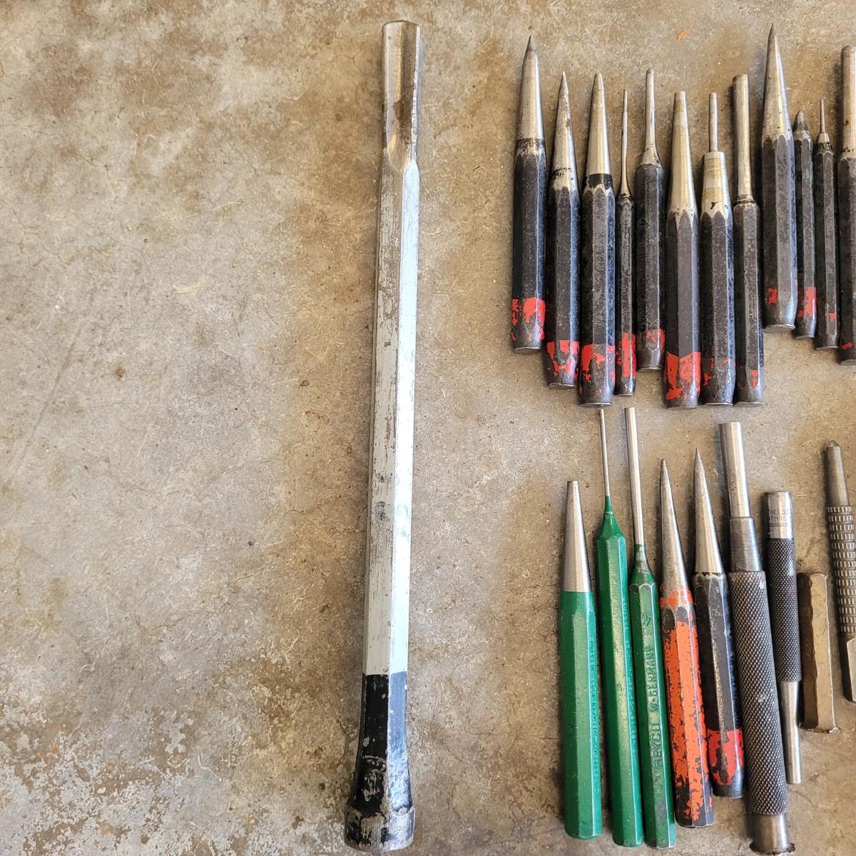 This lot includes a metal Craftsman tool box and a large mix of punches and miscellaneous tools. The toolbox measures 20" x 7" x 7"H and has a latch and carrying handle. There are about 20 different punches of all shapes and sizes. Also includes nine hook wrenches of various sizes. Brands include Craftsman, Heyco, and General Hardware.
