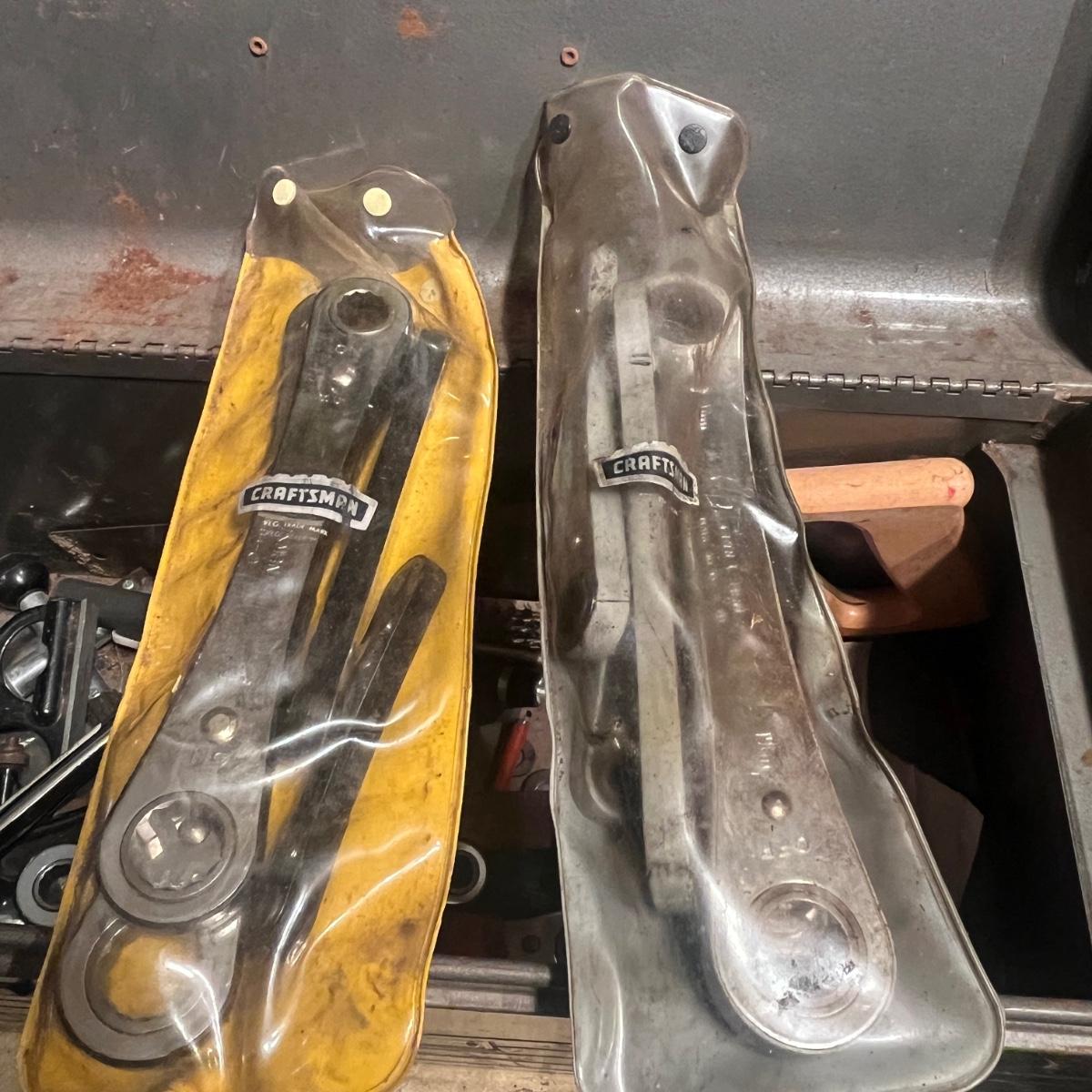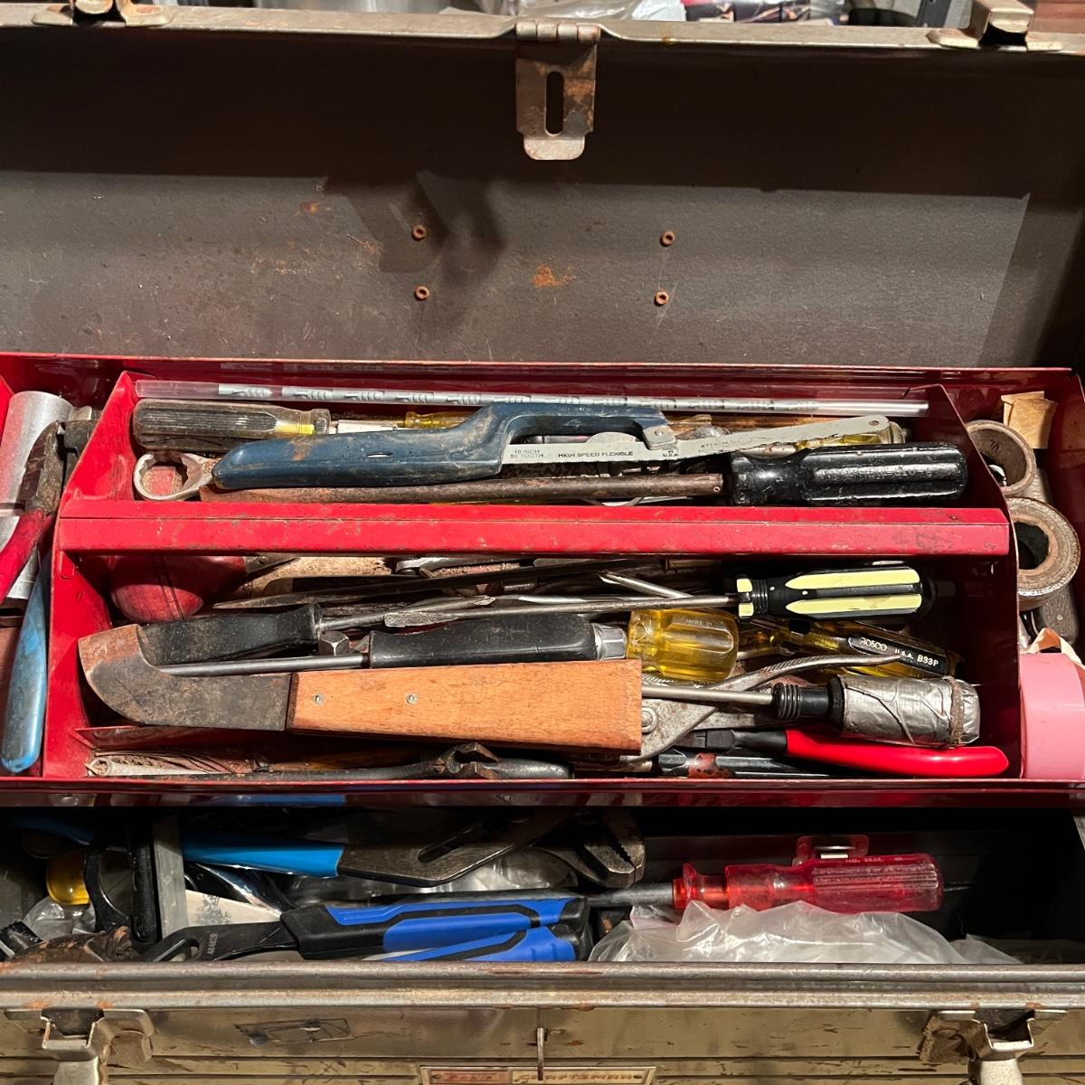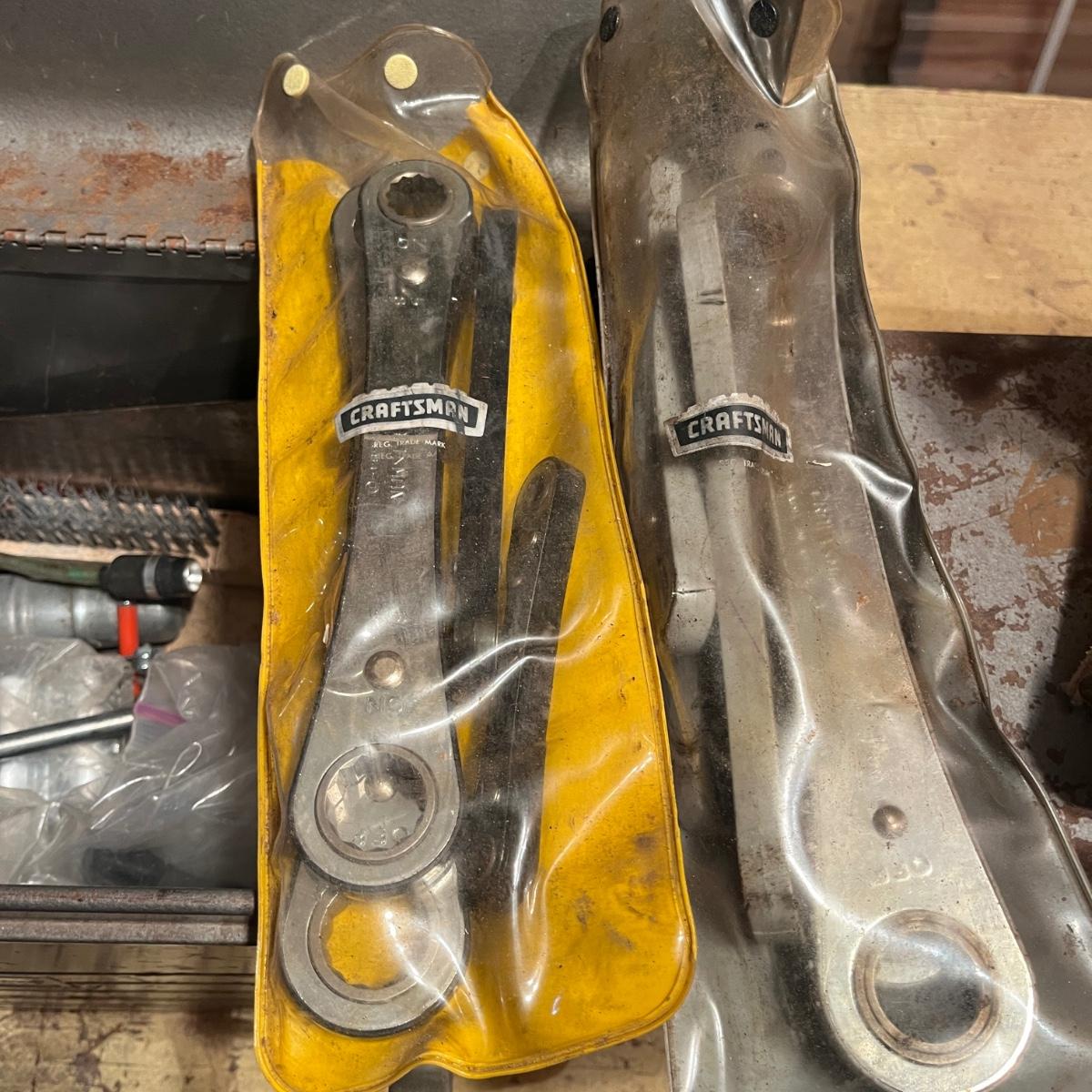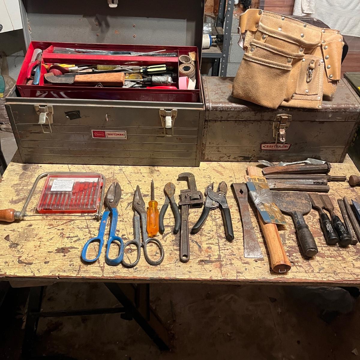 Lot includes two metal Craftsman toolboxes and a variety of tools including chisels, hammer, Husky sockets with 1/3” drive ratchet, 3/8” & 1/4” stubby ratchets, screwdrivers, pliers, metal ammo box and more. Largest toolbox measures 8” x 20” x 9.5”H.
