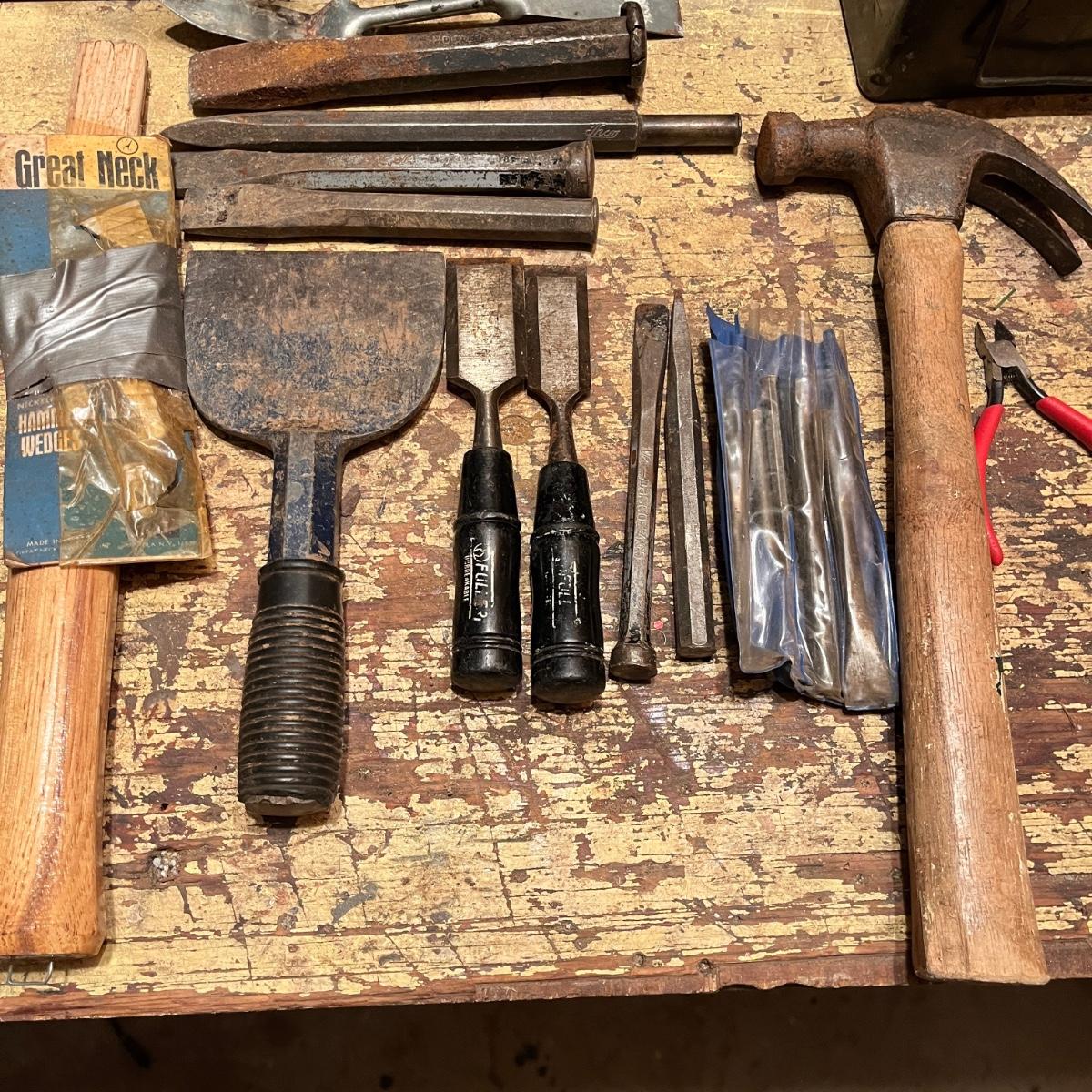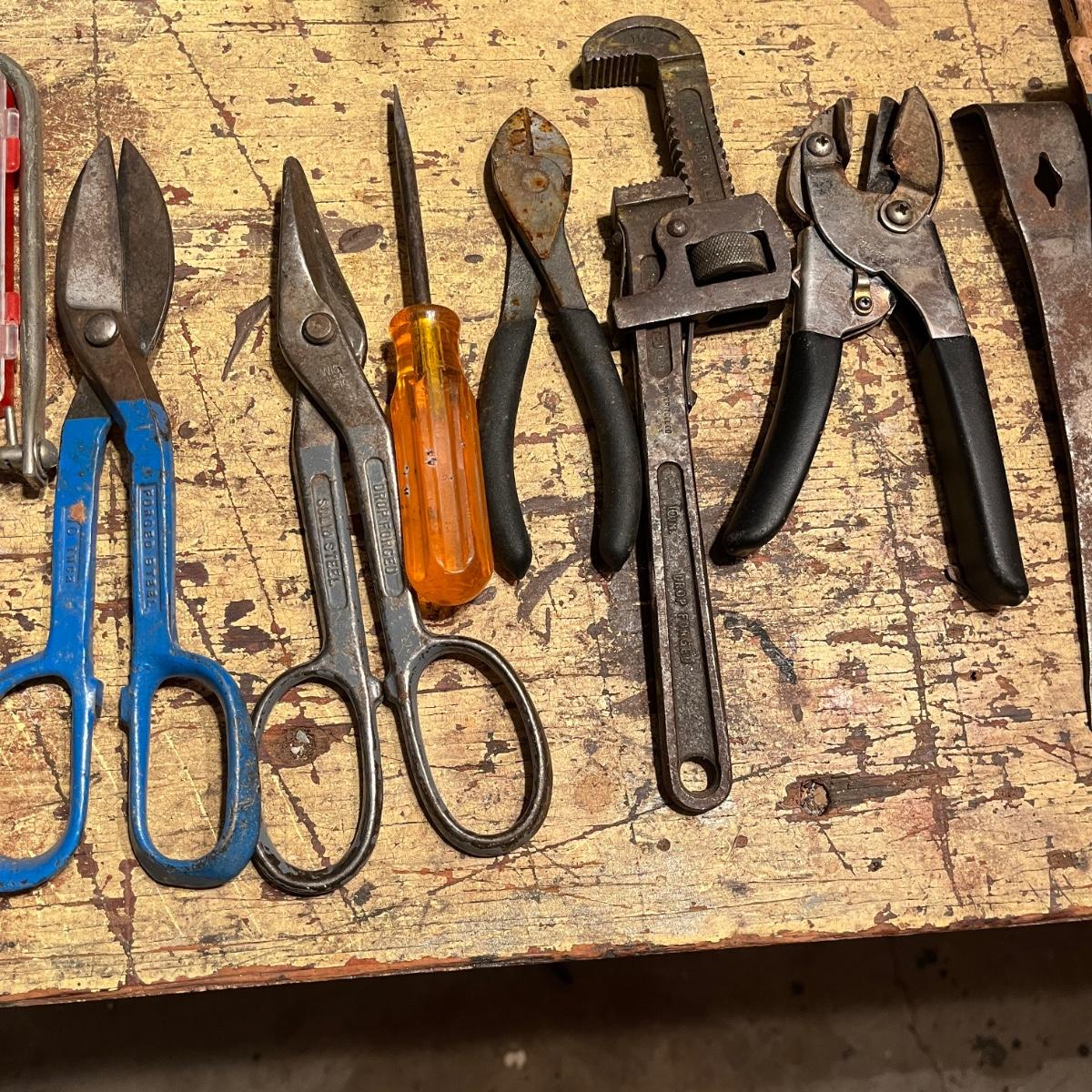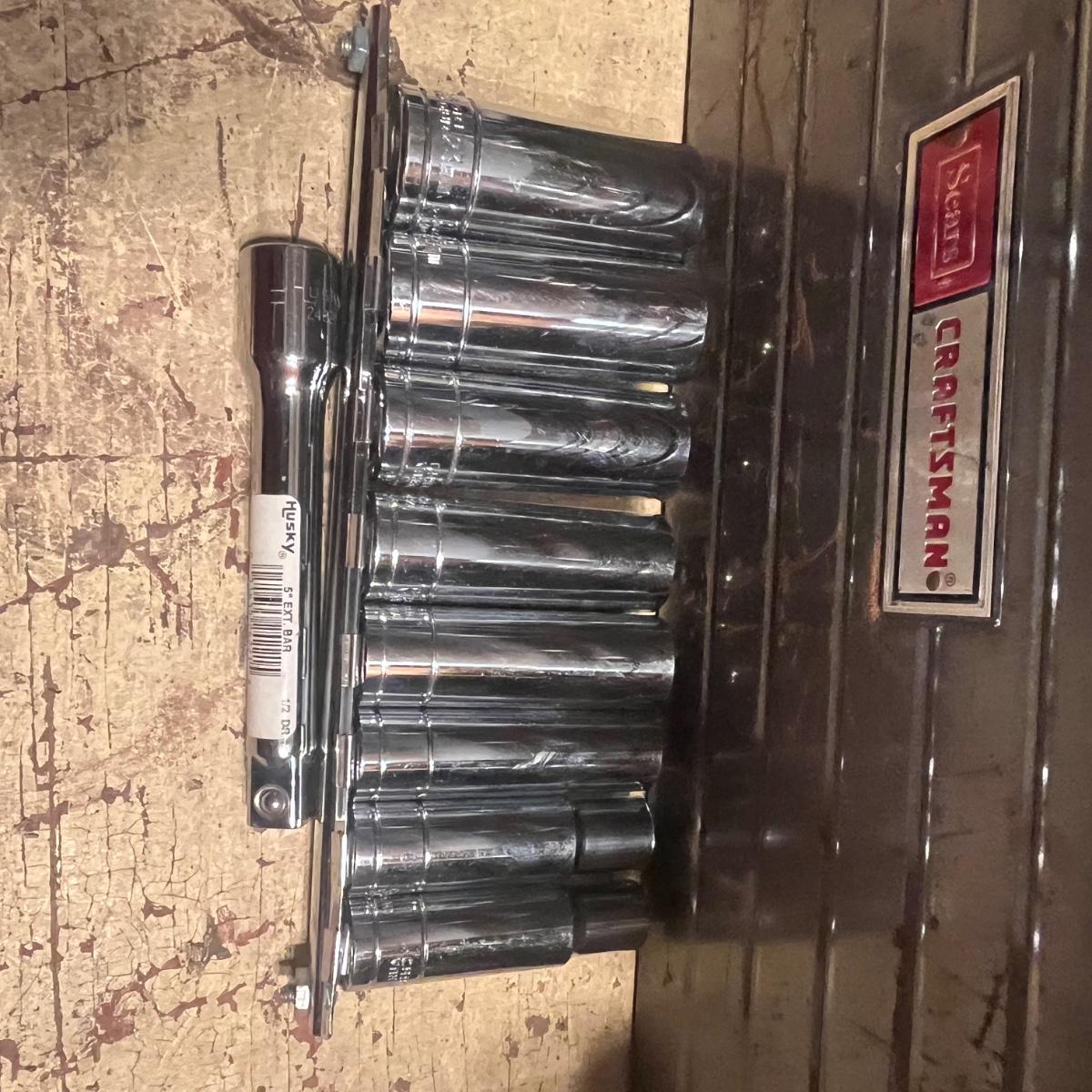 Lot includes two metal Craftsman toolboxes and a variety of tools including chisels, hammer, Husky sockets with 1/3” drive ratchet, 3/8” & 1/4” stubby ratchets, screwdrivers, pliers, metal ammo box and more. Largest toolbox measures 8” x 20” x 9.5”H.