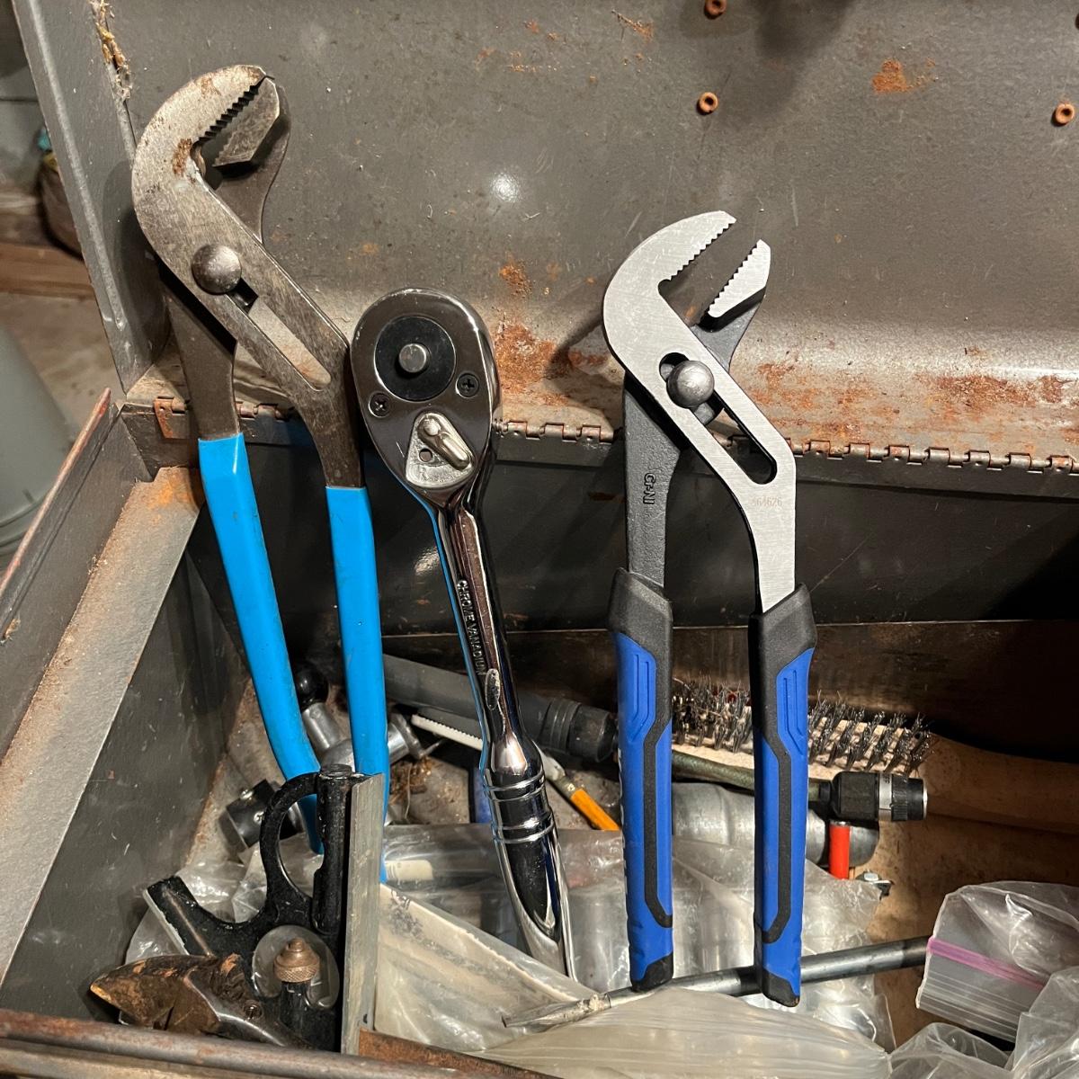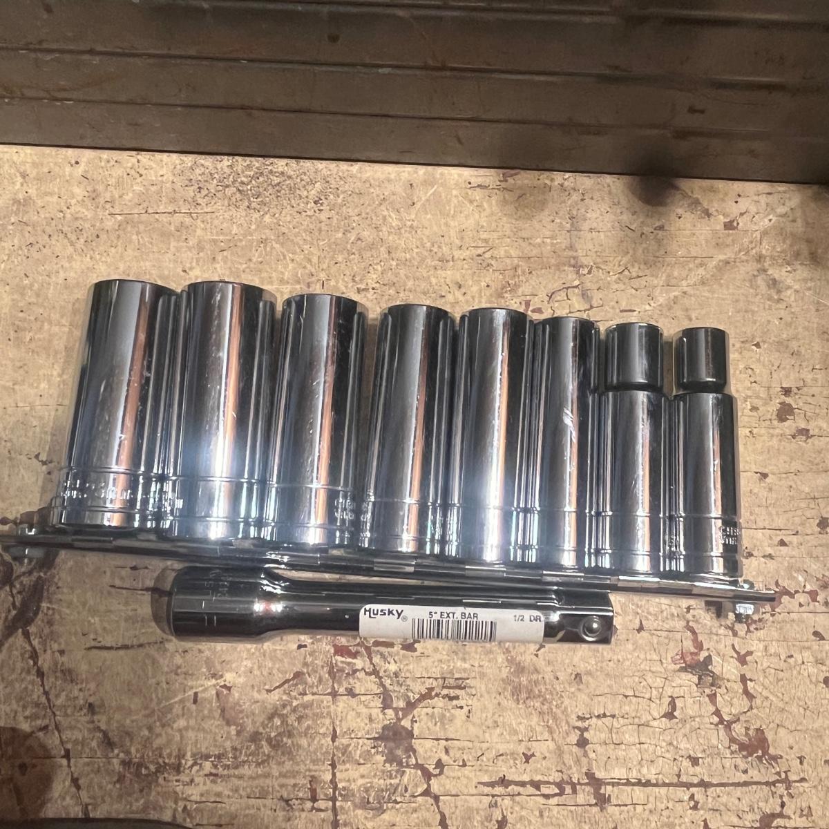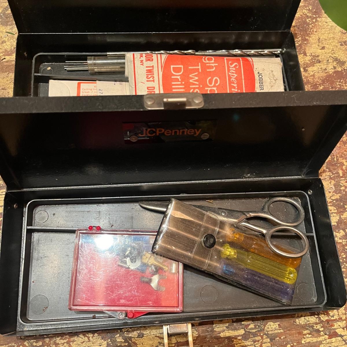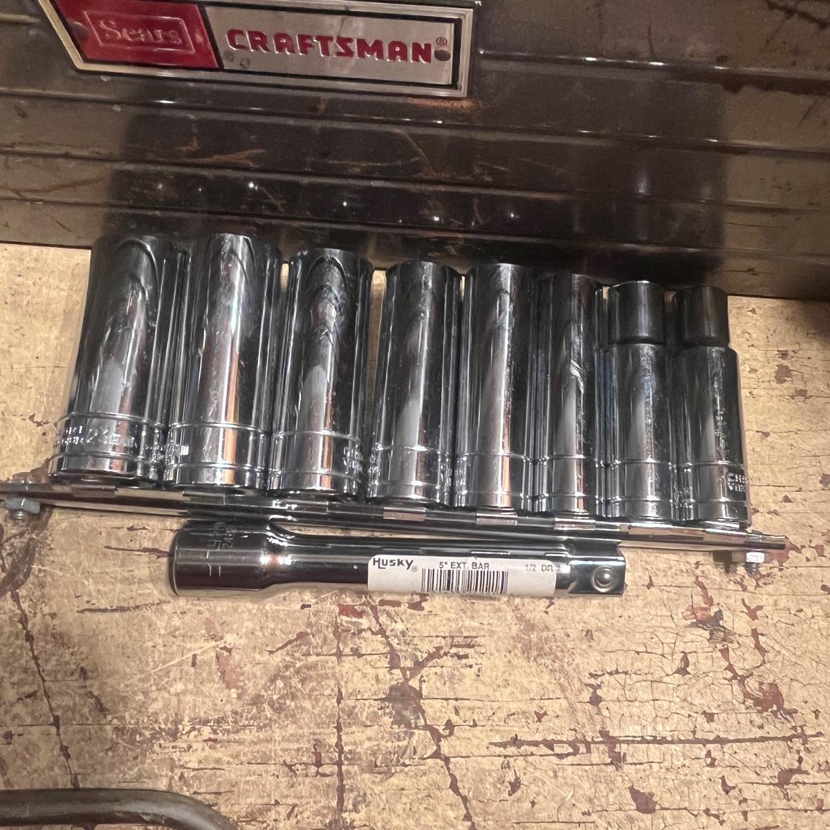 Lot includes two metal Craftsman toolboxes and a variety of tools including chisels, hammer, Husky sockets with 1/3” drive ratchet, 3/8” & 1/4” stubby ratchets, screwdrivers, pliers, metal ammo box and more. Largest toolbox measures 8” x 20” x 9.5”H.