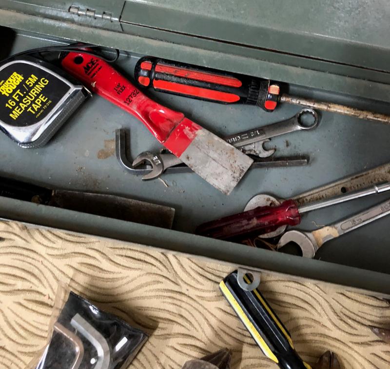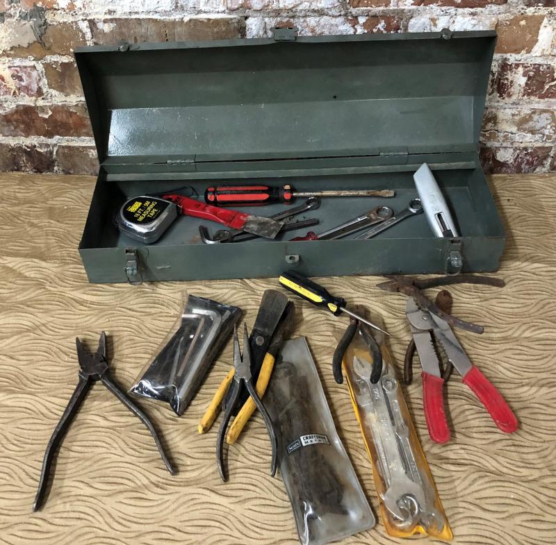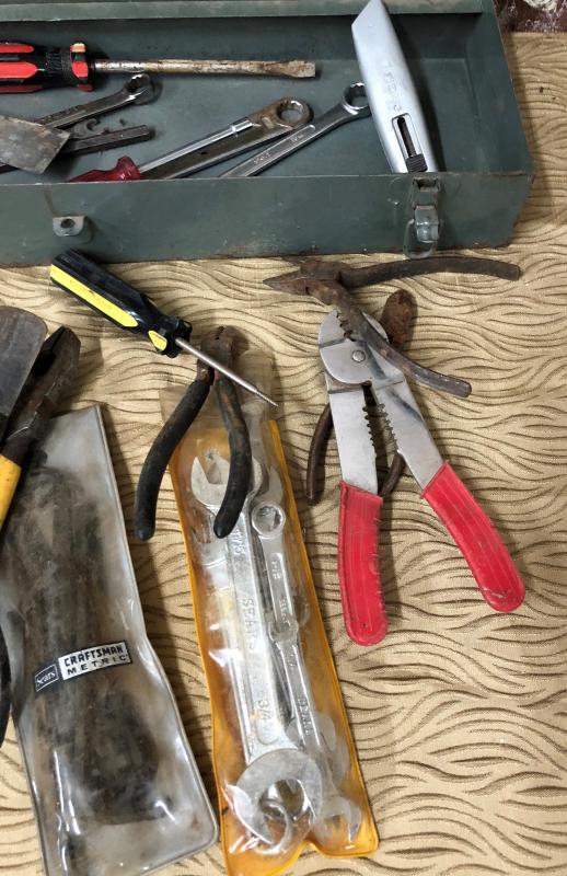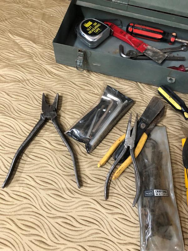 Nice lot of useful household tools as shown with metal Craftsman toolbox...
