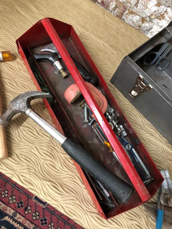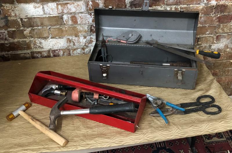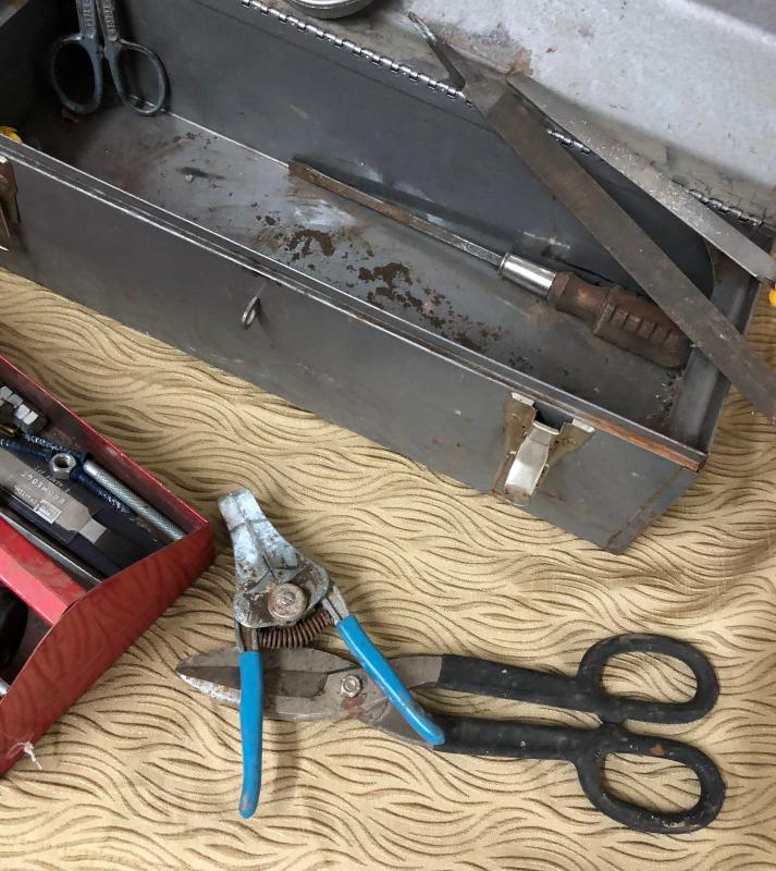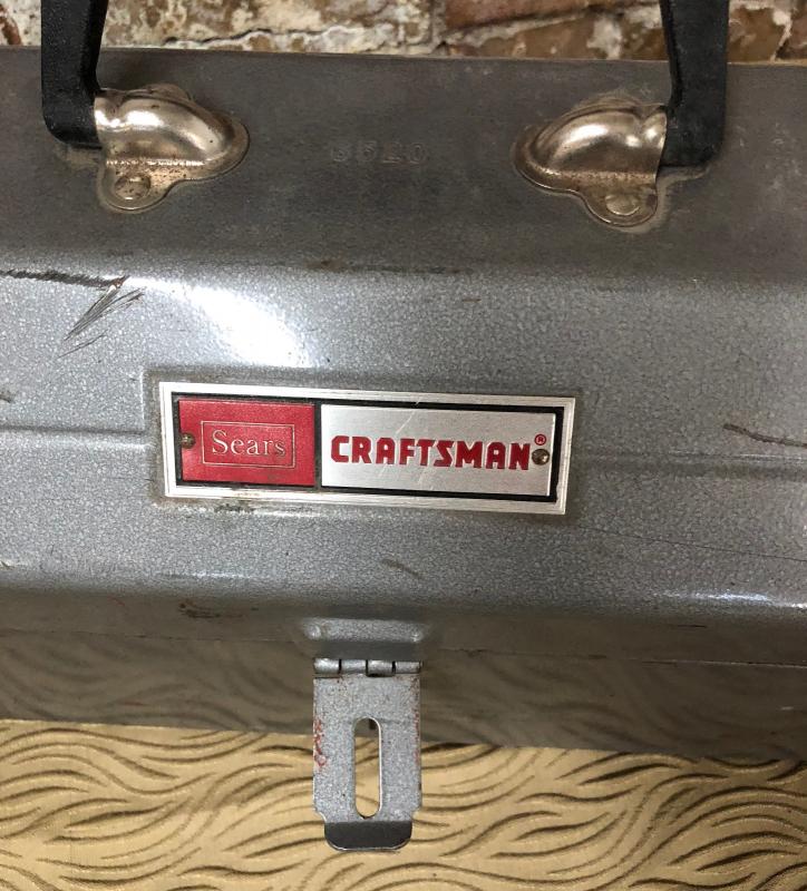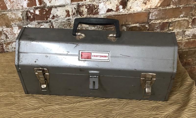 As shown a metal Craftsman tool box with snips, hammers, file, etc...