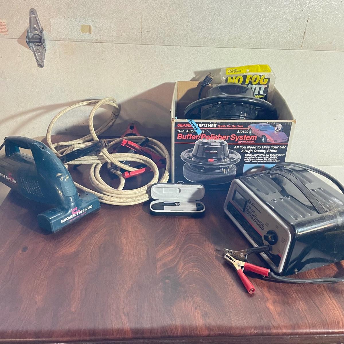 Car care lot. Craftsman Buffer/Polisher by Waxcoa with one bonnet and original box, Schumacher Fully Automatic Starter Charger, jumper cables and more. Vacuum powered on when plugged in. Accutire pressure gauge did not appear to work. See images. Local pick up only.