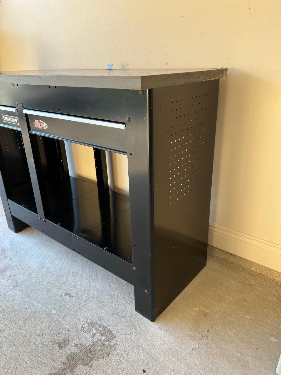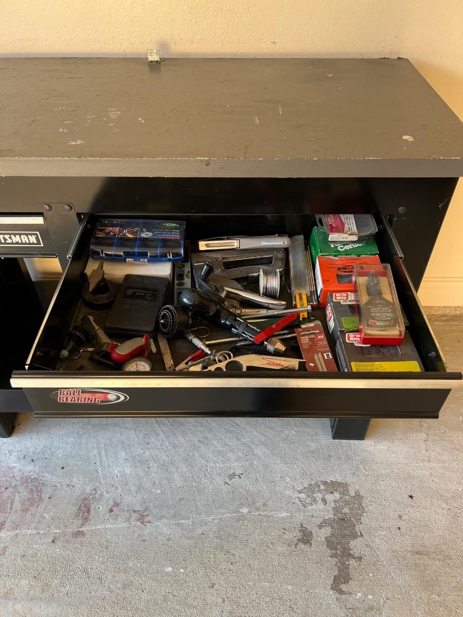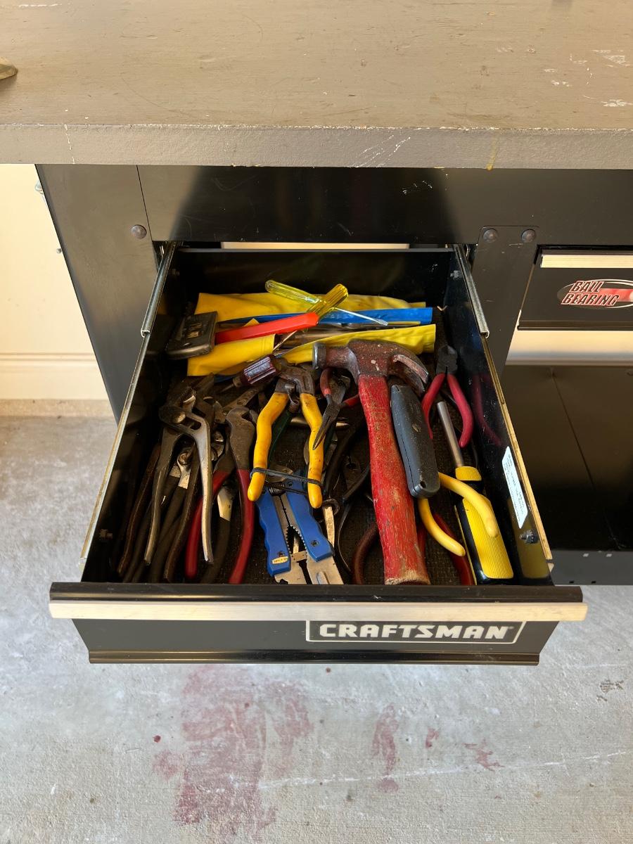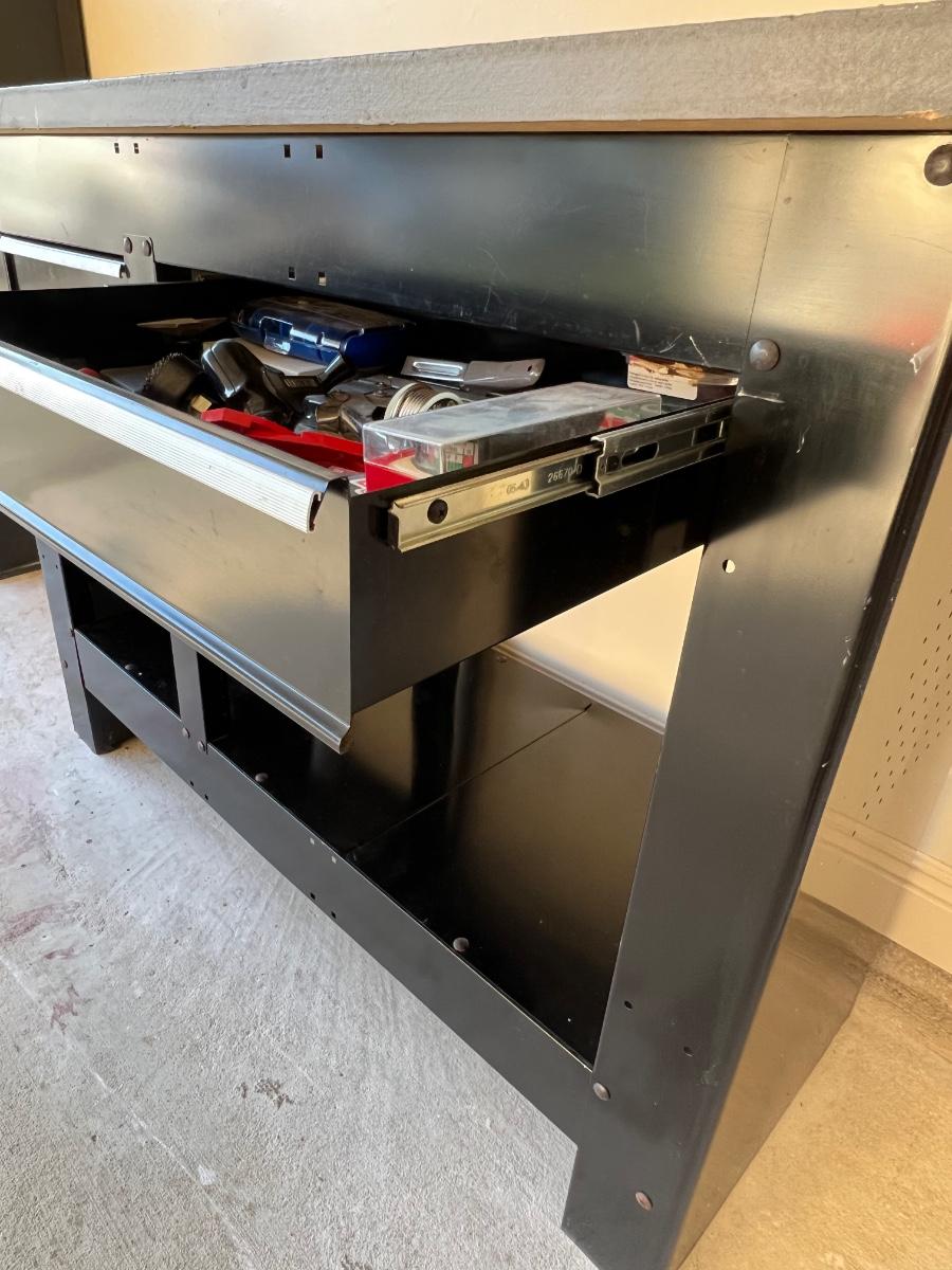 Awesome work and storage center. Comes with 5 adjustable C-Clamps along with all the tools inside the drawers. See Photos. Normal wear. ** Forgot to take the measurements. Will get that and post ASAP