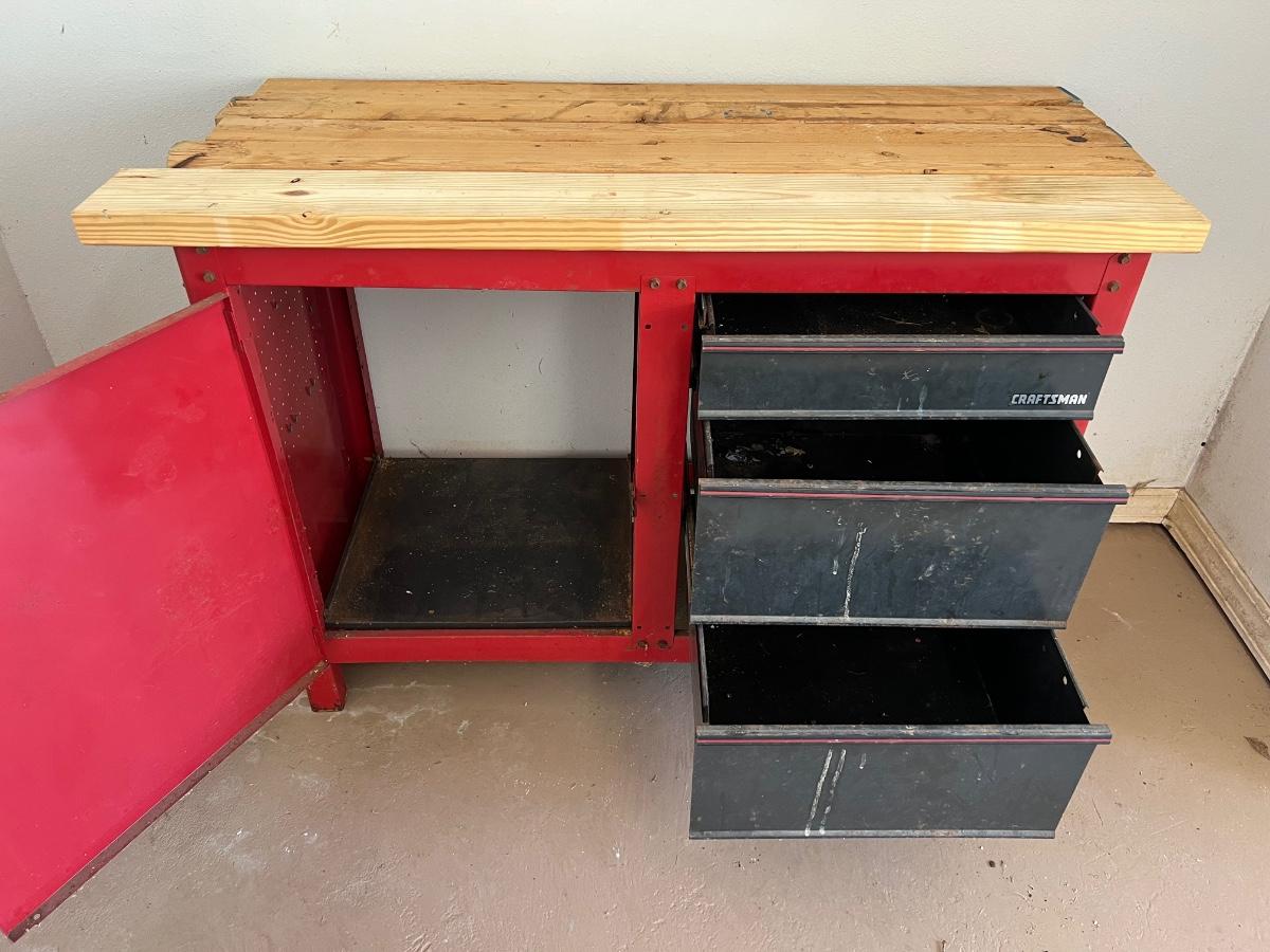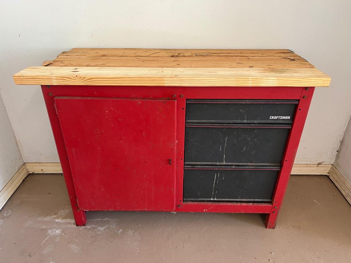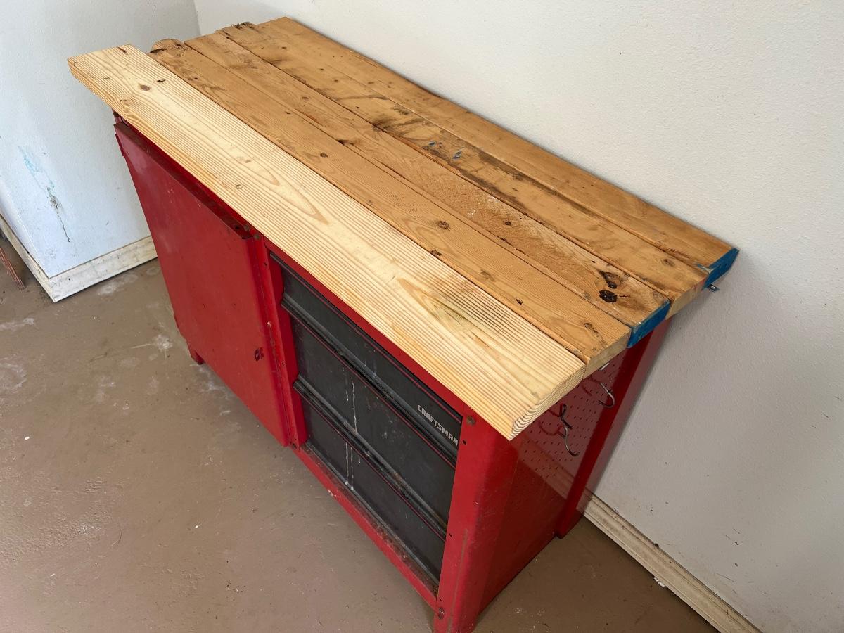 Craftsman work bench with homemade top. Top is on there solid but one side does not have even board lengths. Door and drawers work as they should. See pictures for condition. Base measures 44”W x 18”D x 33”T.