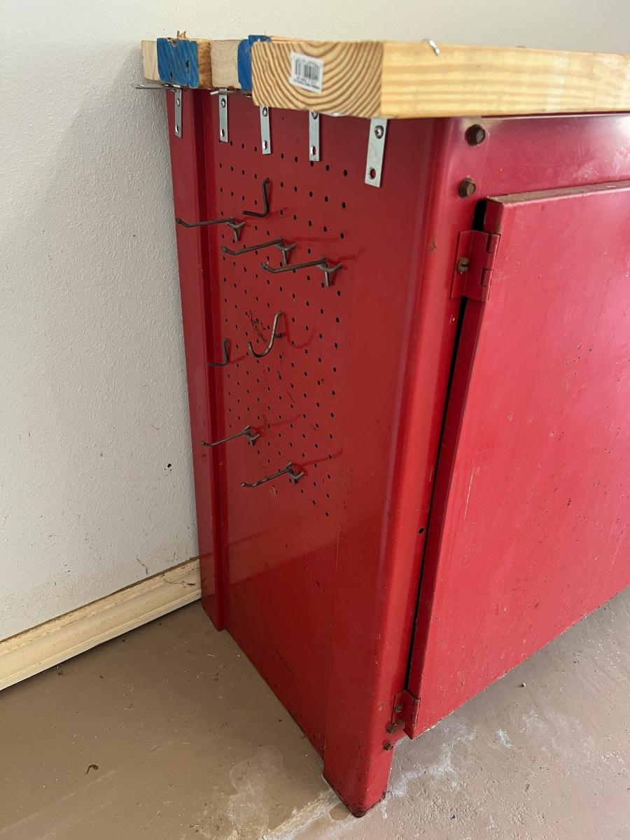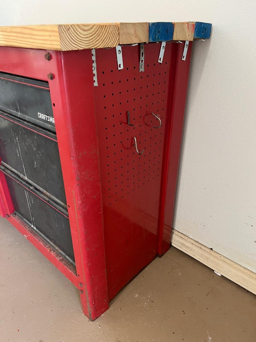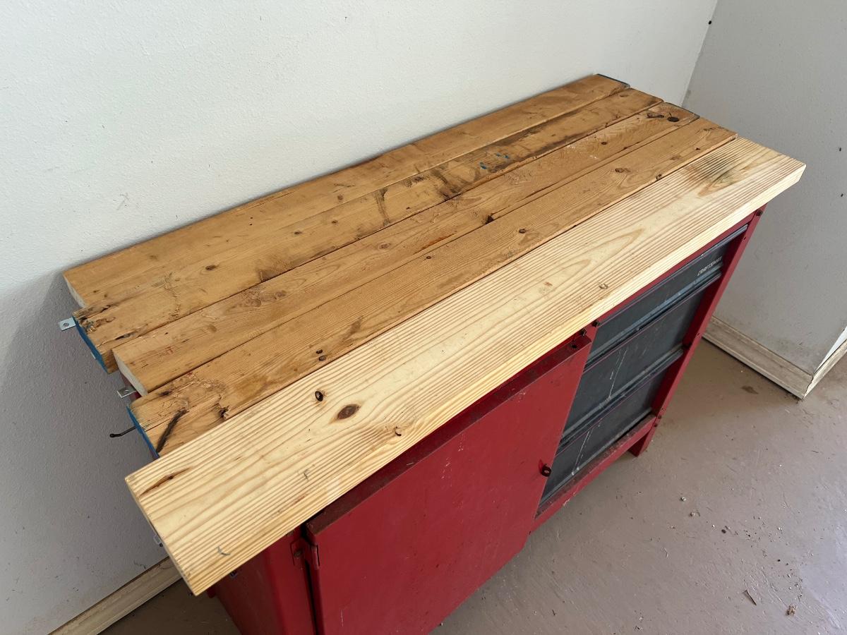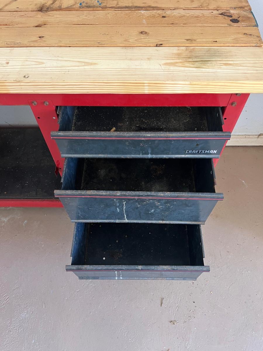 Craftsman work bench with homemade top. Top is on there solid but one side does not have even board lengths. Door and drawers work as they should. See pictures for condition. Base measures 44”W x 18”D x 33”T.