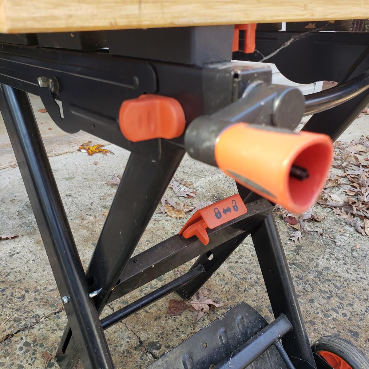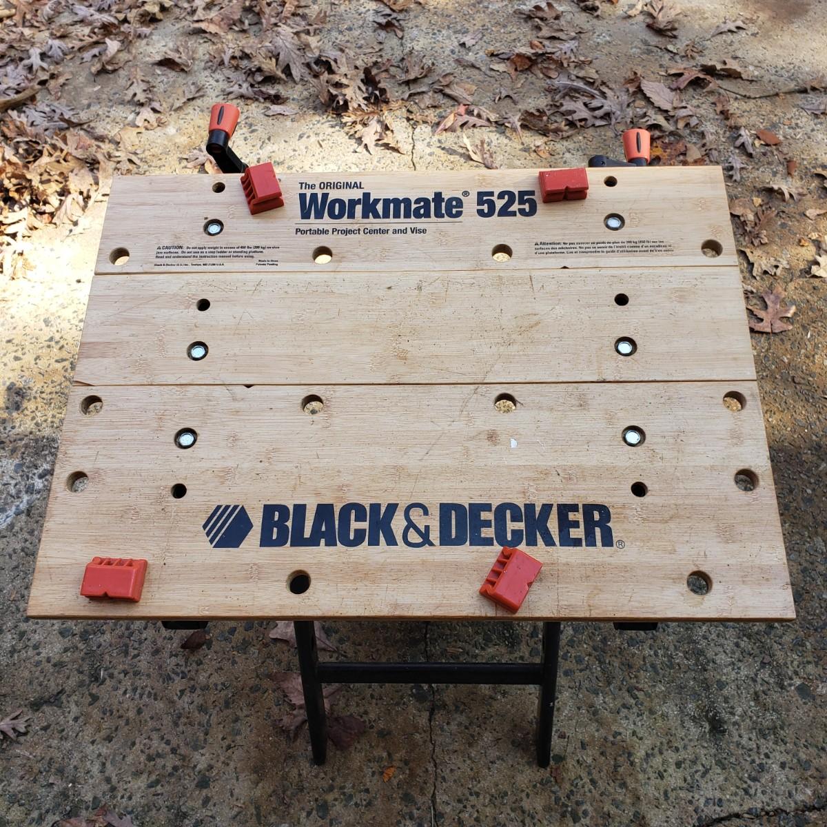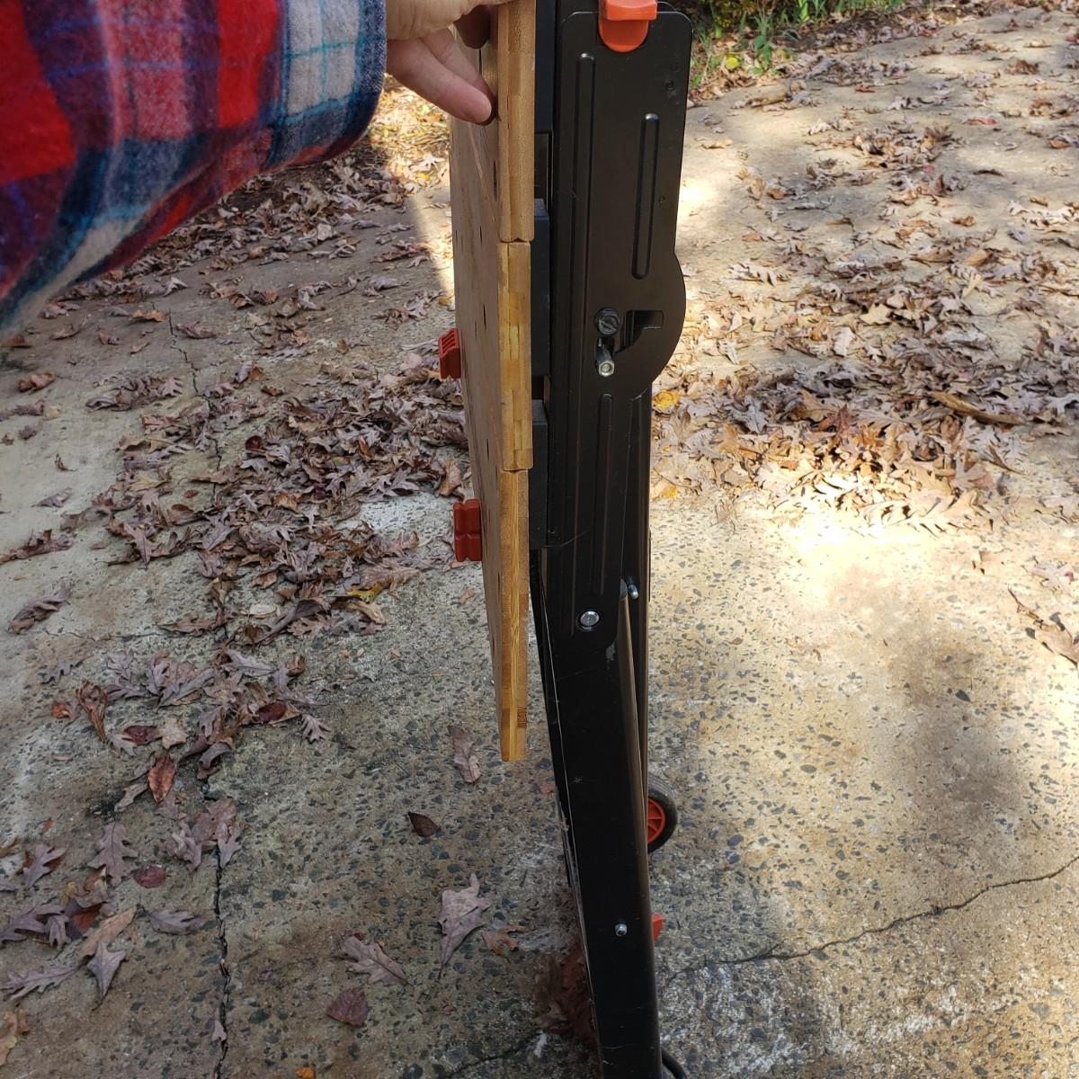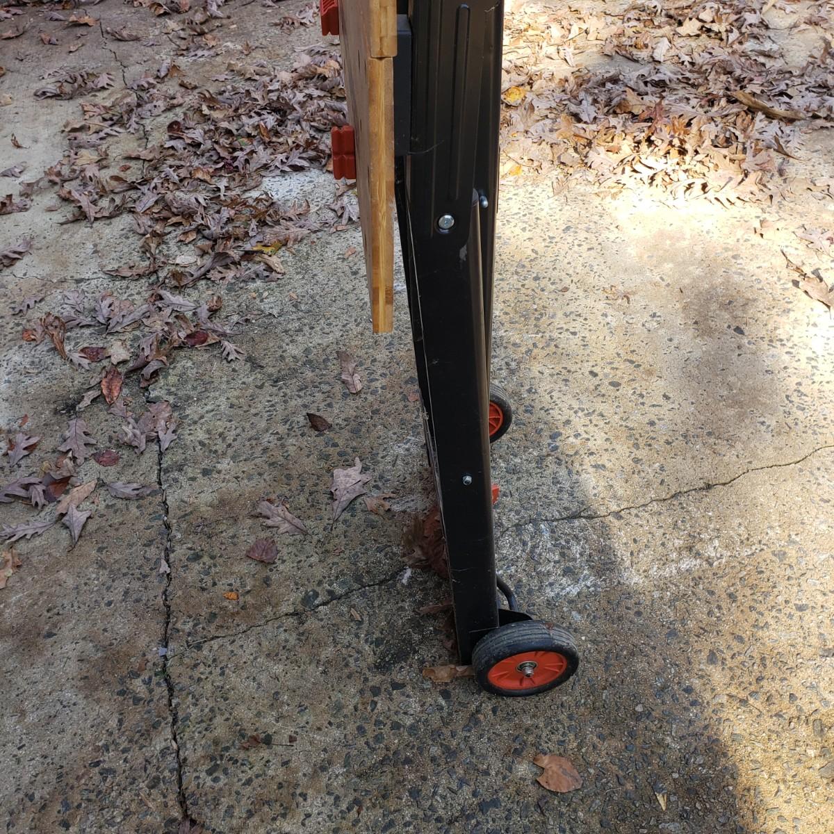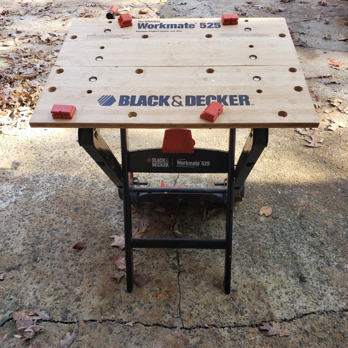 This is a Craftsman Workmate 525 fold up workbench and Dolly all in one. It has wheels for easy movement. Folds down and up easily and can be stored against the wall flat. Measures 18" x 30" as pictured. It is adjustable.