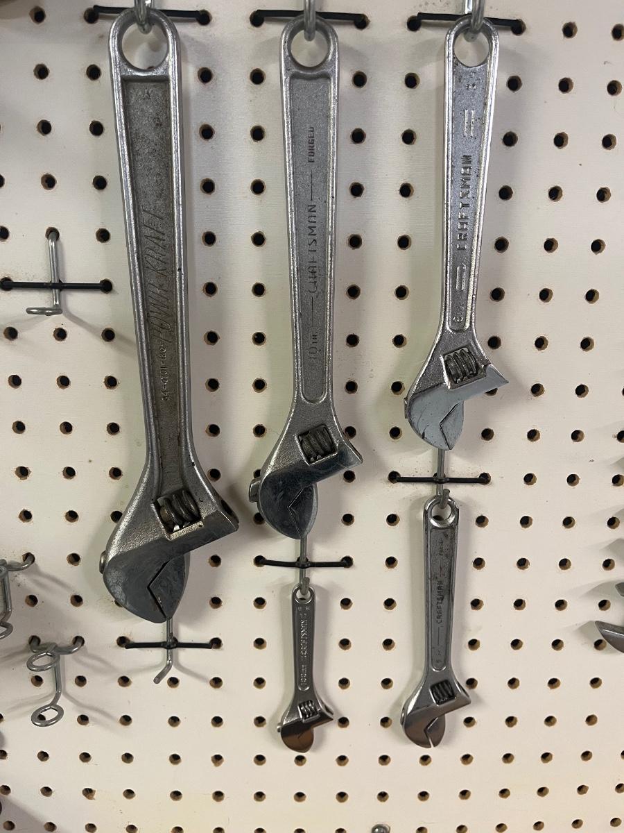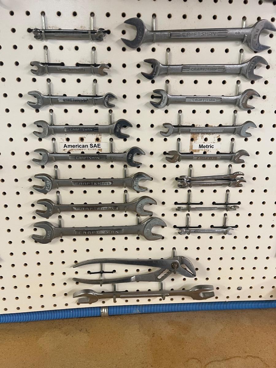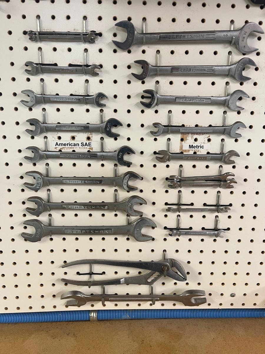 Lot includes over forty wrench’s in both SAE and metric with most being Craftsman. Also includes seven adjustable wrenches and a set of ignition wrenches. Pegboard not included.