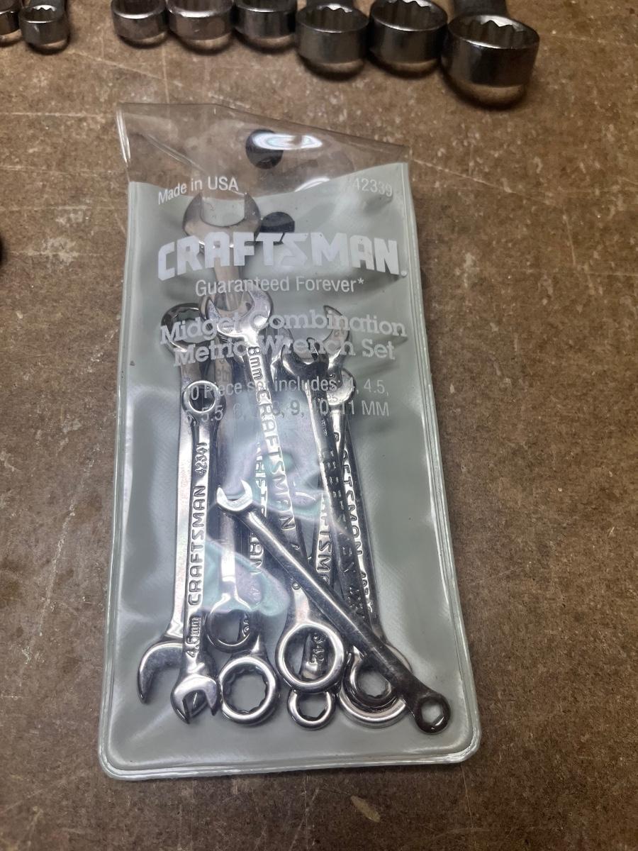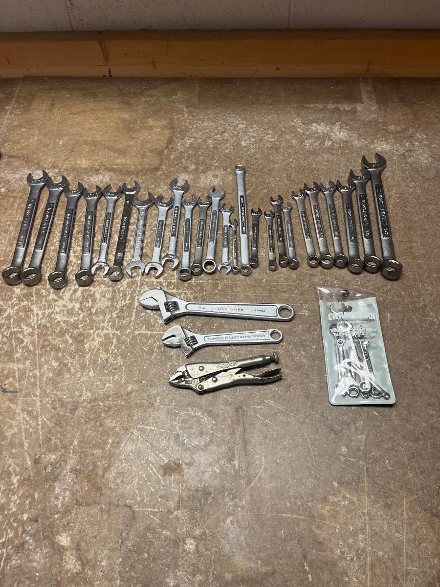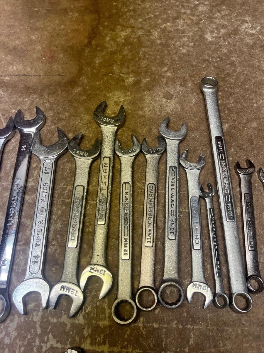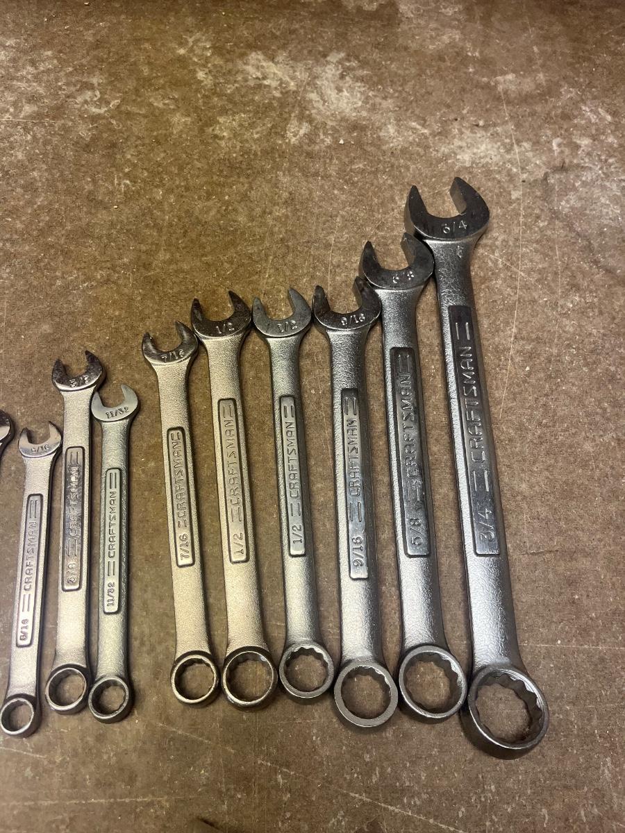 Lot includes over forty wrench’s in both SAE and metric with most being Craftsman. Also includes seven adjustable wrenches and a set of ignition wrenches. Pegboard not included.