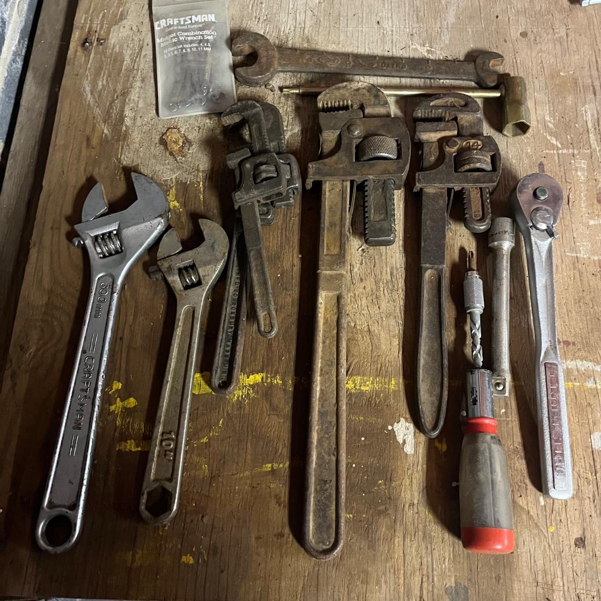 Lot includes Craftsman 1/2” drive ratchet with an assortment of Craftsman and other brand sockets and extensions, Craftsman wrenches in SAE sizes and unbranded metric wrenches. Also includes pipe wrenches and adjustable wrenches and distributor wrench. Largest pipe wrench measures 18” long.