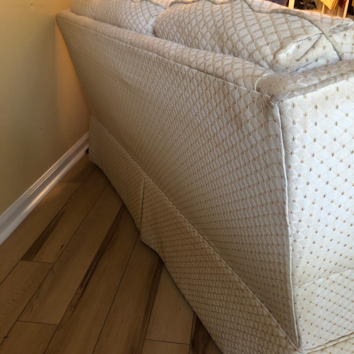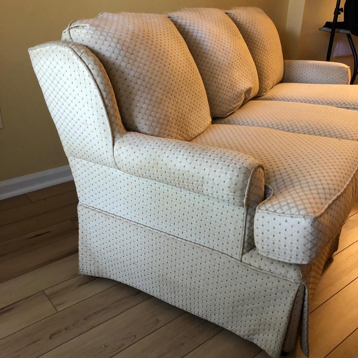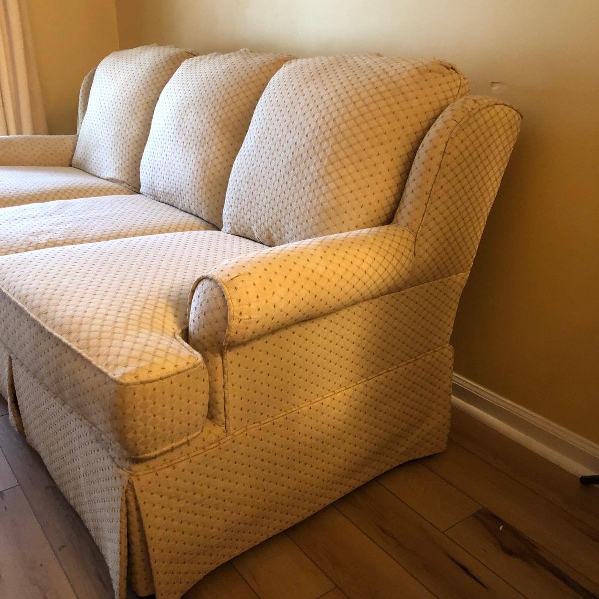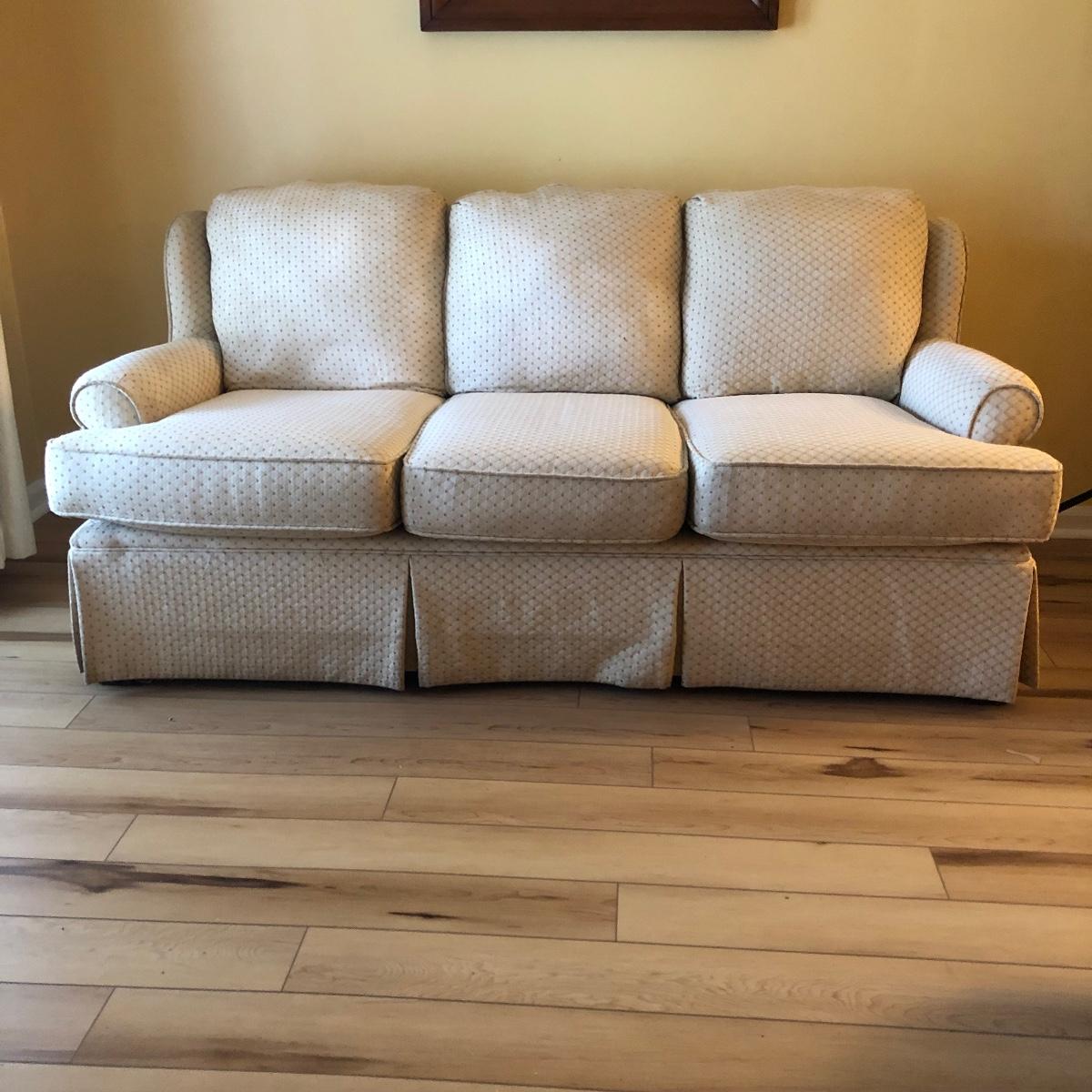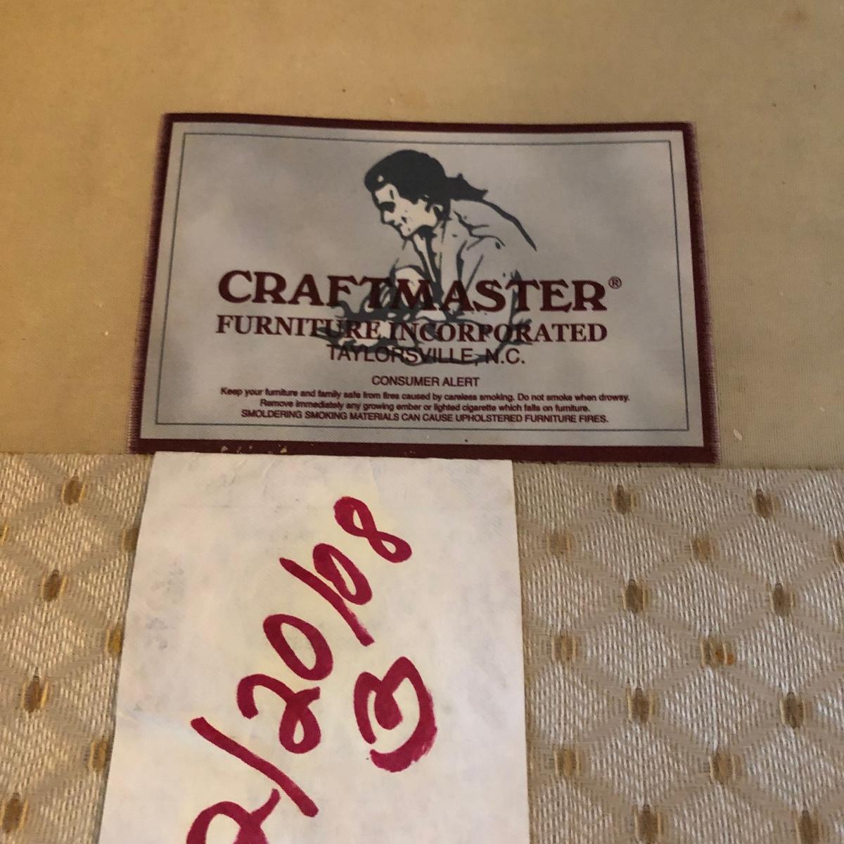 Lot includes a fabric Craftsmaster sofa with wooden legs. Sofa has a few small spots, see pictures. Sofa measures 34” x 72” x 31” with a 19” seat height. Bring help item is substantial. Please note this was a smoking home.