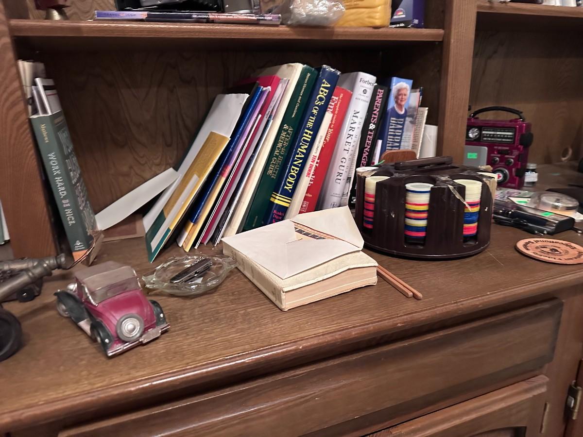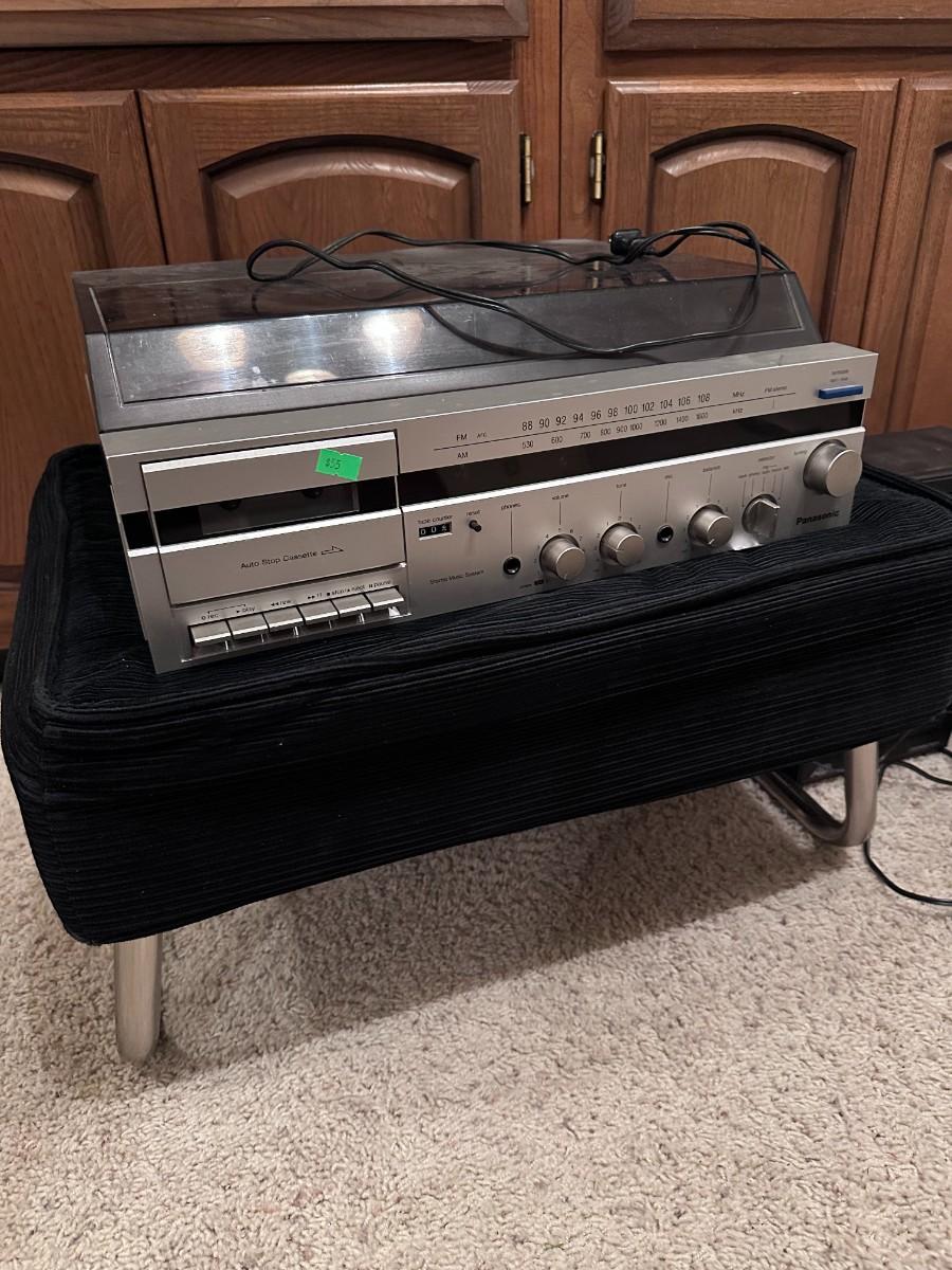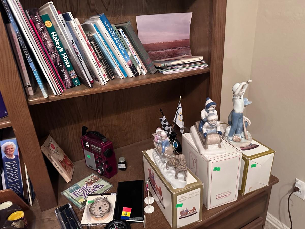Books, figurines, safari hat, 2 stereos, and vintage footstool