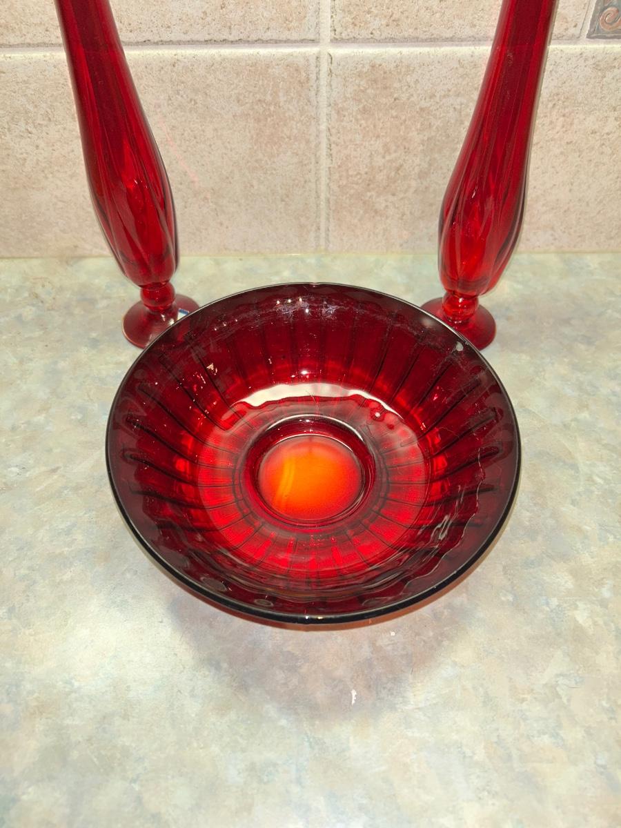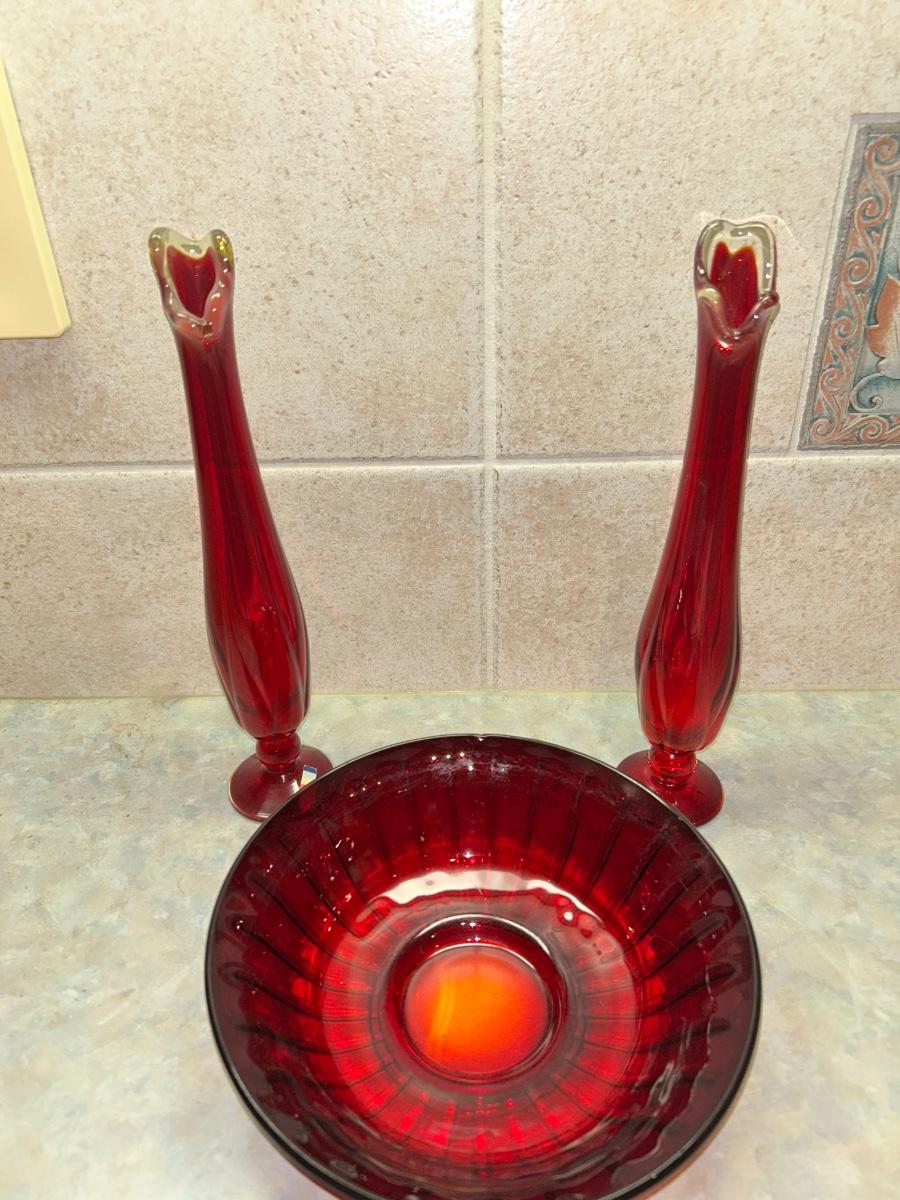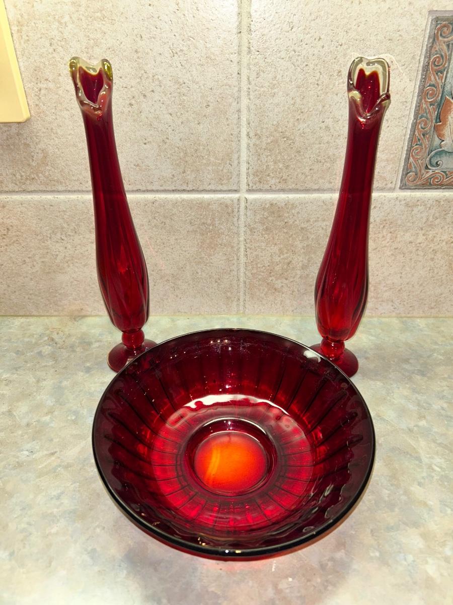 CRANBERRY COLORED FOSTORIA BUD VASES AND BOWL