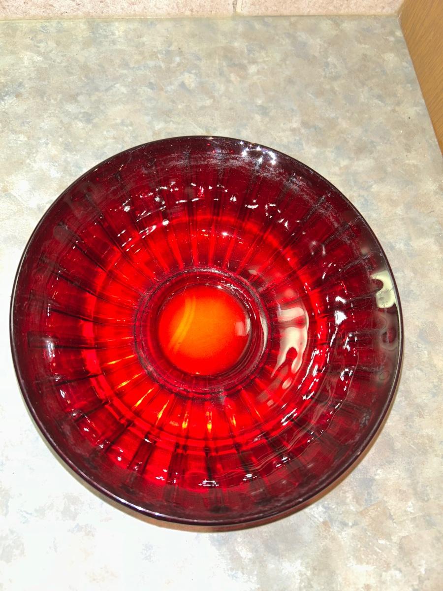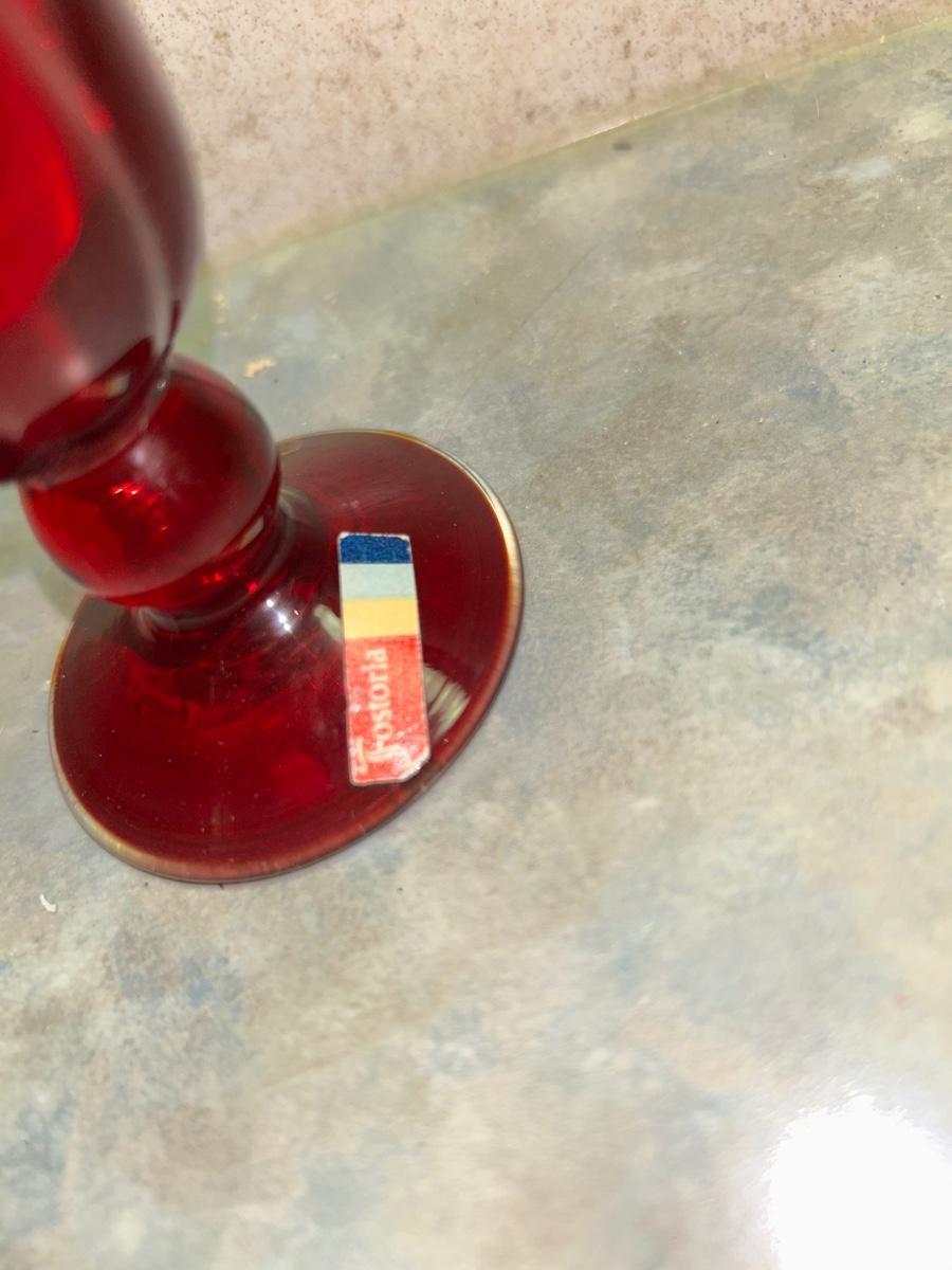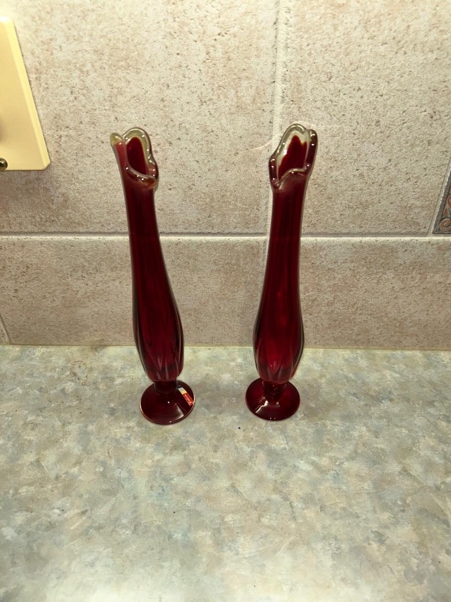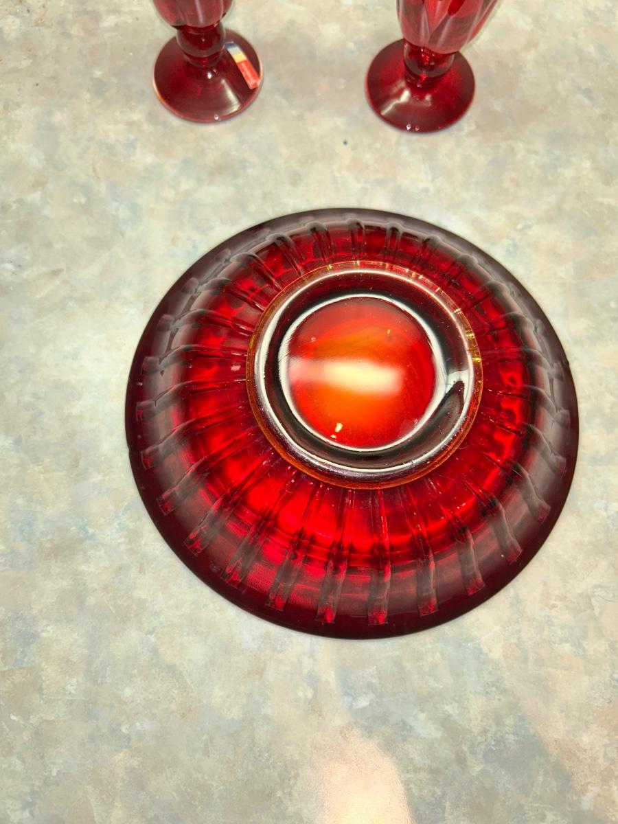 CRANBERRY COLORED FOSTORIA BUD VASES AND BOWL