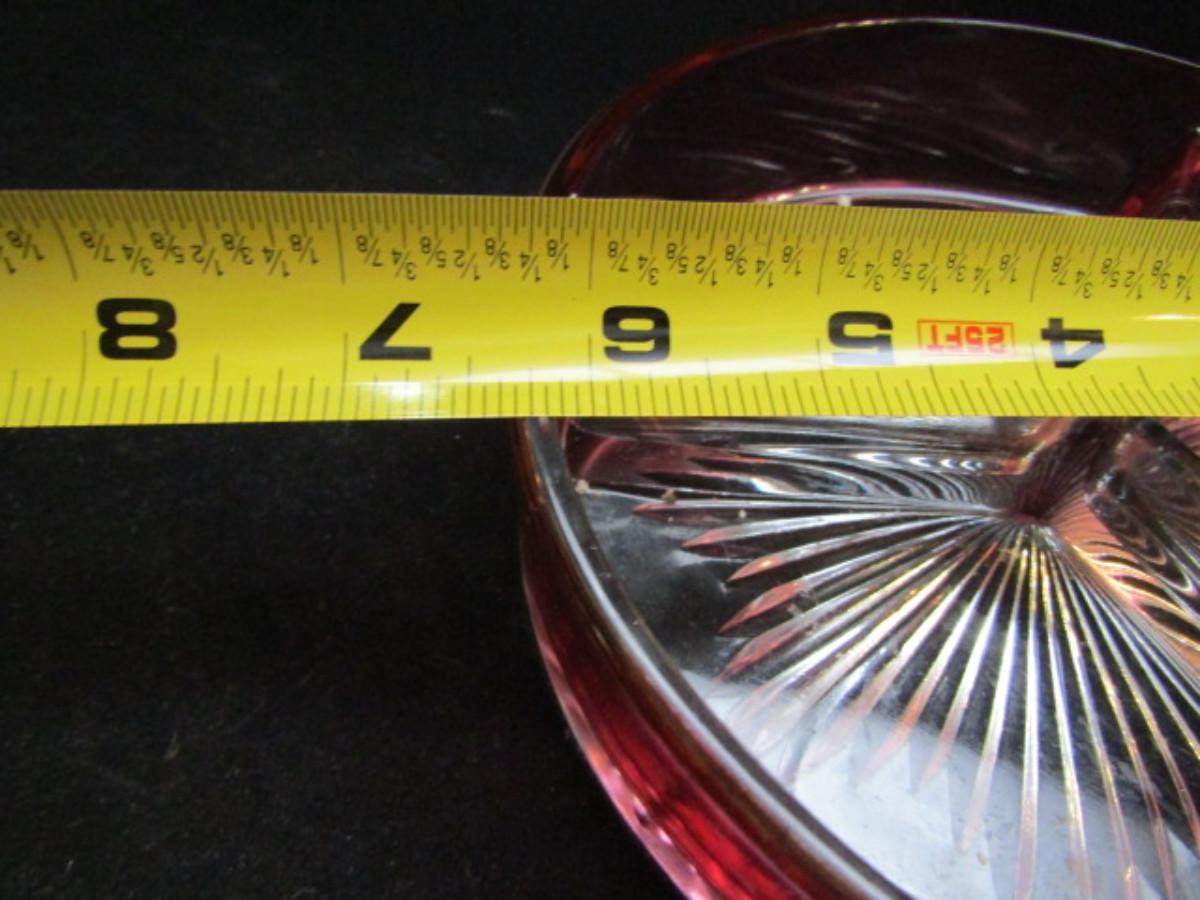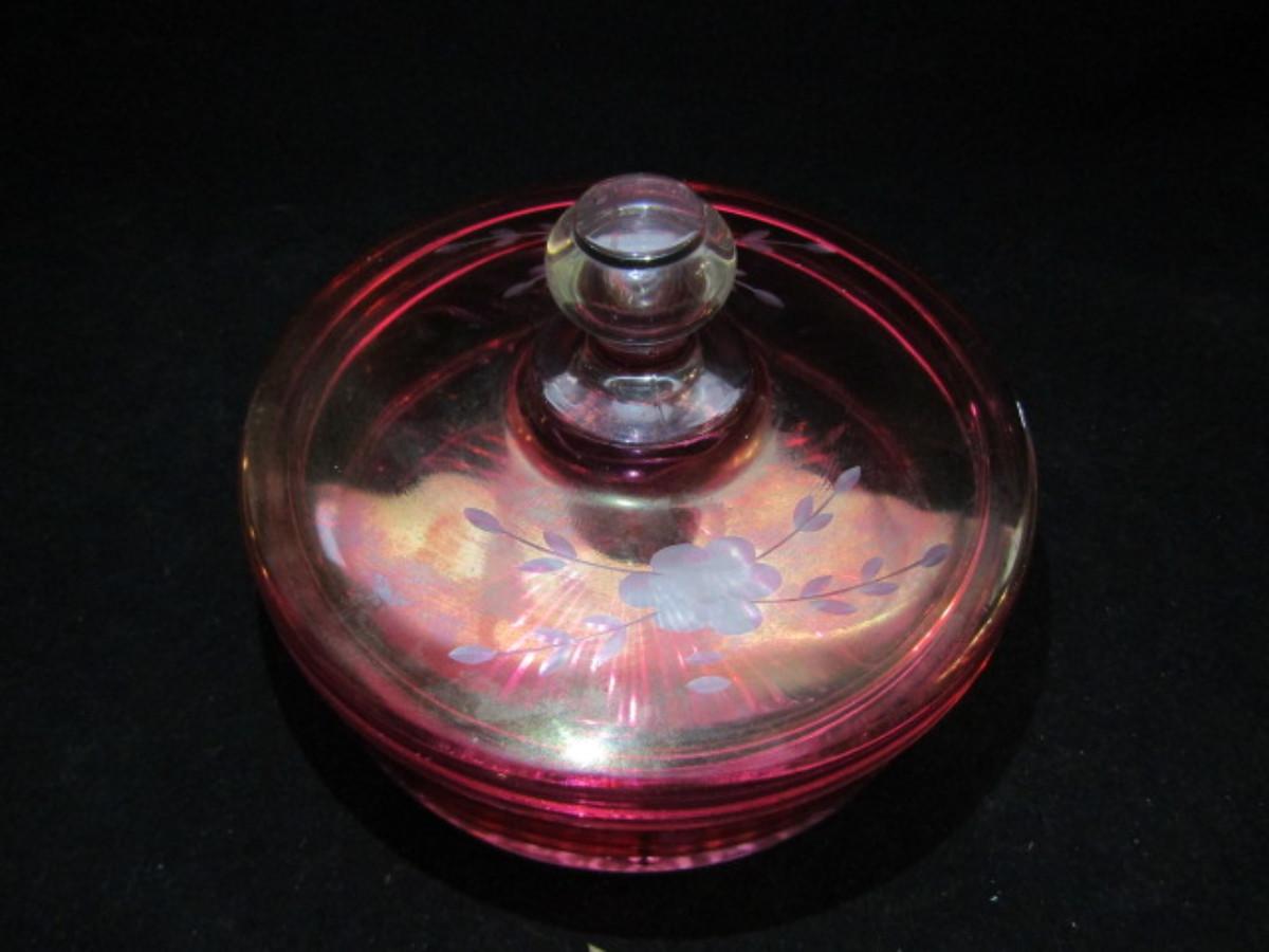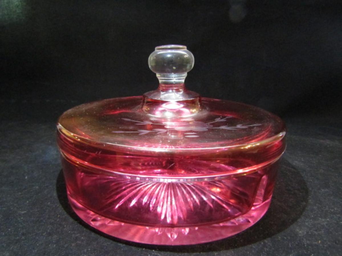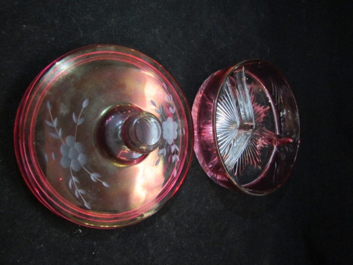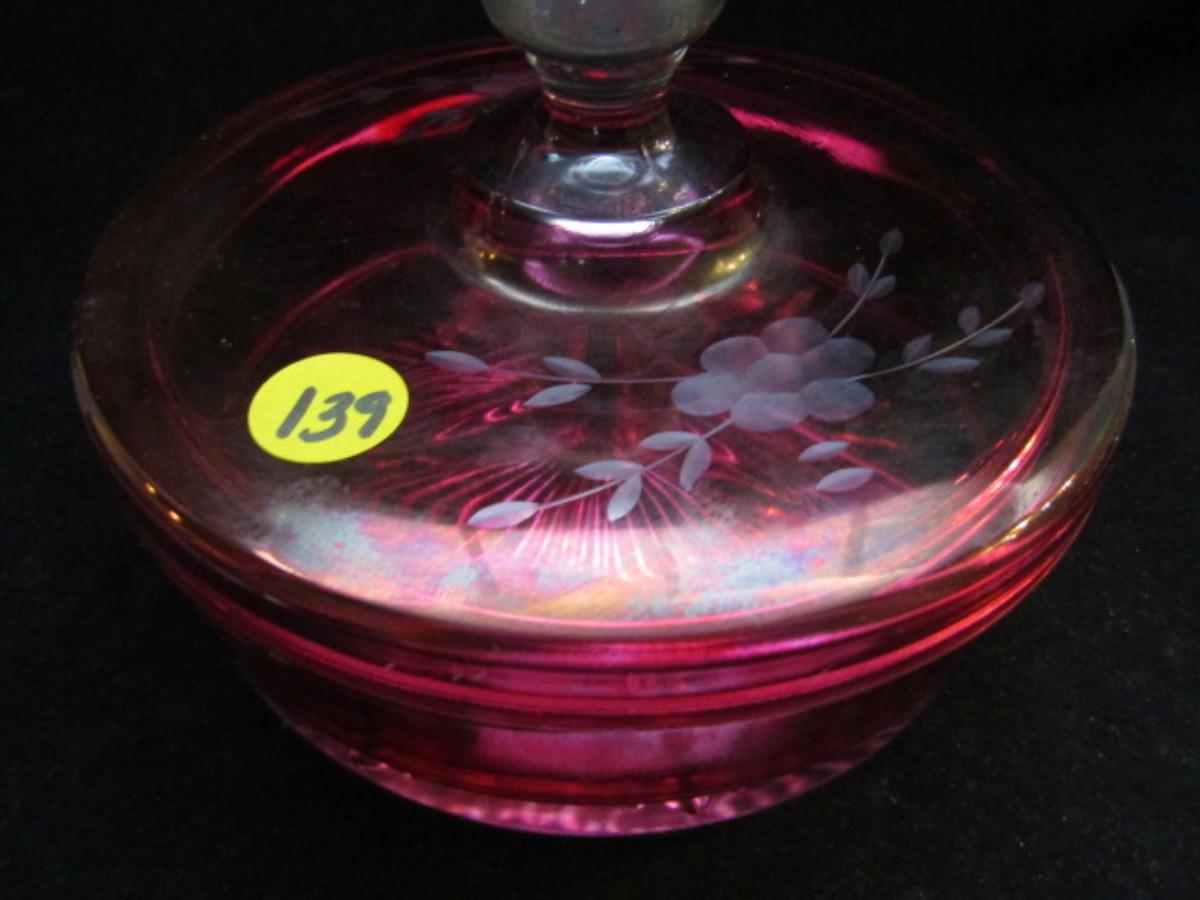 Cranberry Glass Covered Candy Dish with Etching (#139)