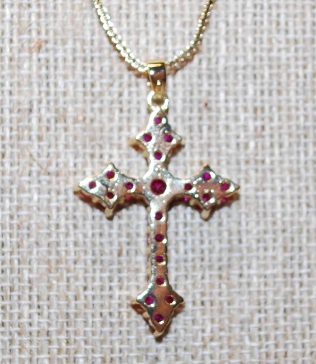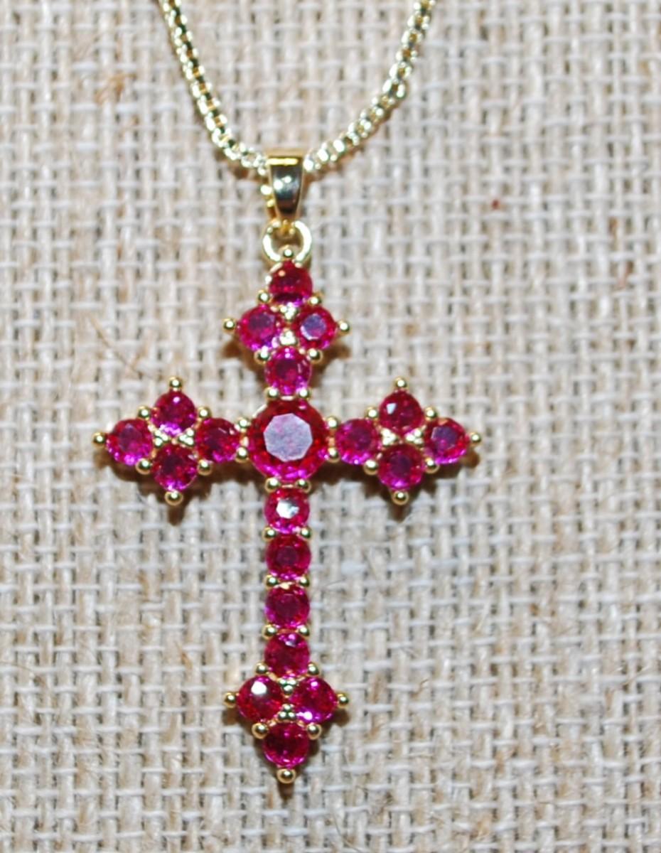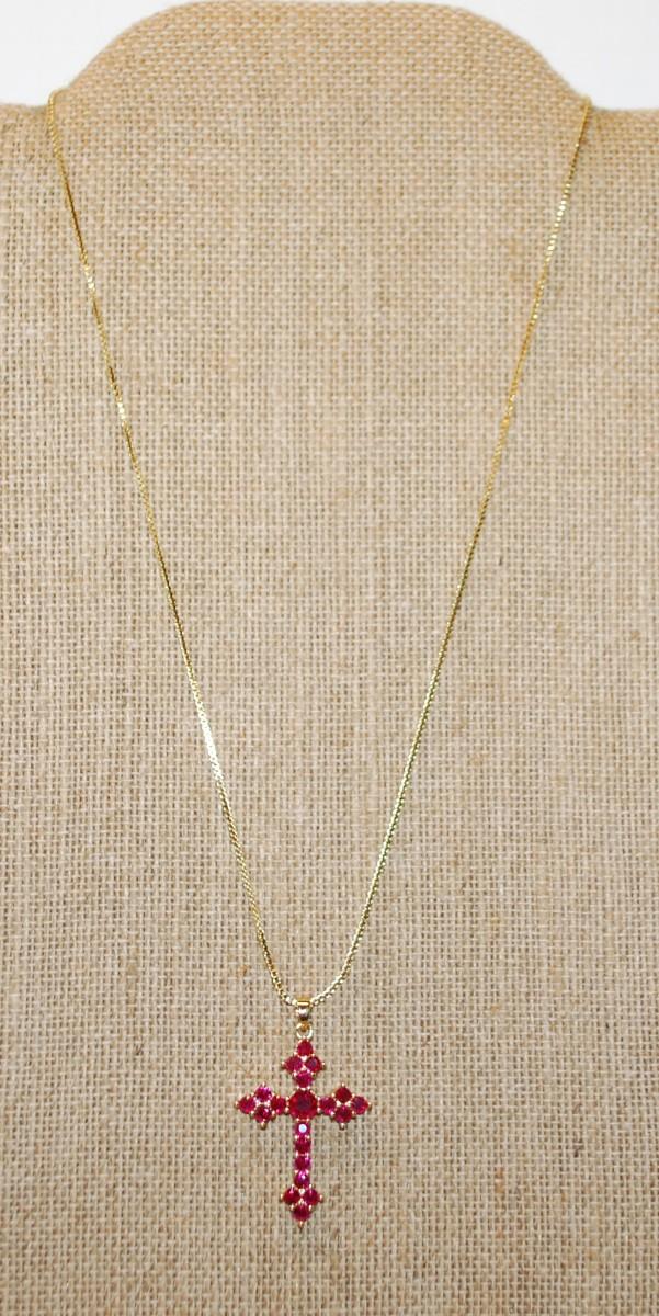 Cranberry Red Bejeweled Cross PENDANT (1½" x 1") on a Gold Tone Rope Necklace Chain 18" L
