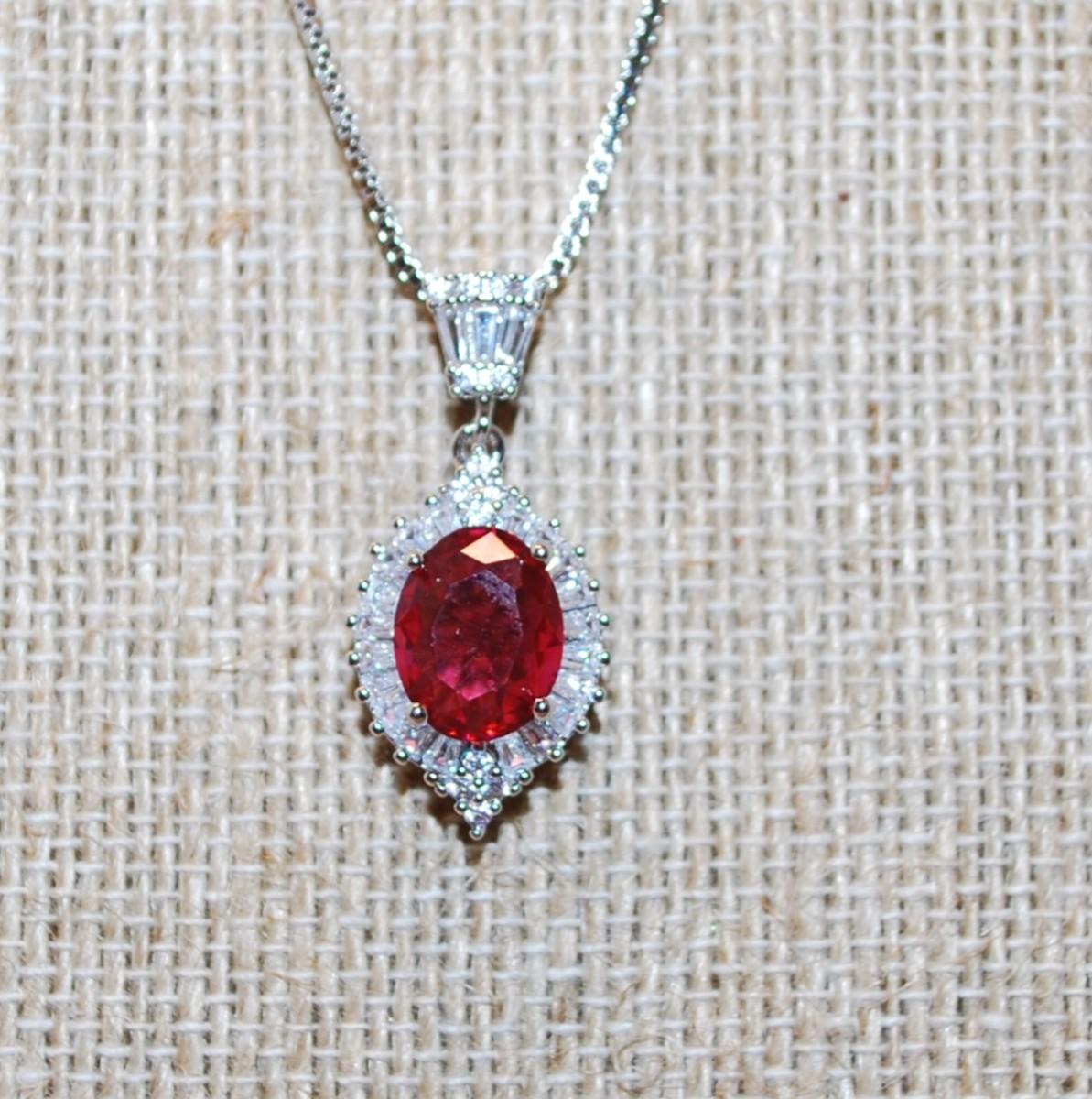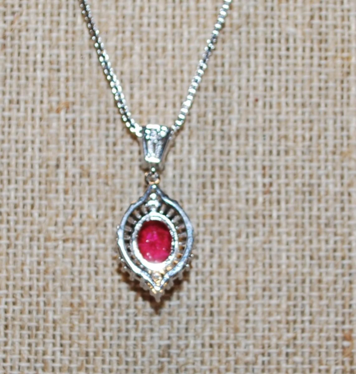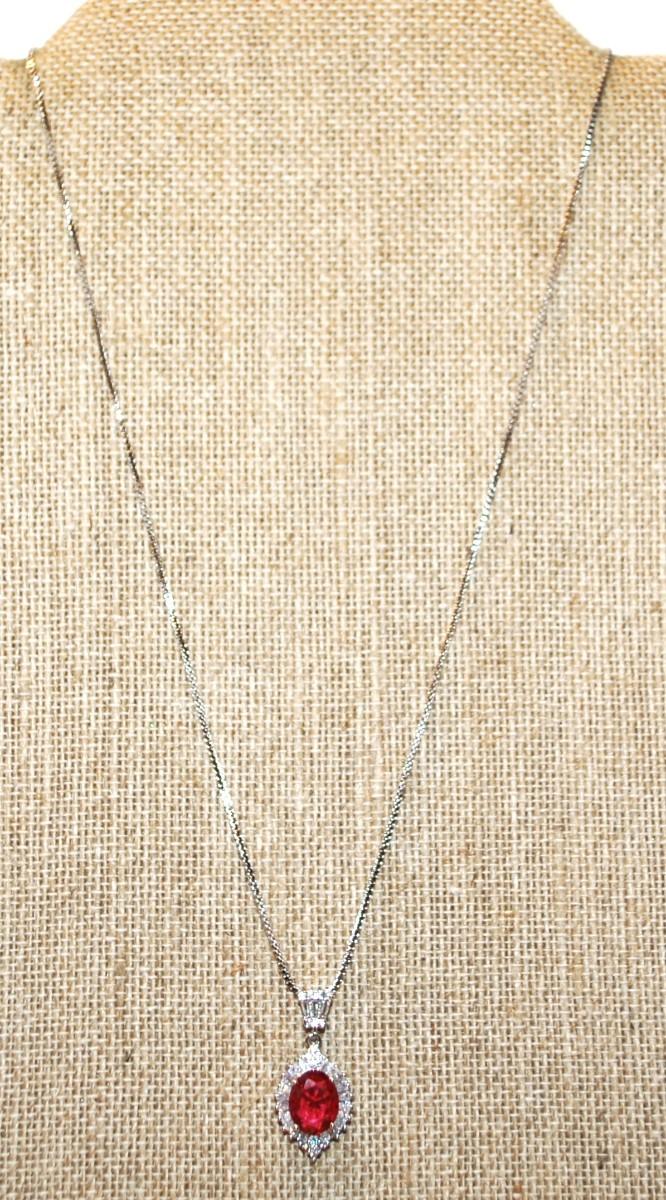Cranberry Red Oval Stone PENDANT (1" x ½") with Full Surrounds on a Silver Tone Necklace Chain 18" L