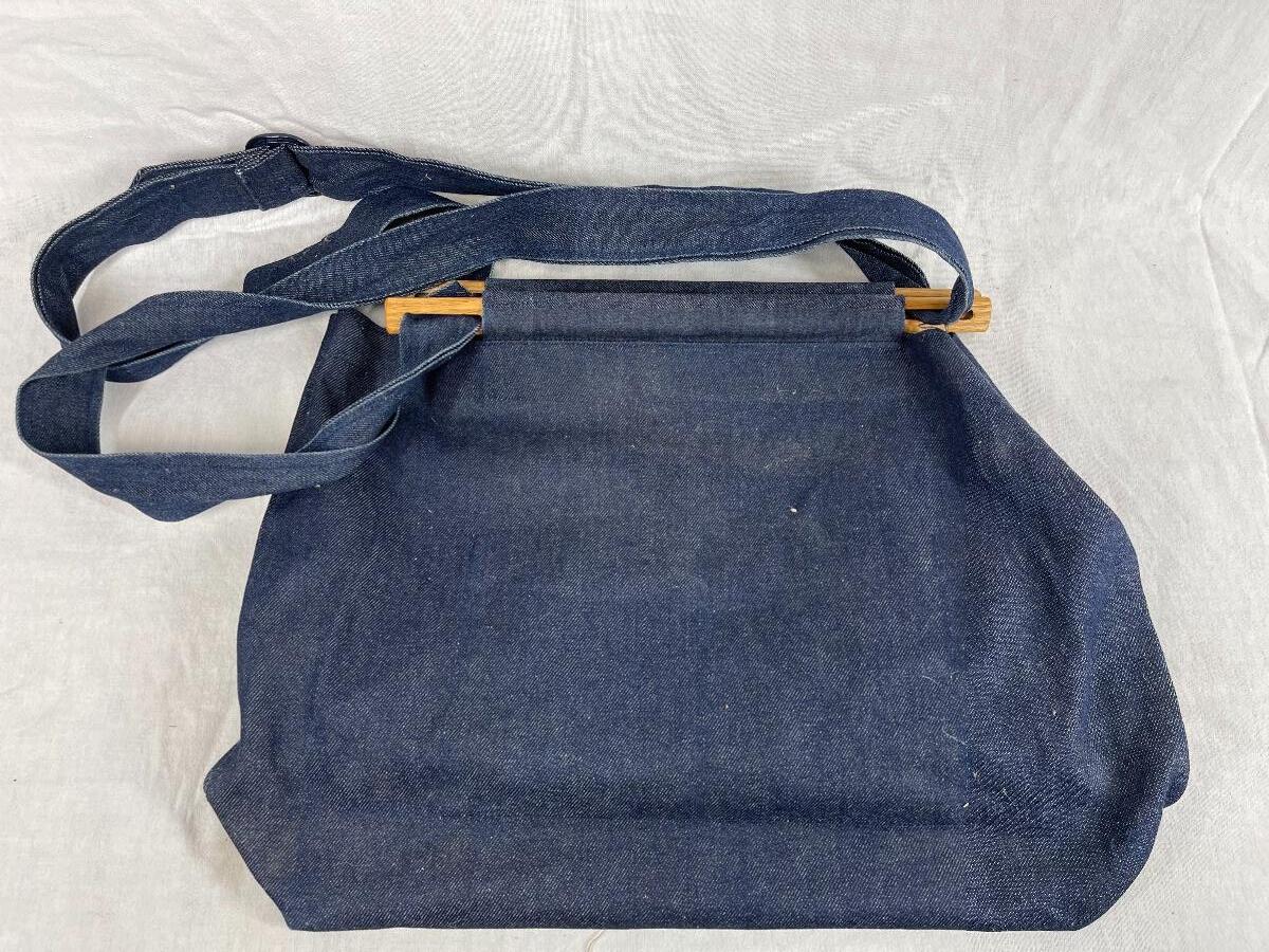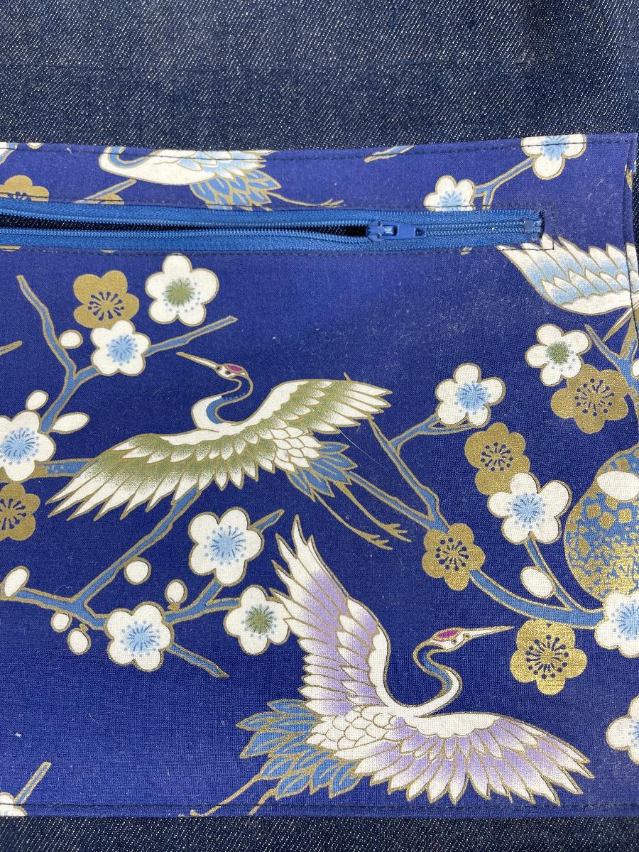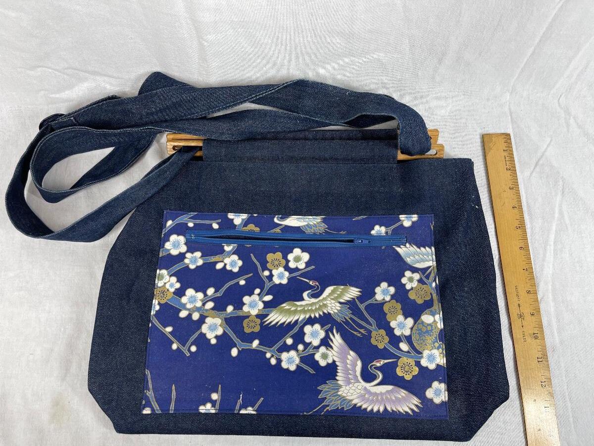 Cranes and flowers denim and wood large shoulder bag