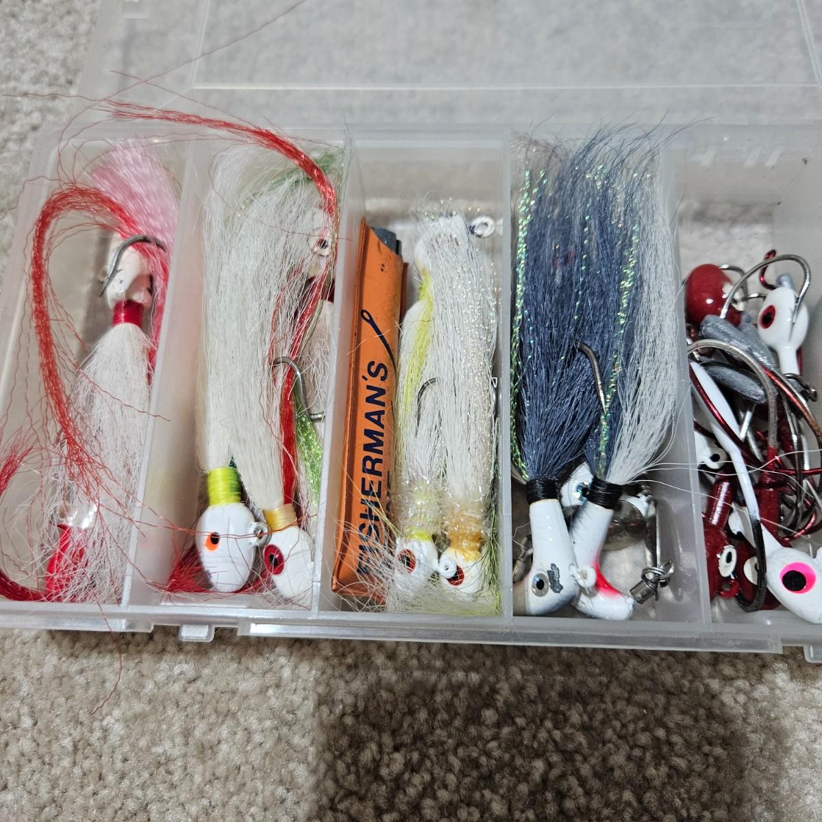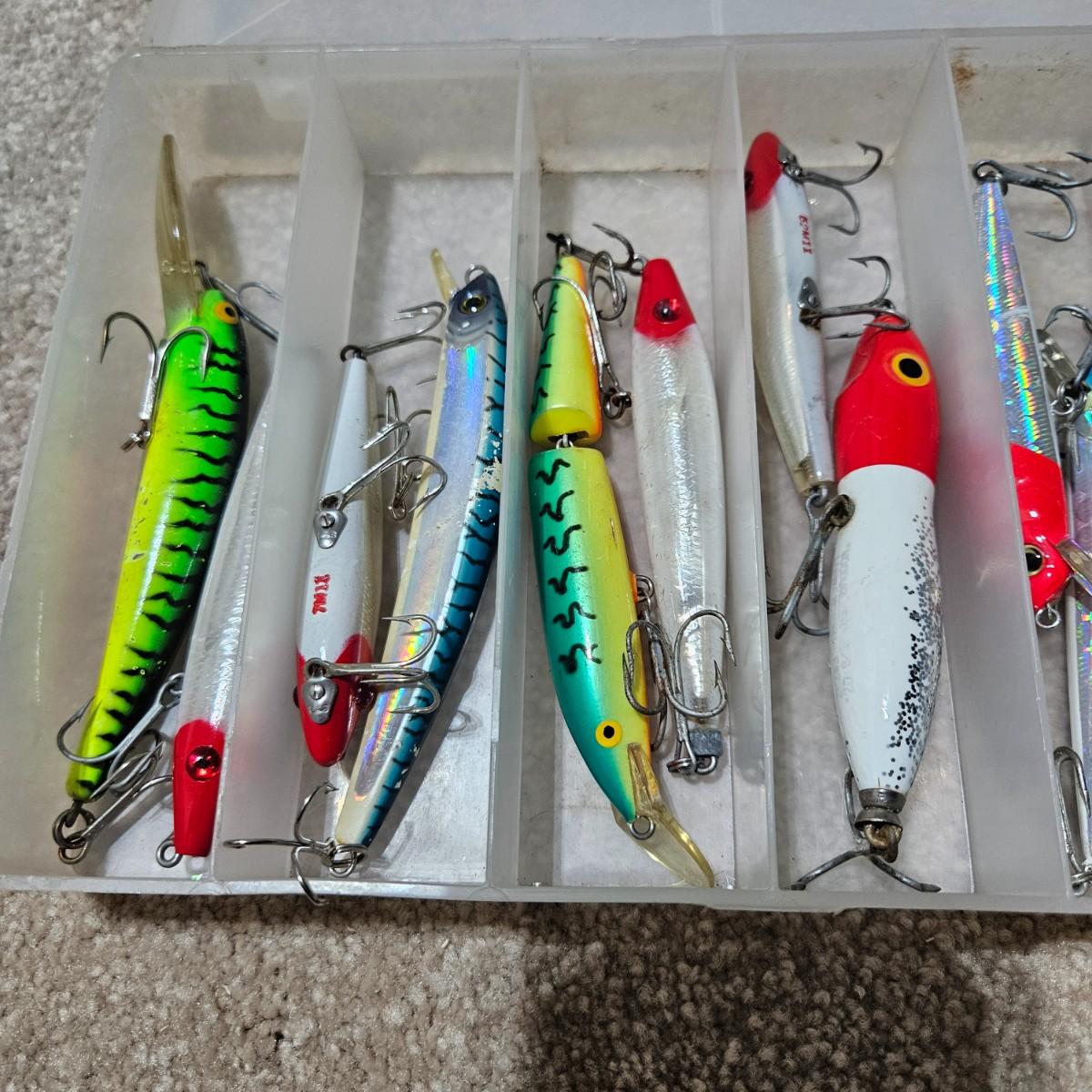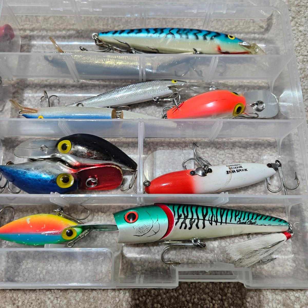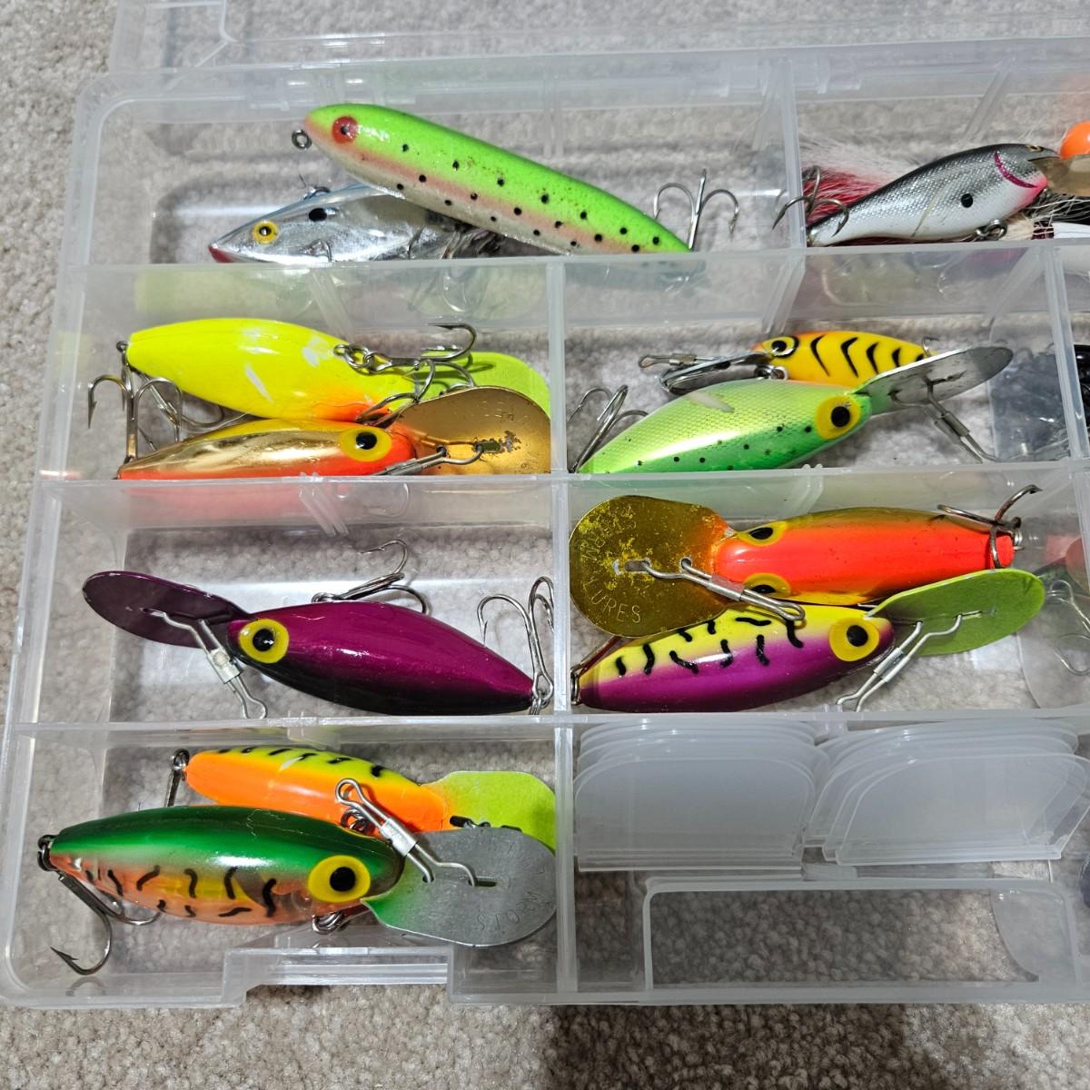 An assortment of crankbaits and tackle geared towards saltwater. Includes five boxes loaded with lipped and lip less cranbaits, topwater, custom tied jig heads and some terminal tackle. Tubs are included. Shipping available