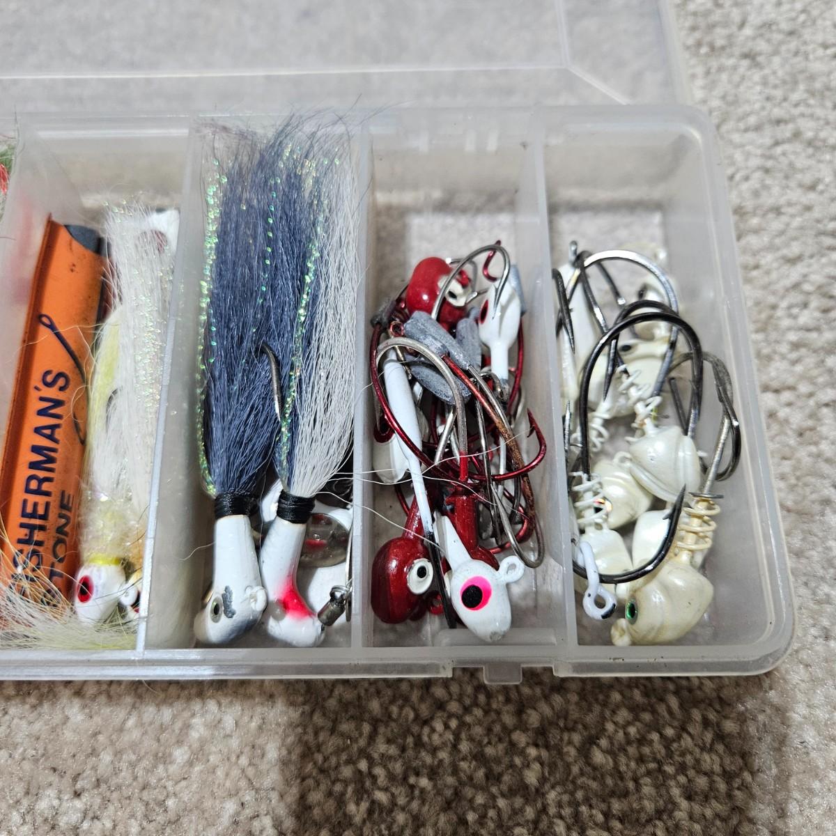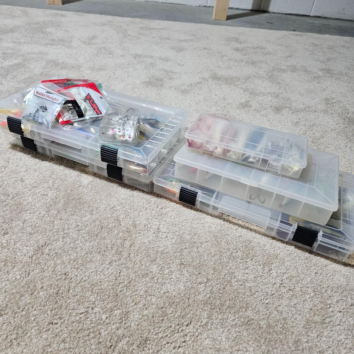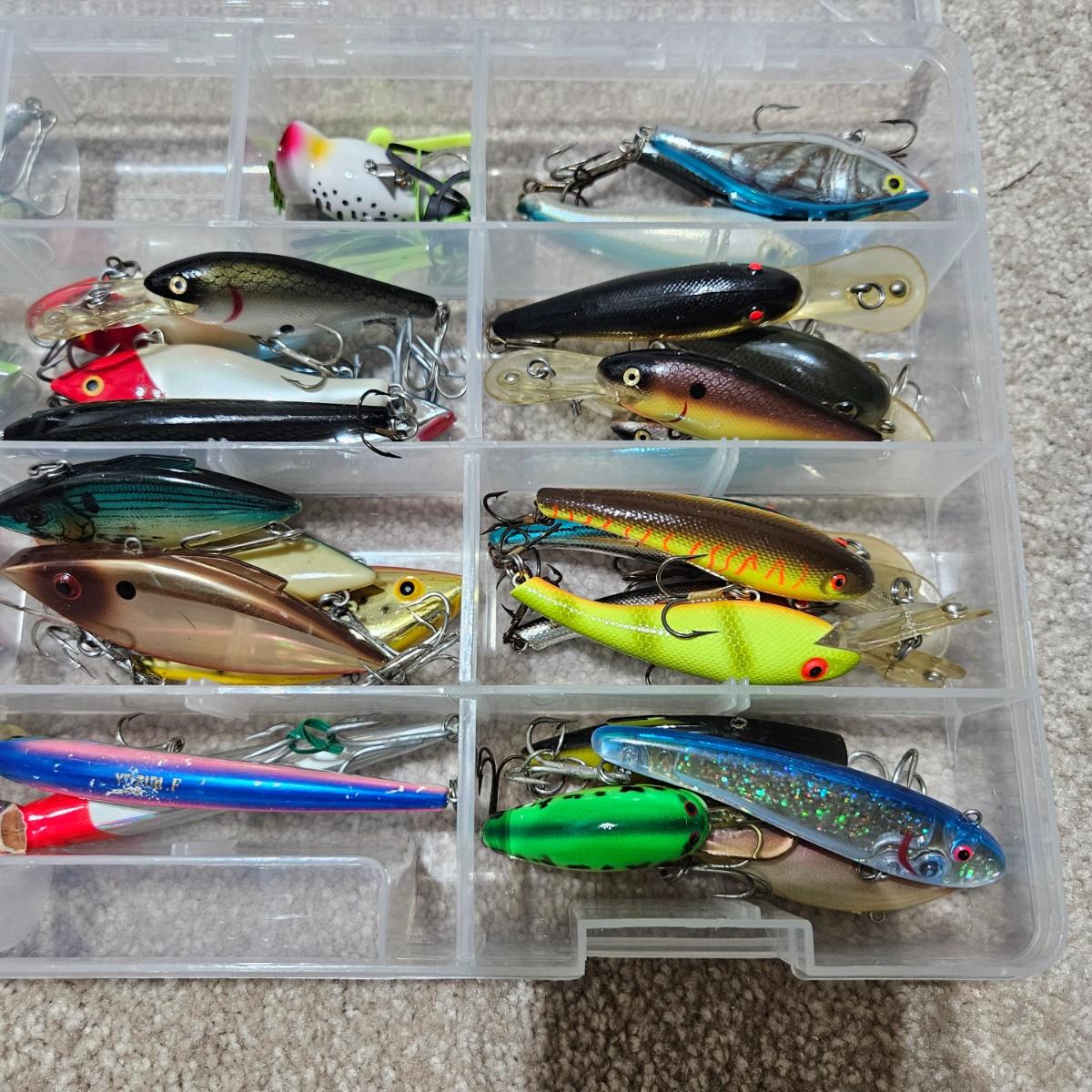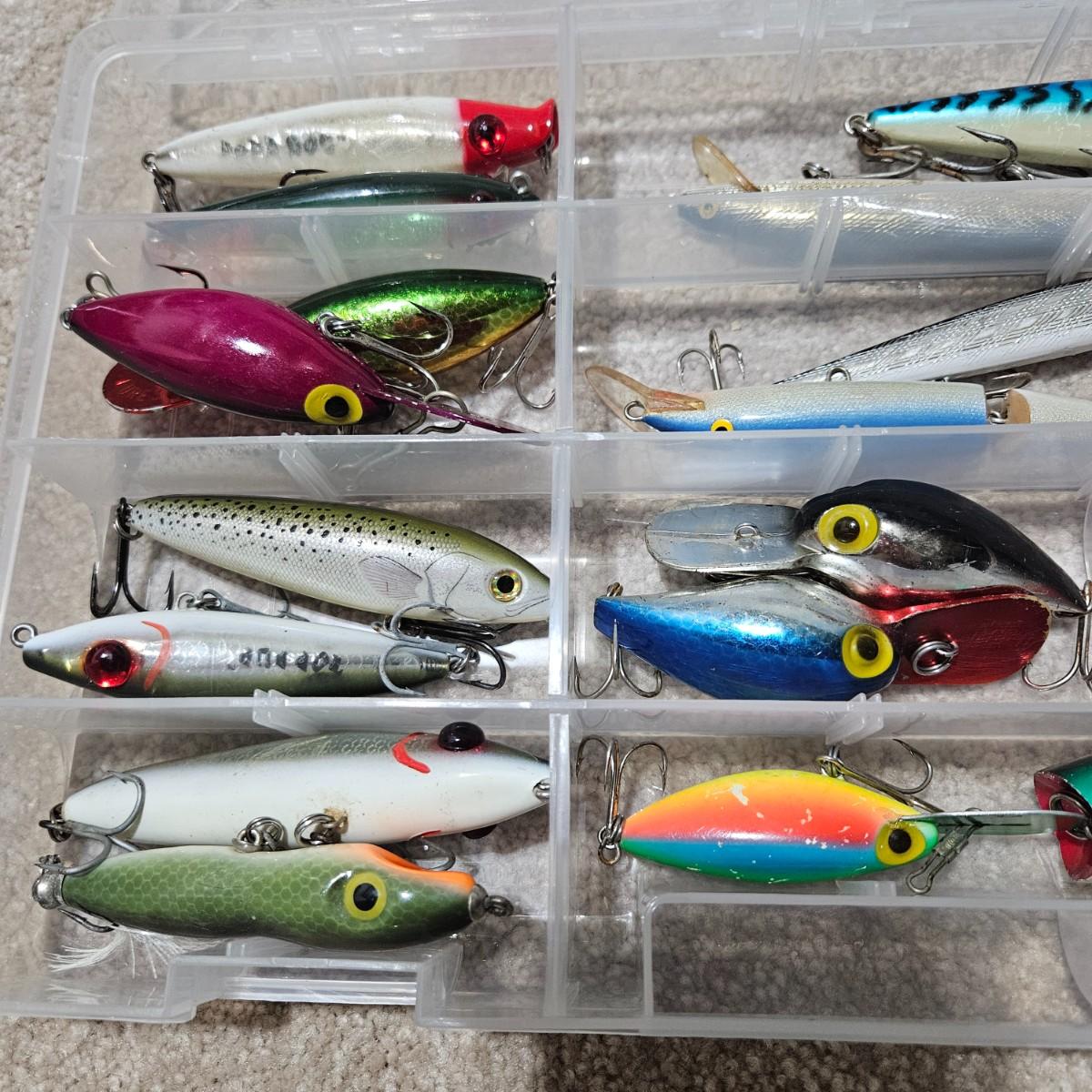 An assortment of crankbaits and tackle geared towards saltwater. Includes five boxes loaded with lipped and lip less cranbaits, topwater, custom tied jig heads and some terminal tackle. Tubs are included. Shipping available