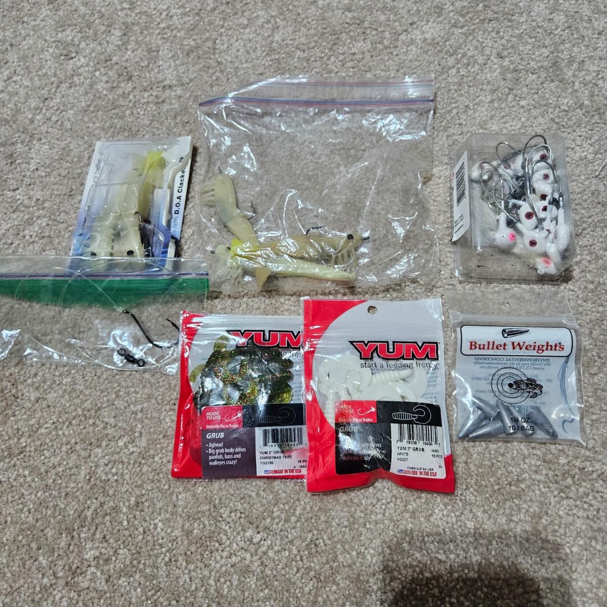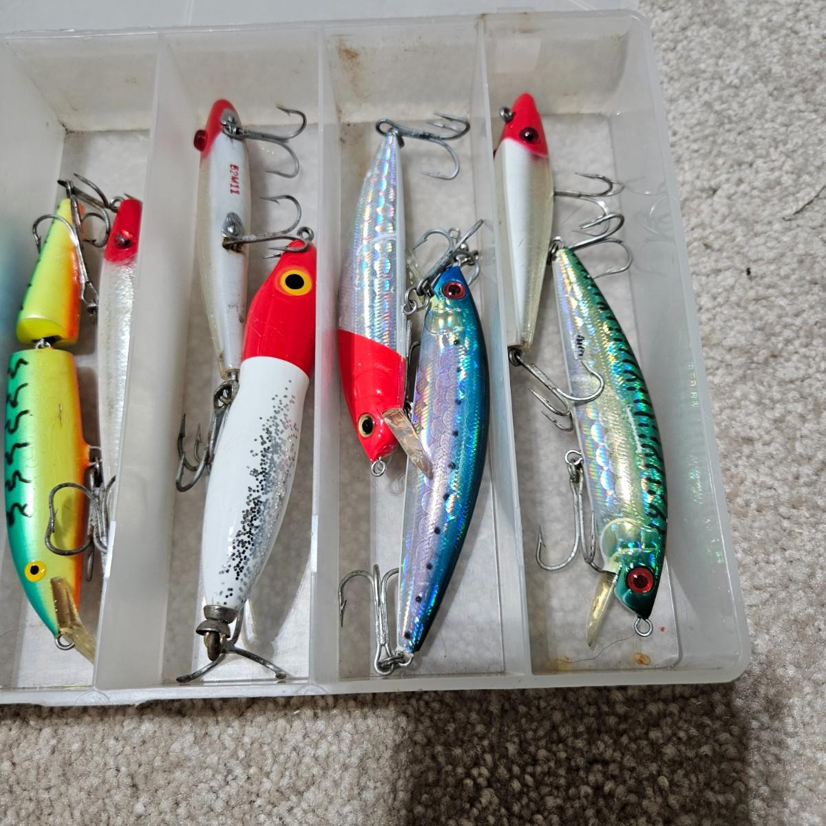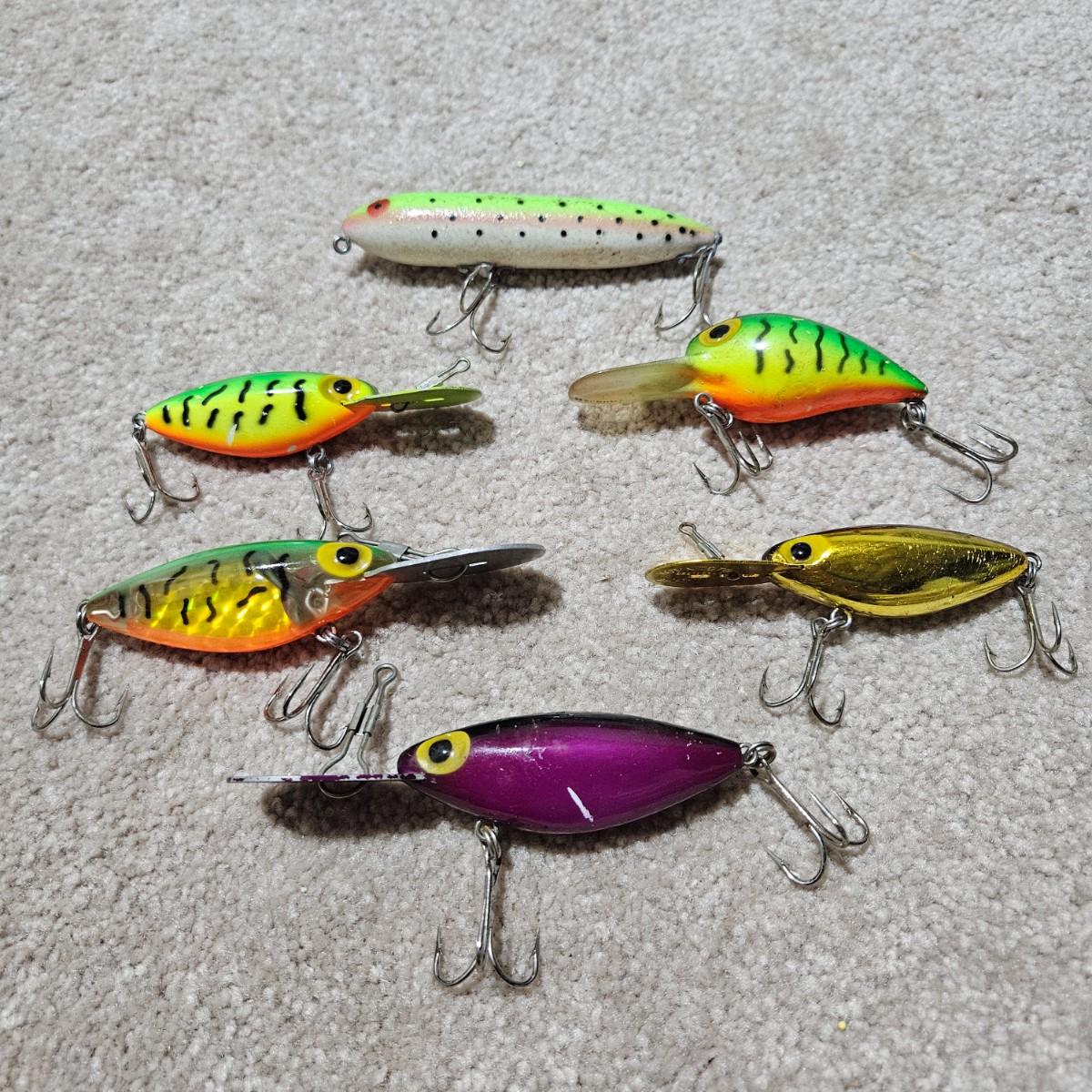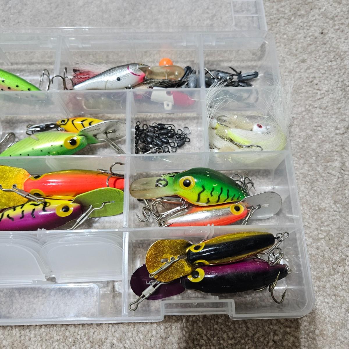 An assortment of crankbaits and tackle geared towards saltwater. Includes five boxes loaded with lipped and lip less cranbaits, topwater, custom tied jig heads and some terminal tackle. Tubs are included. Shipping available
