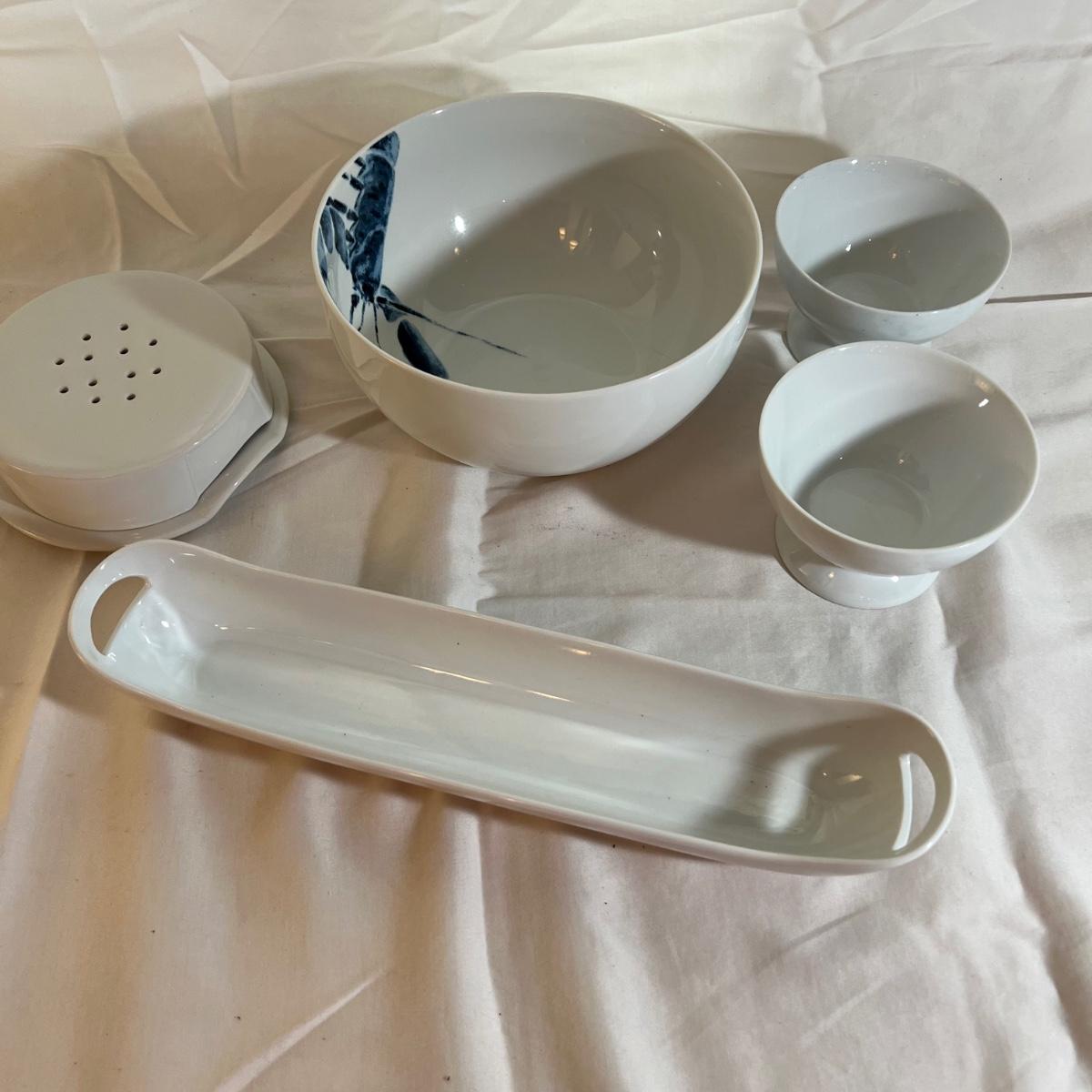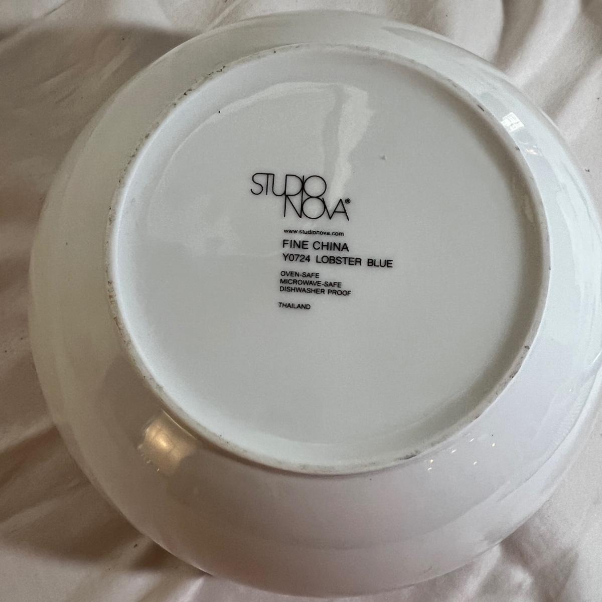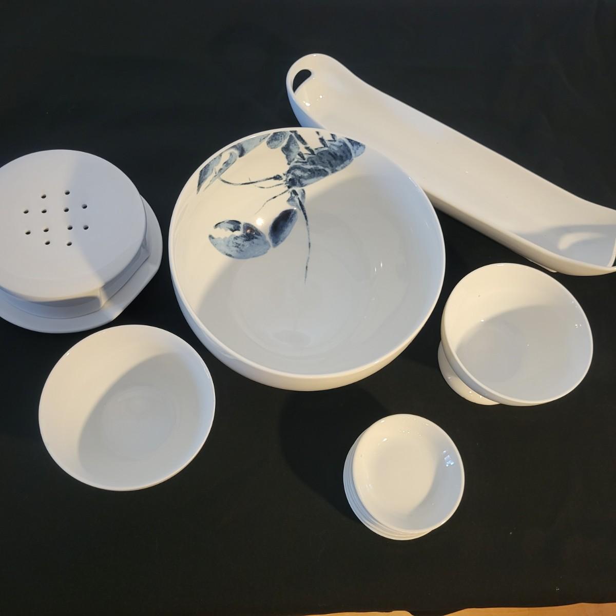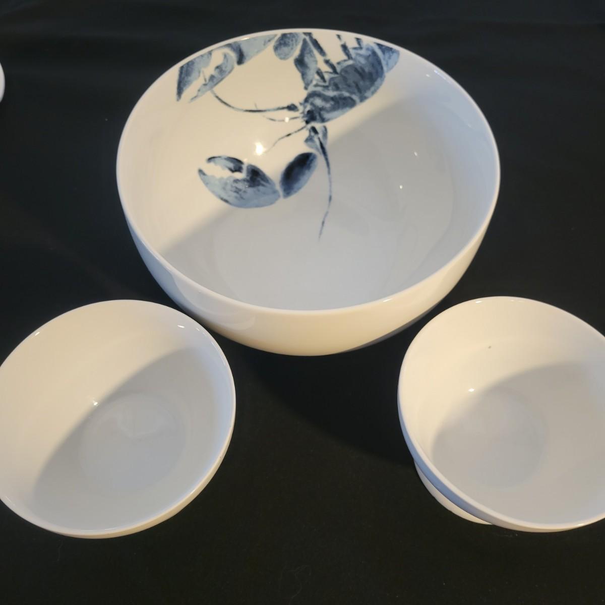 Two Crate and Barrel porcelain serving bowls. Each has evidence of very minor paint stains, as shown in pictures. One Crate and Barrel two-piece lidded dish and a Crate and Barrel 16" appetizer dish. Large Studio Nova "Lobster Blue" China bowl measuring 9.25” in diameter and 4.75” tall. Also five small round serving dishes.