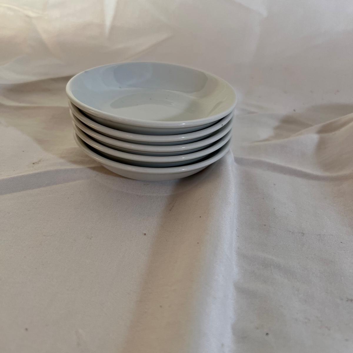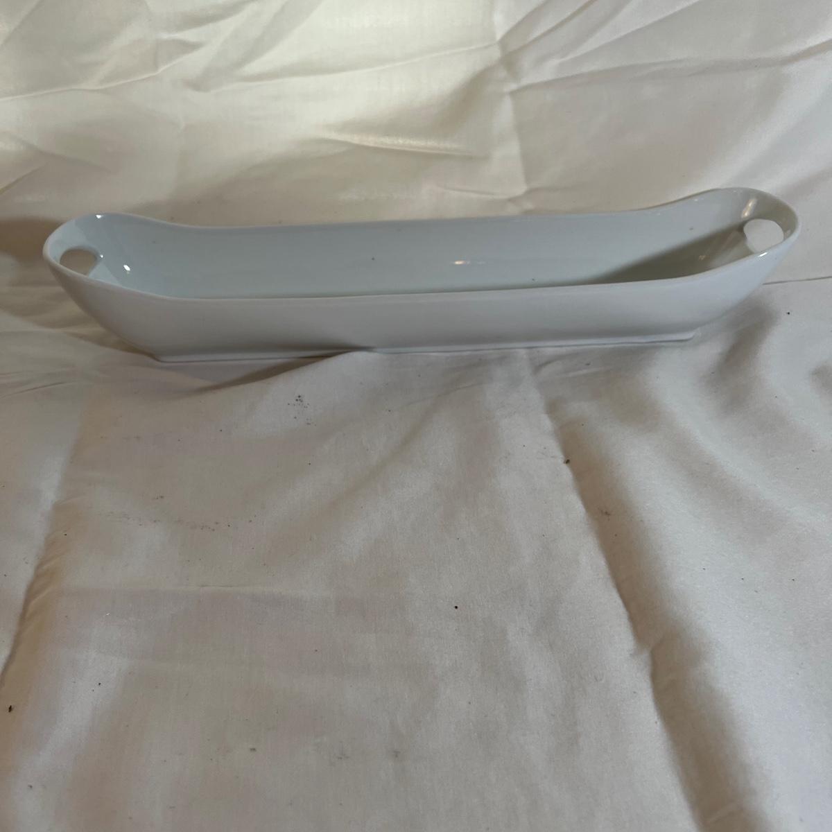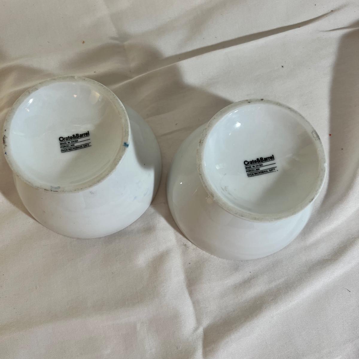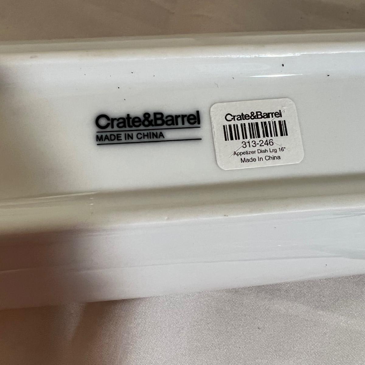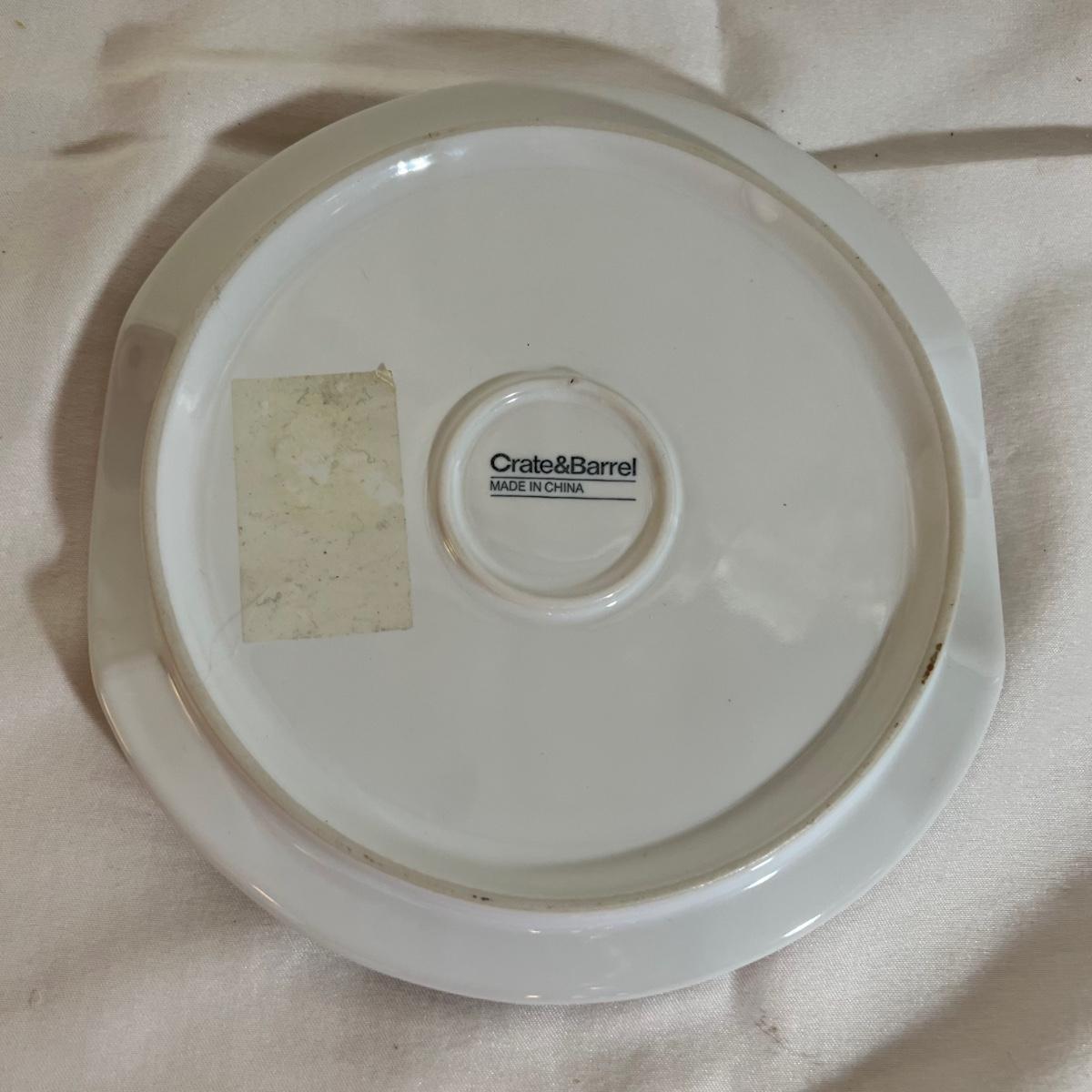 Two Crate and Barrel porcelain serving bowls. Each has evidence of very minor paint stains, as shown in pictures. One Crate and Barrel two-piece lidded dish and a Crate and Barrel 16" appetizer dish. Large Studio Nova "Lobster Blue" China bowl measuring 9.25” in diameter and 4.75” tall. Also five small round serving dishes.