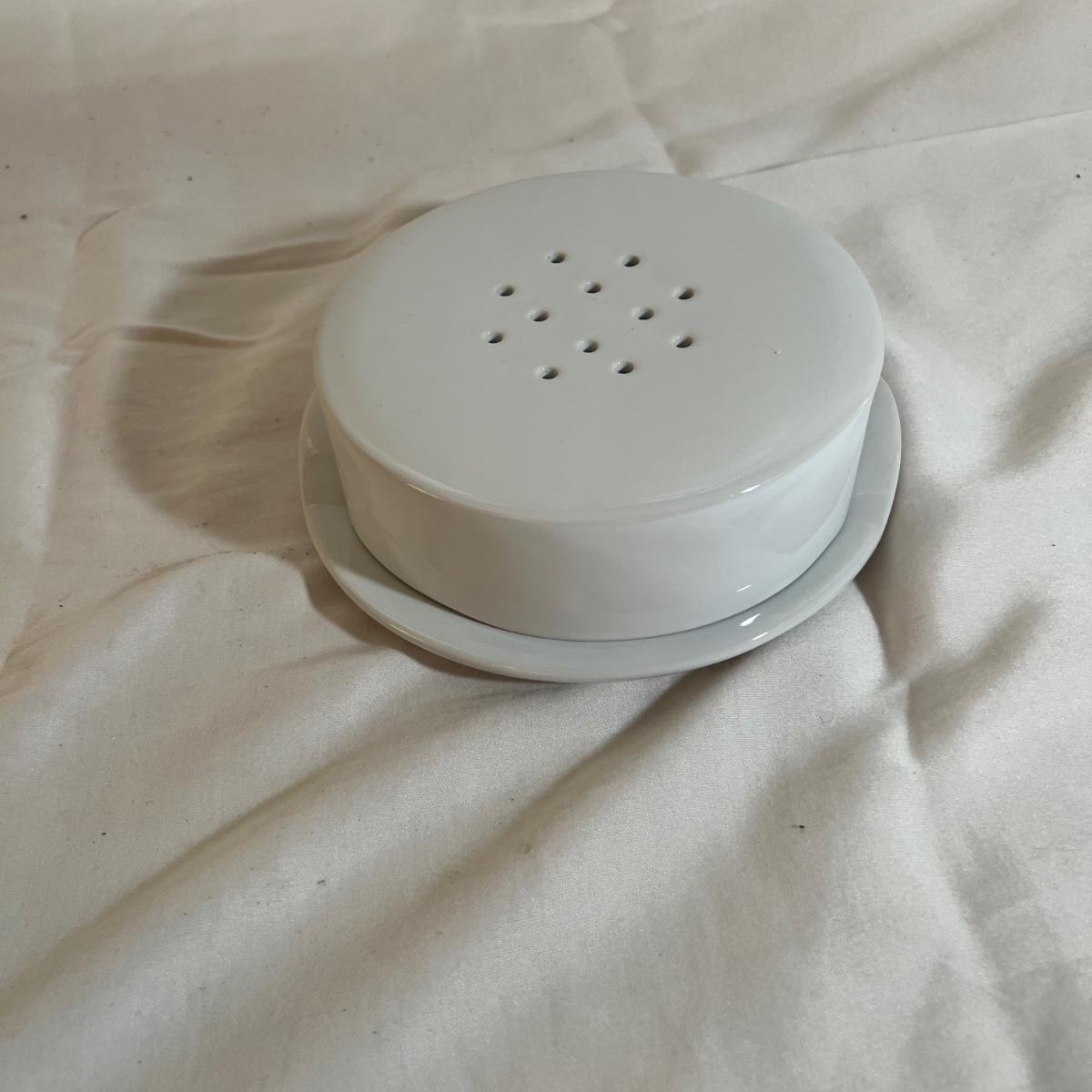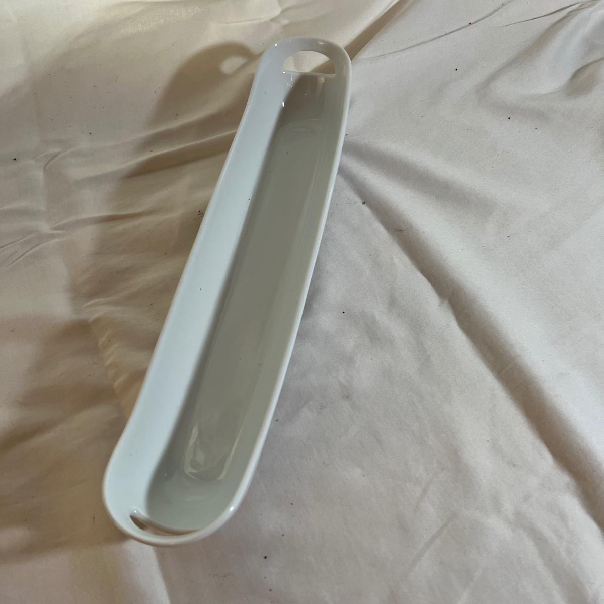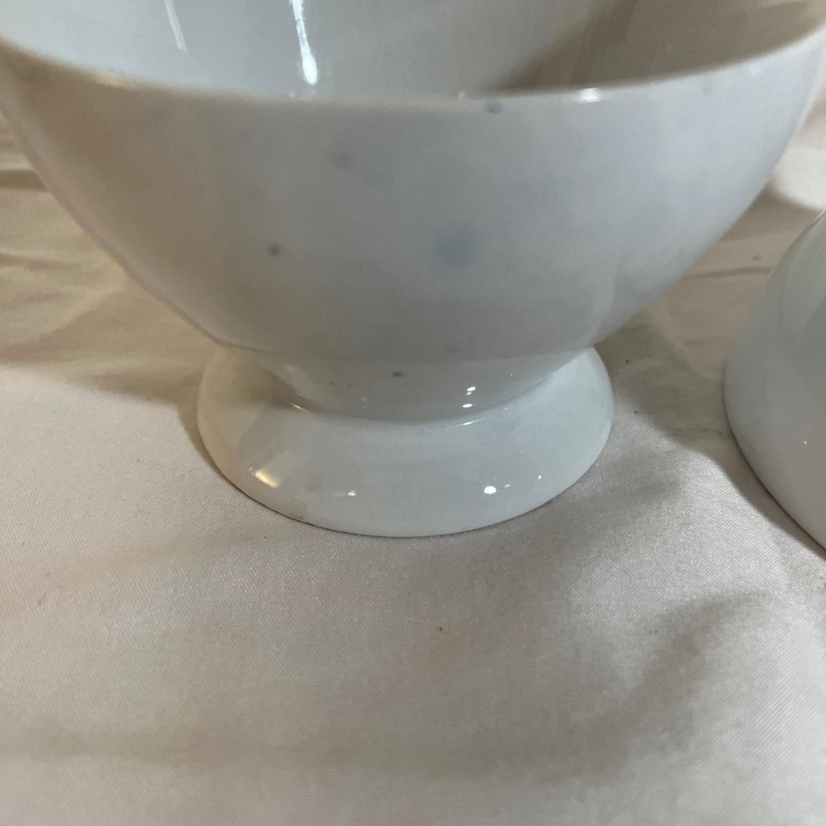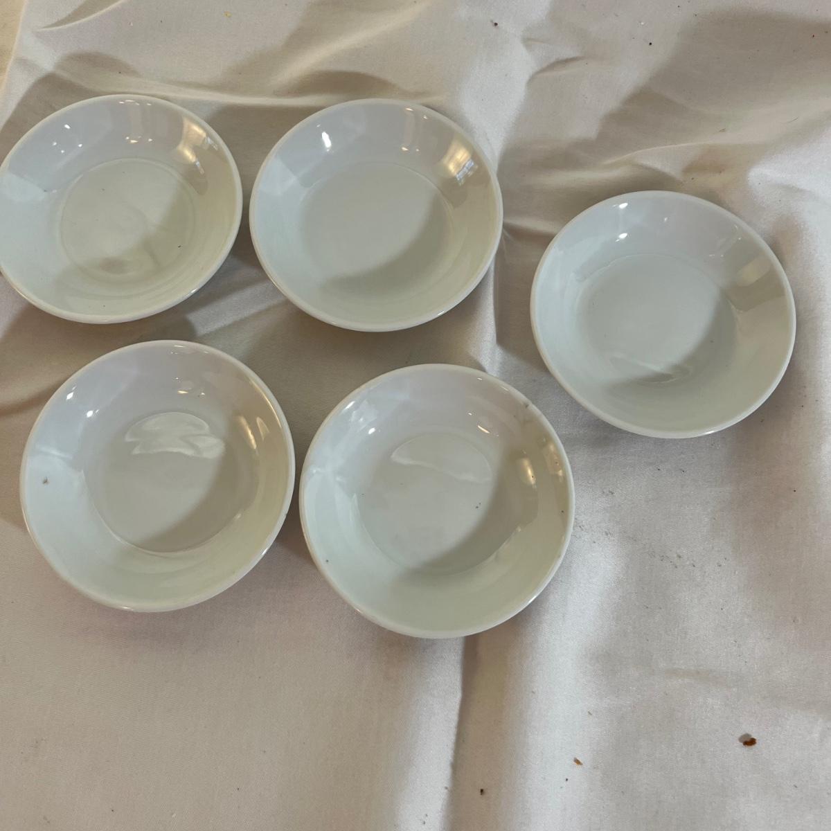 Two Crate and Barrel porcelain serving bowls. Each has evidence of very minor paint stains, as shown in pictures. One Crate and Barrel two-piece lidded dish and a Crate and Barrel 16" appetizer dish. Large Studio Nova "Lobster Blue" China bowl measuring 9.25” in diameter and 4.75” tall. Also five small round serving dishes.
