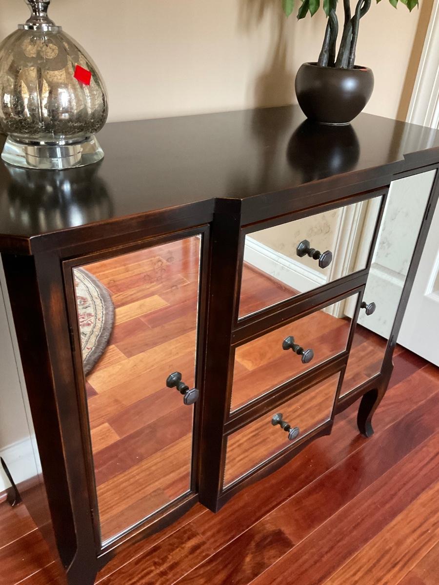 Mirror is antiqued, 35 1/2” wide 16 1/2” deep 31 1/2” high