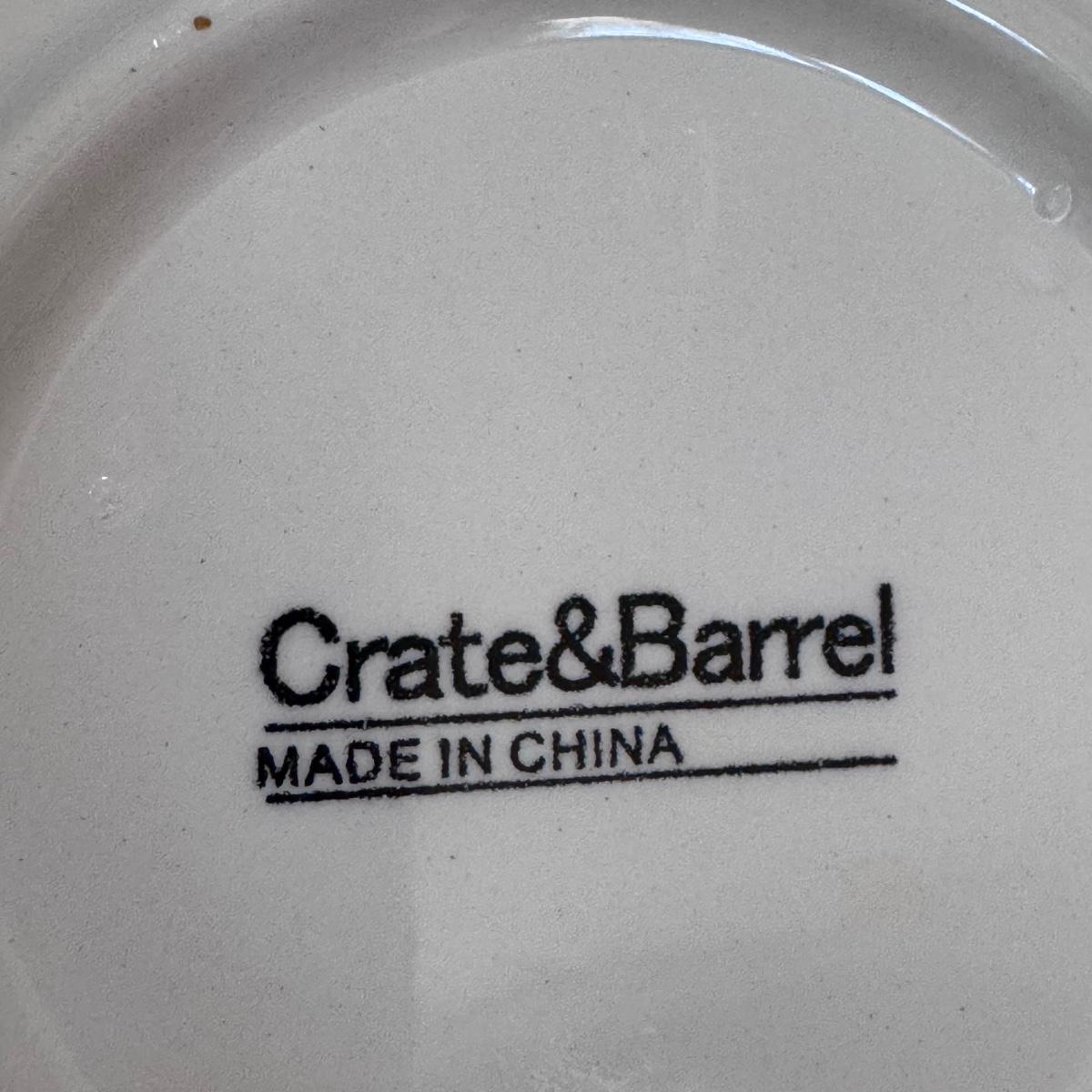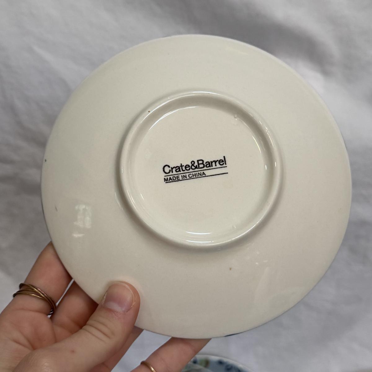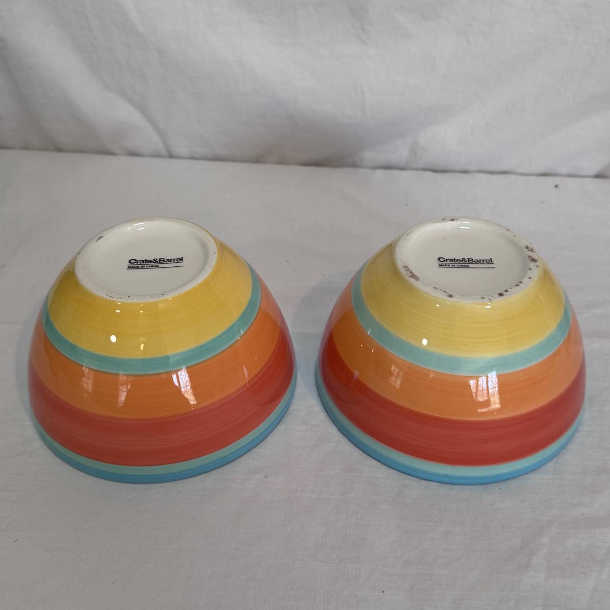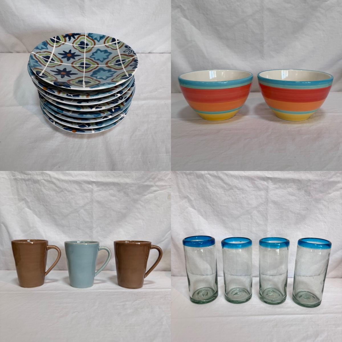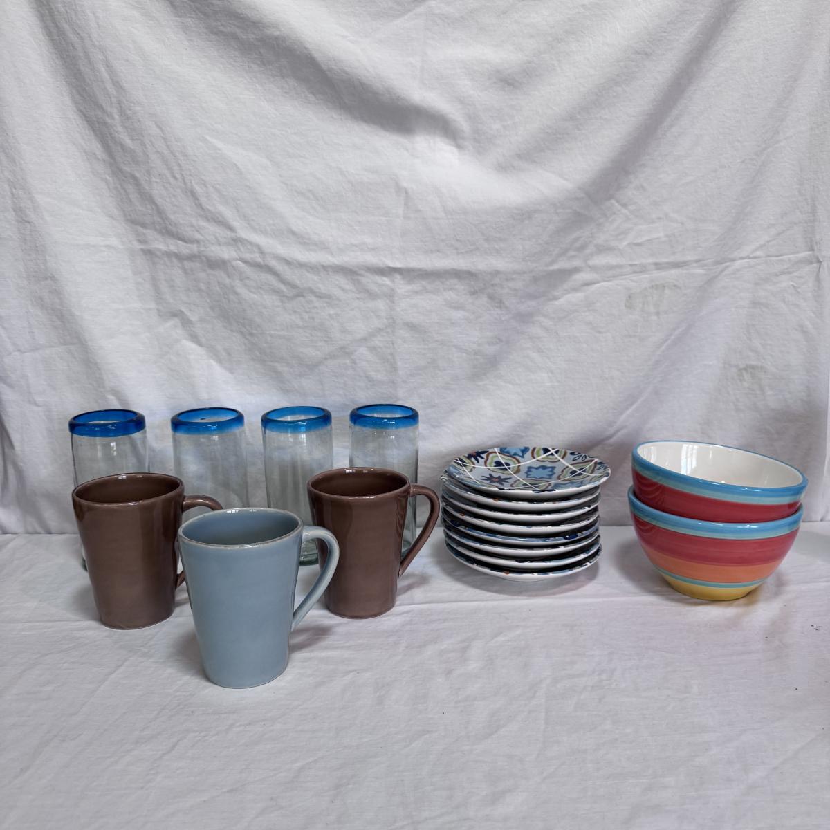 This lot includes eight Crate & Barrel small plates, two multi-colored striped bowls by Crate & Barrel, three mugs (two brown, one light blue) by Crate & Barrel, and four drinking glasses with tiny bubbles and blue rims. Two of the mugs are stamped with Crate & Barrel. The other mug appears to have been stamped, but it has since worn off. The small plates individually measure 6” x 1.5”H. Shipping available.